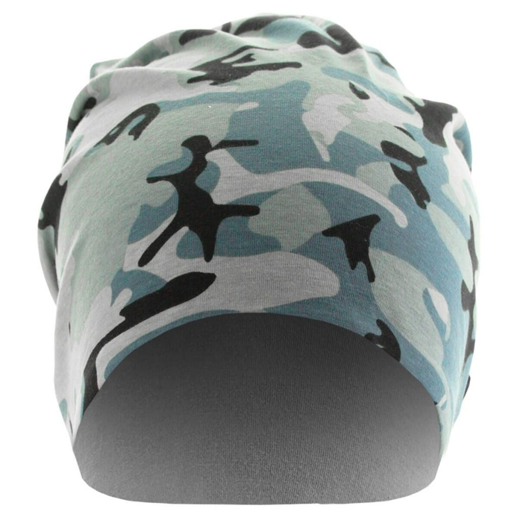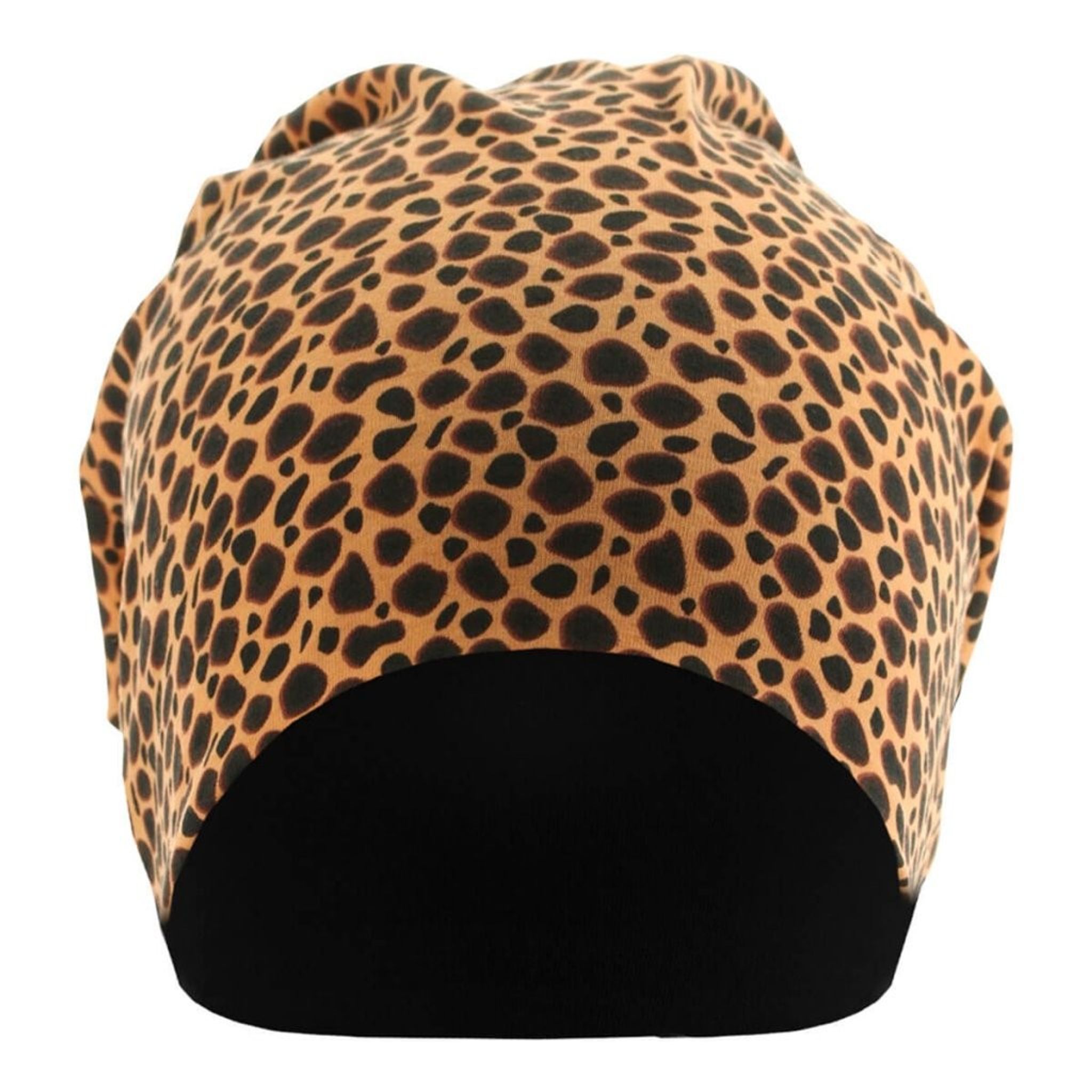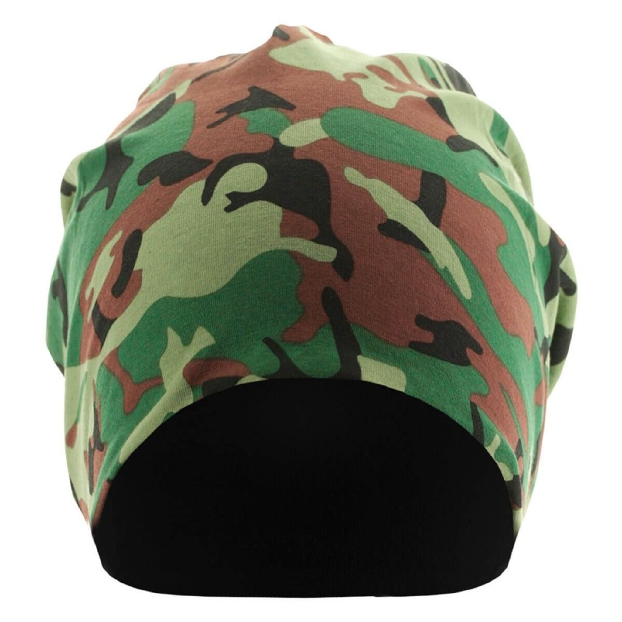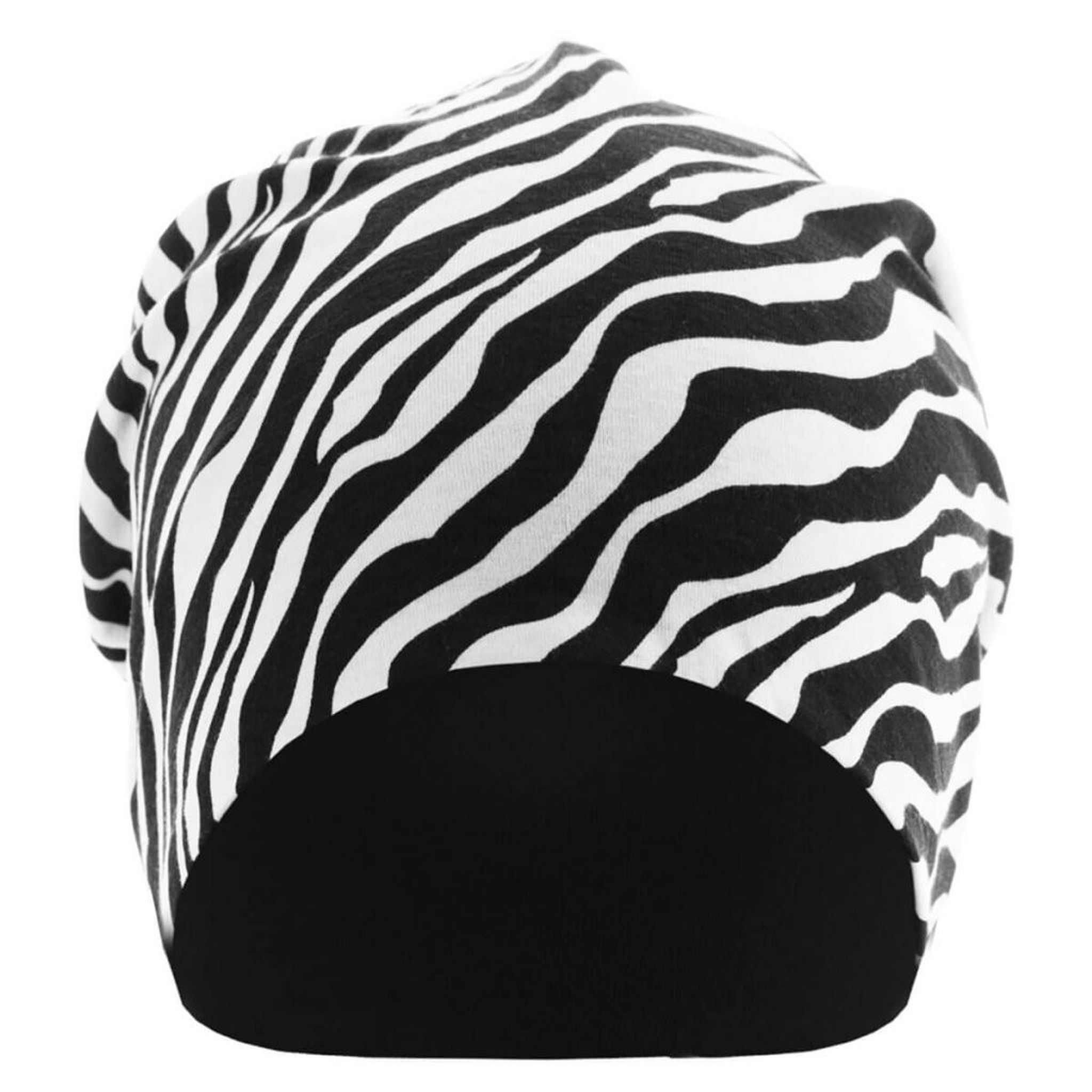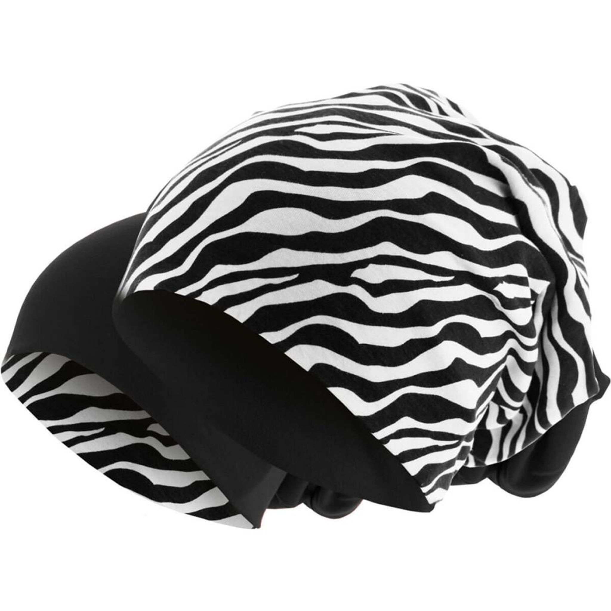 En lång mössa med en tryckt sida och en helsvart eller grå sida.