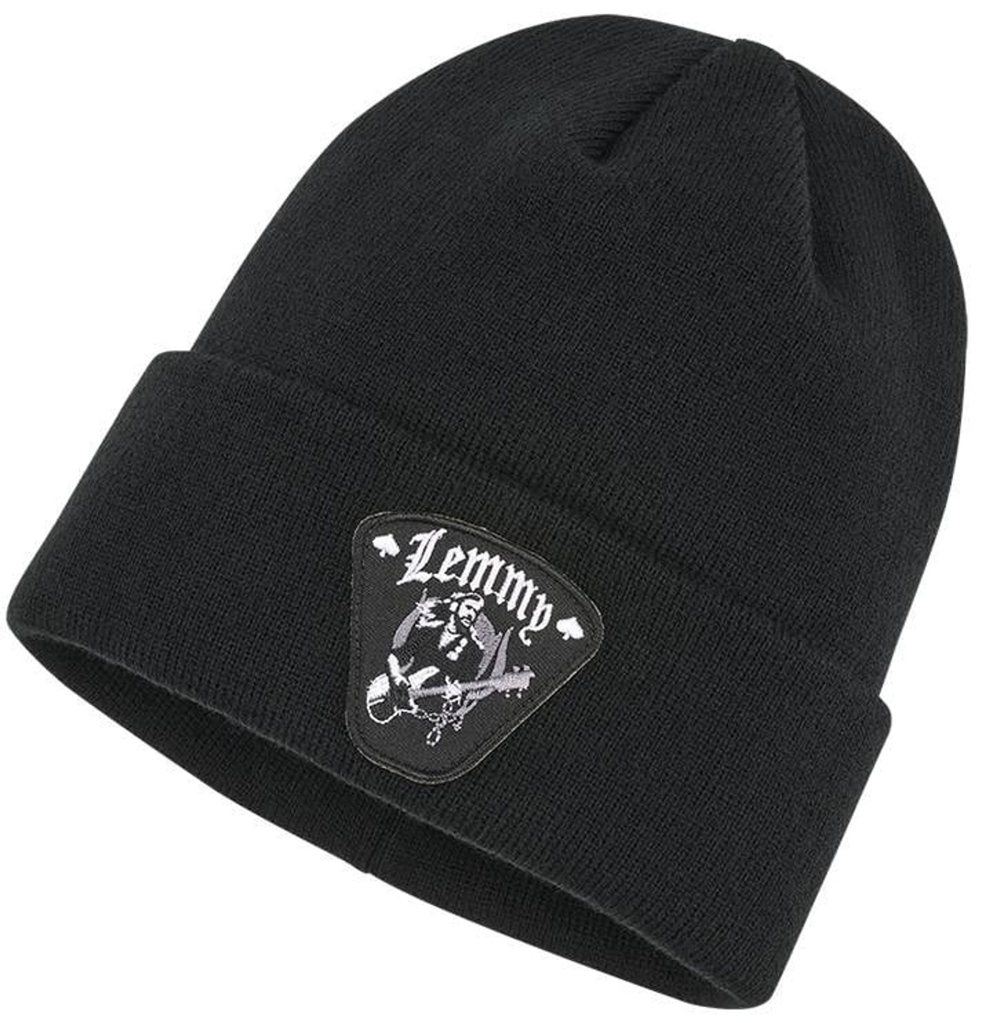 En varm og hyggelig finstrikket hue med klippeguden Lemmy broderet på en lap på huens foldede kant.