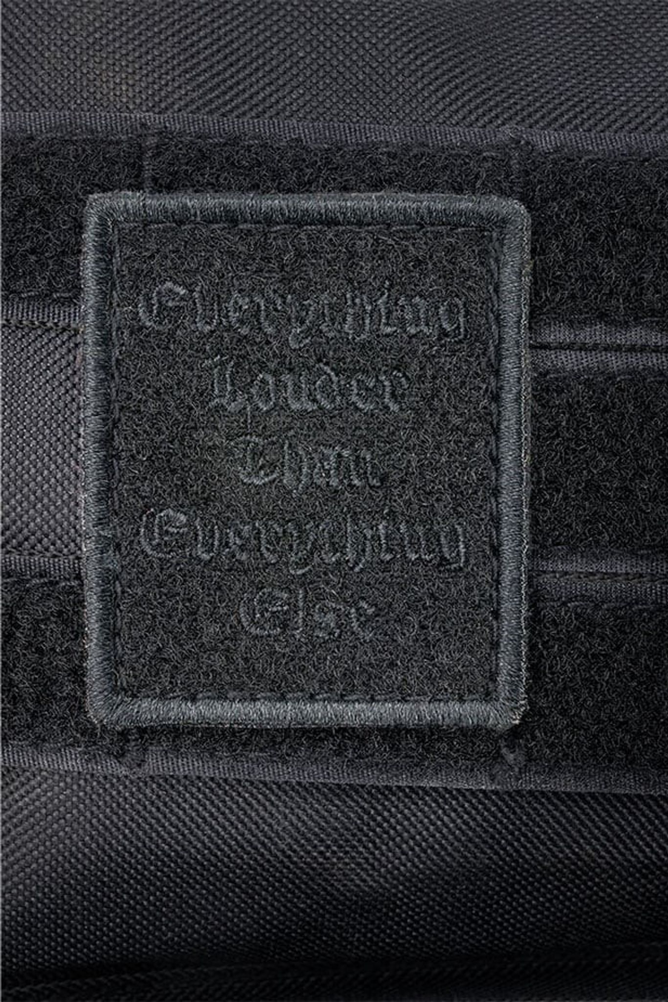 Der er to lapper på velcrobåndene i det øverste forreste rum. Den ene med teksten Everything Louder Than Everything Else og den anden med Warpig broderet i sort. Som en lille ekstra detalje er Motörheads logo trykt på bagsiden af rygsækken.