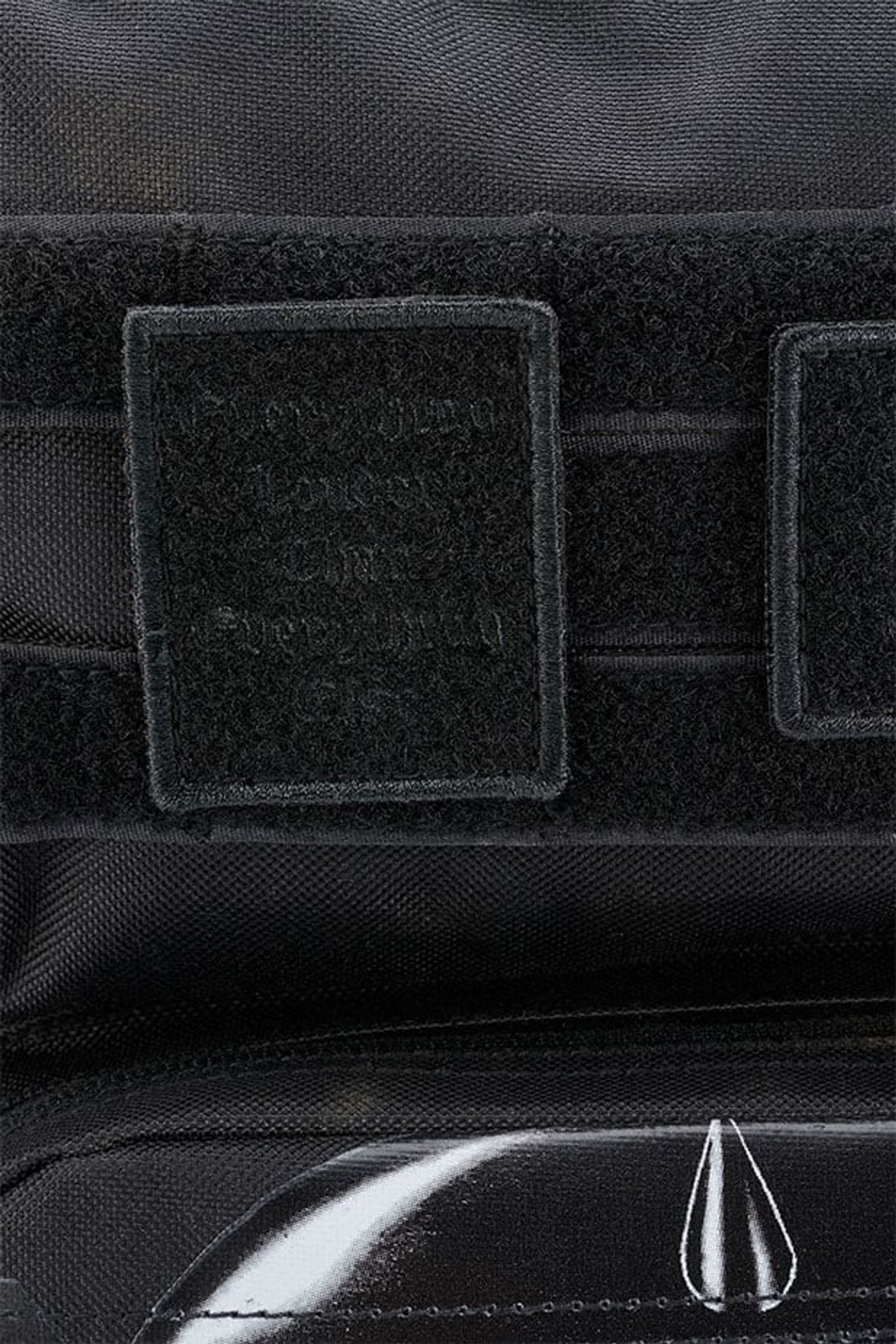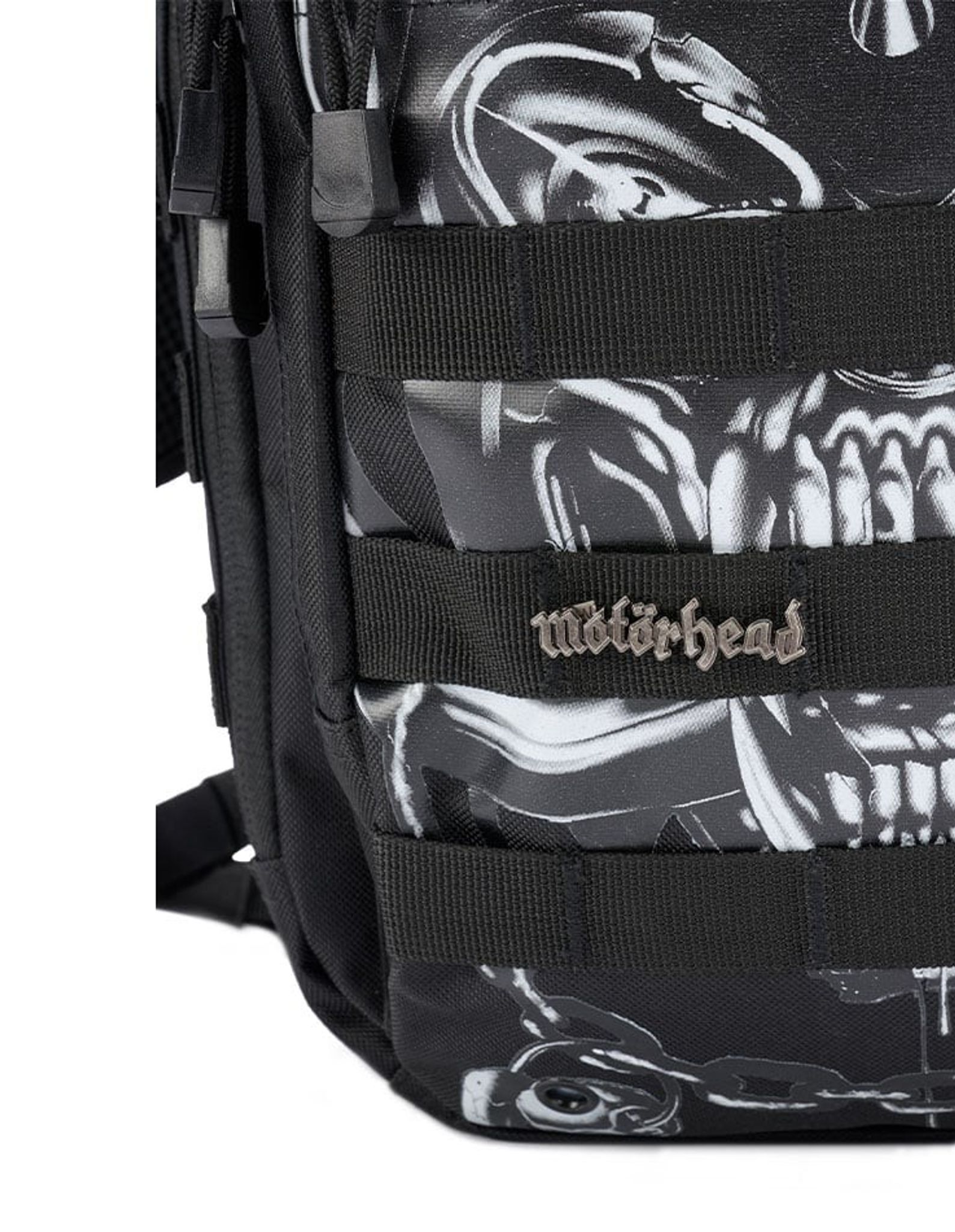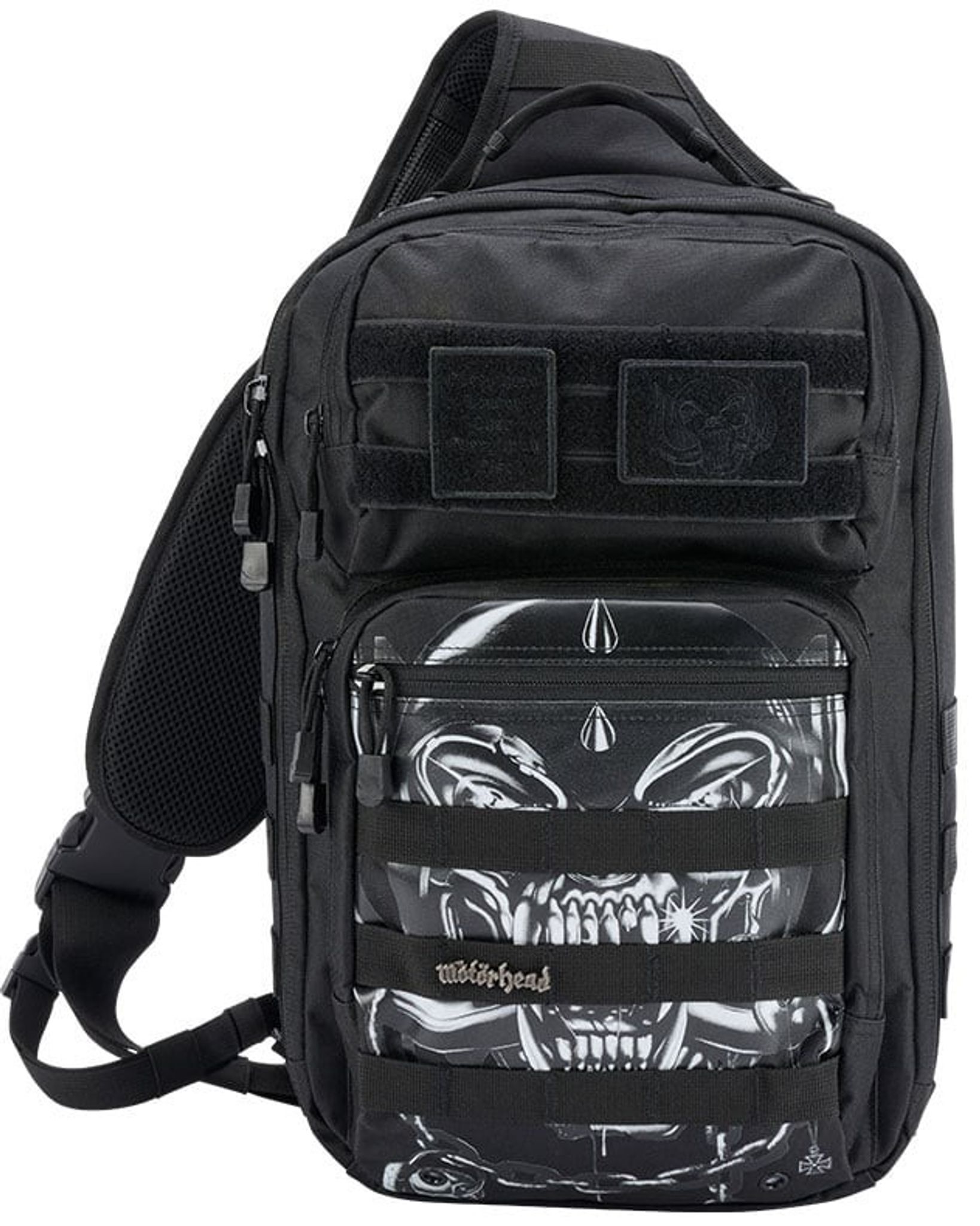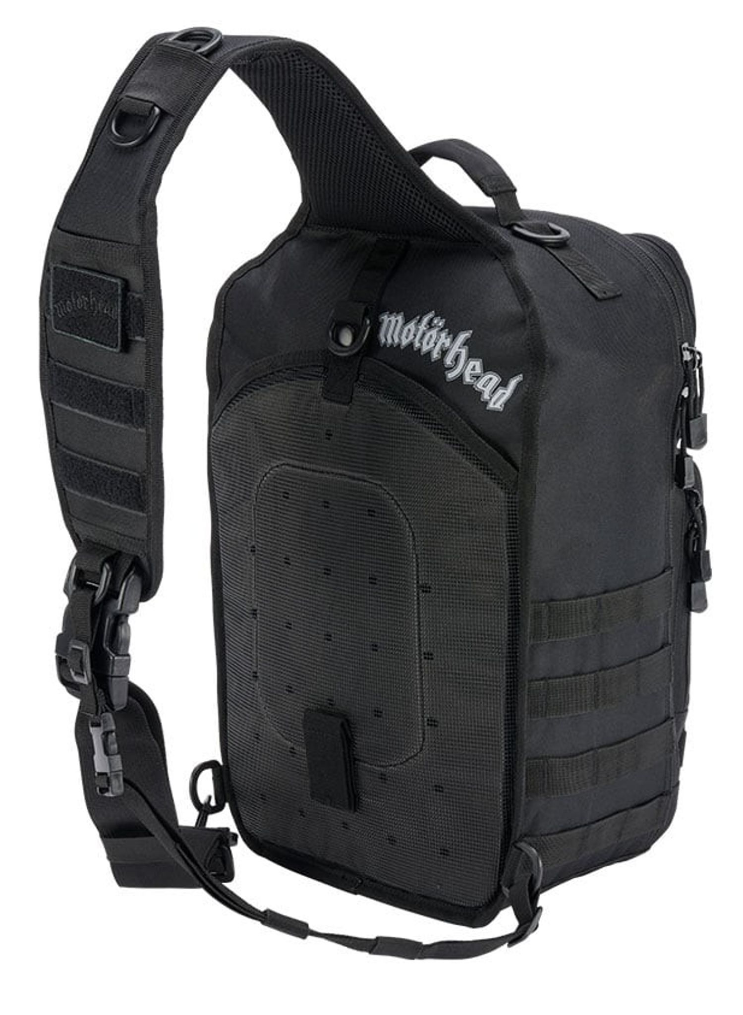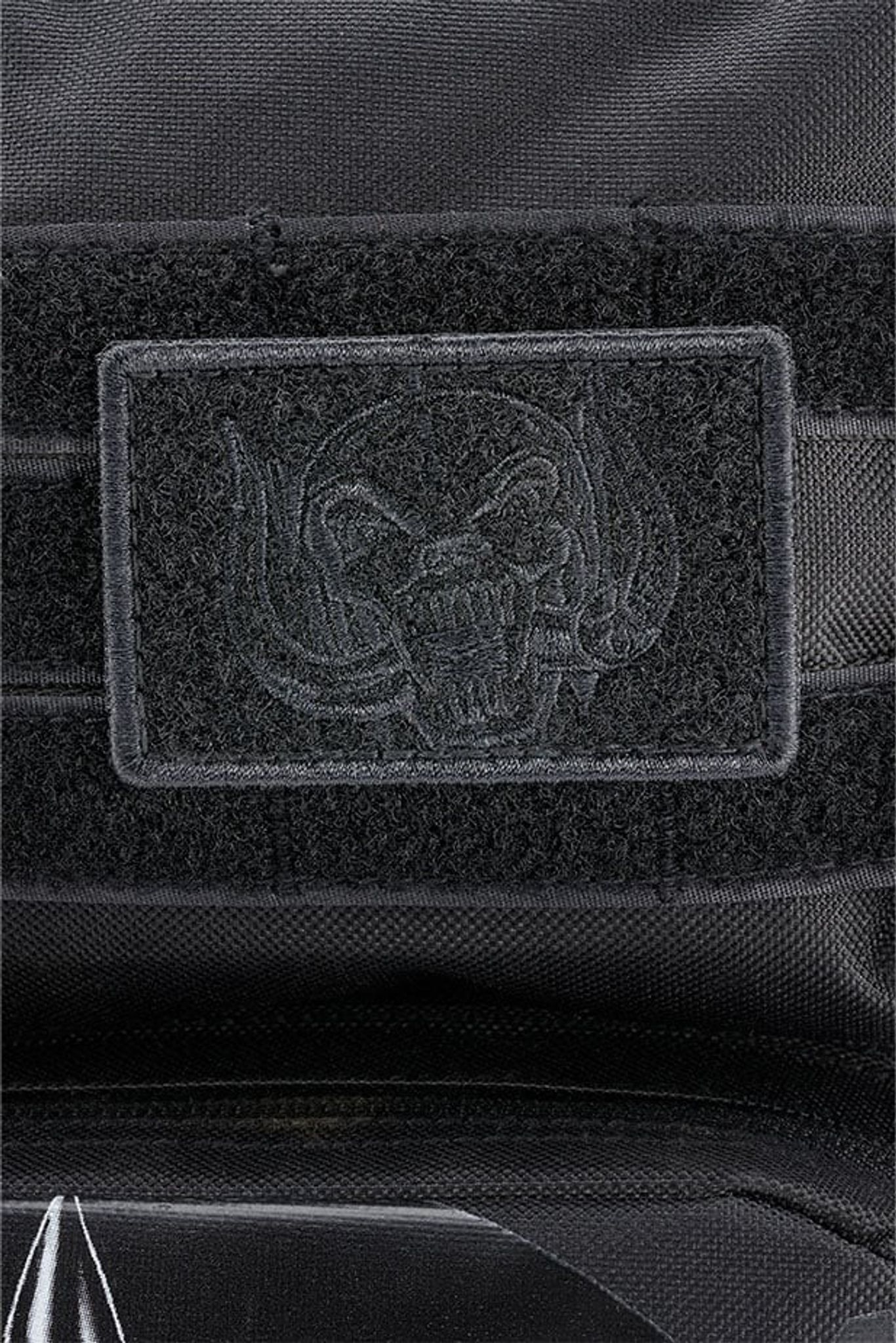 En Motorhead -udgave af Brandits praktiske og stilfulde amerikanske Cooper -rygsæk med slyngestrop. Her kan du se Motörheads klassiske warpig bag molleløkkerne på det forreste rum. På den ene løkke er også en aftagelig metalstift med Motörhead -logoet.