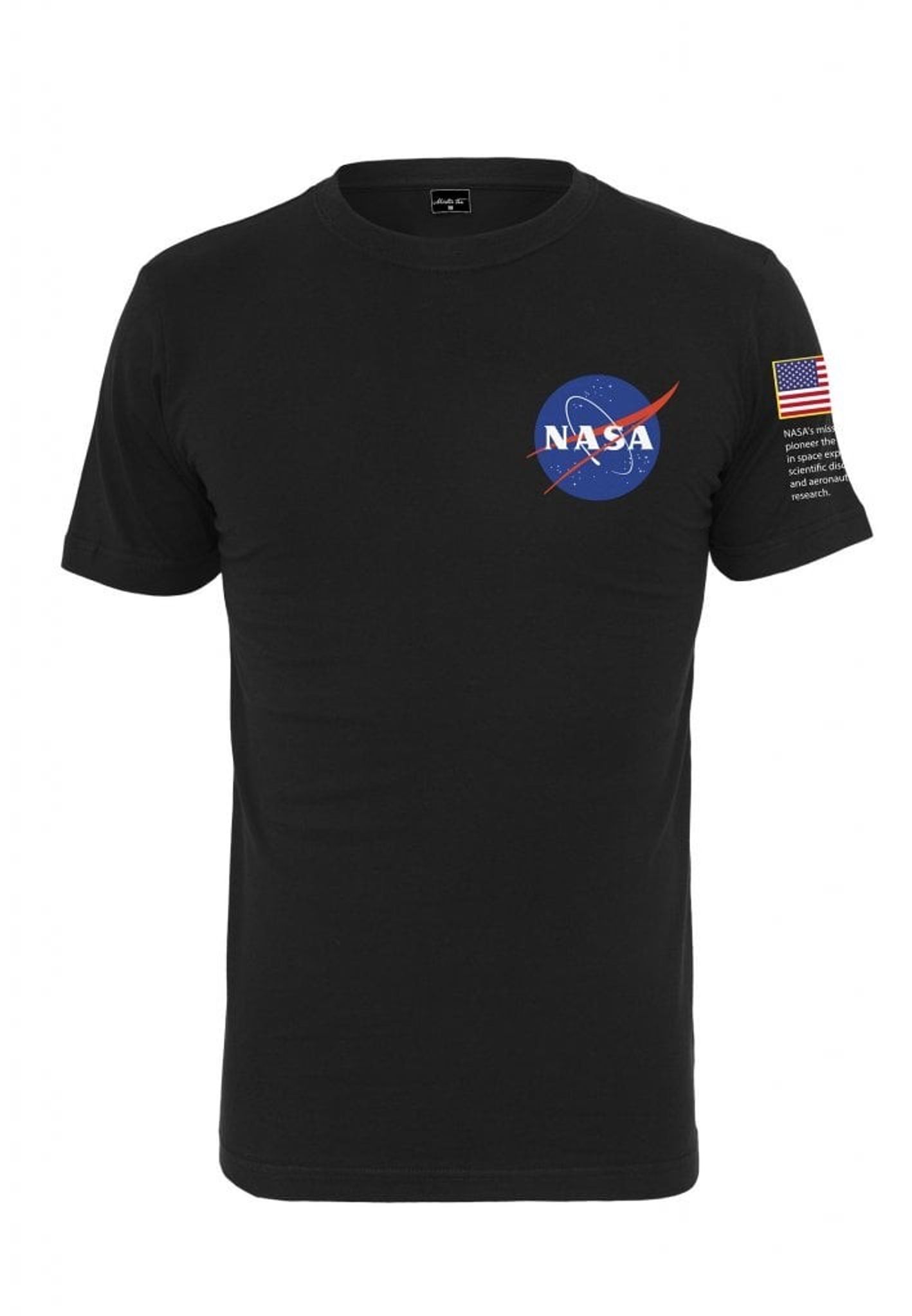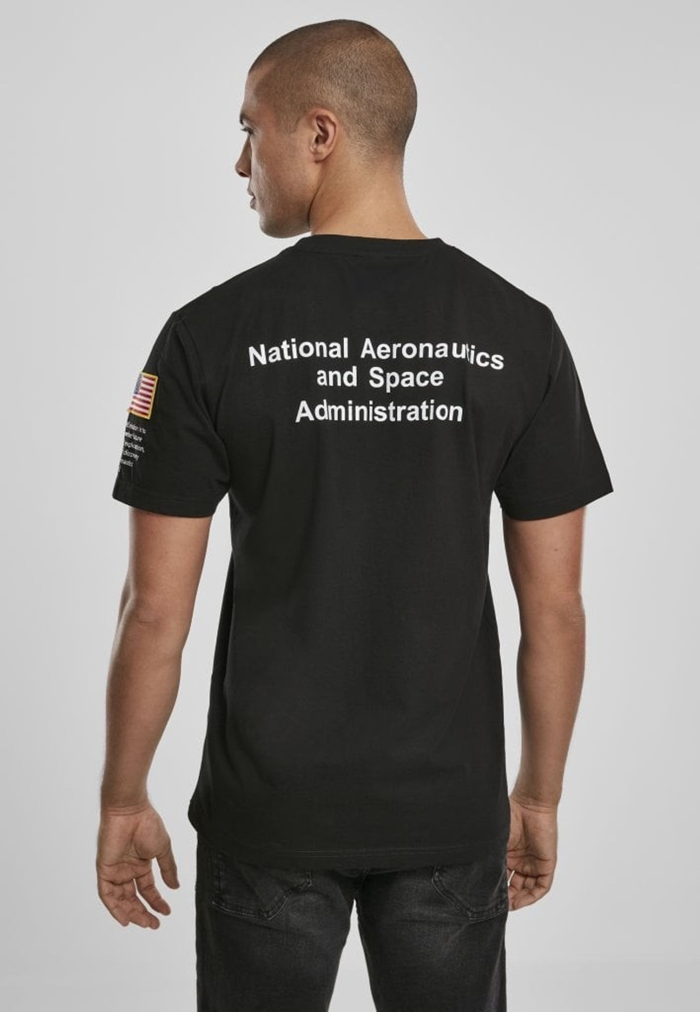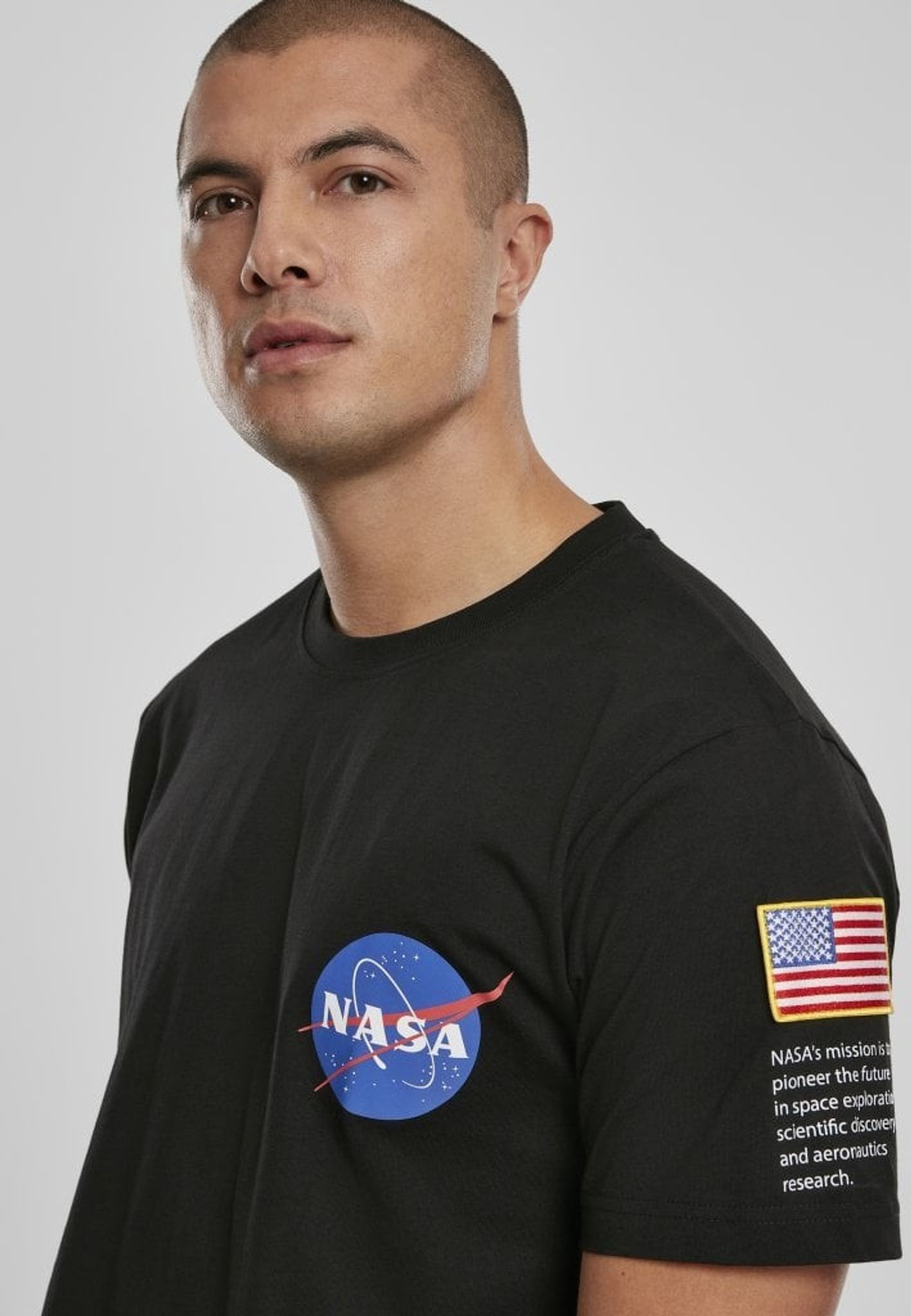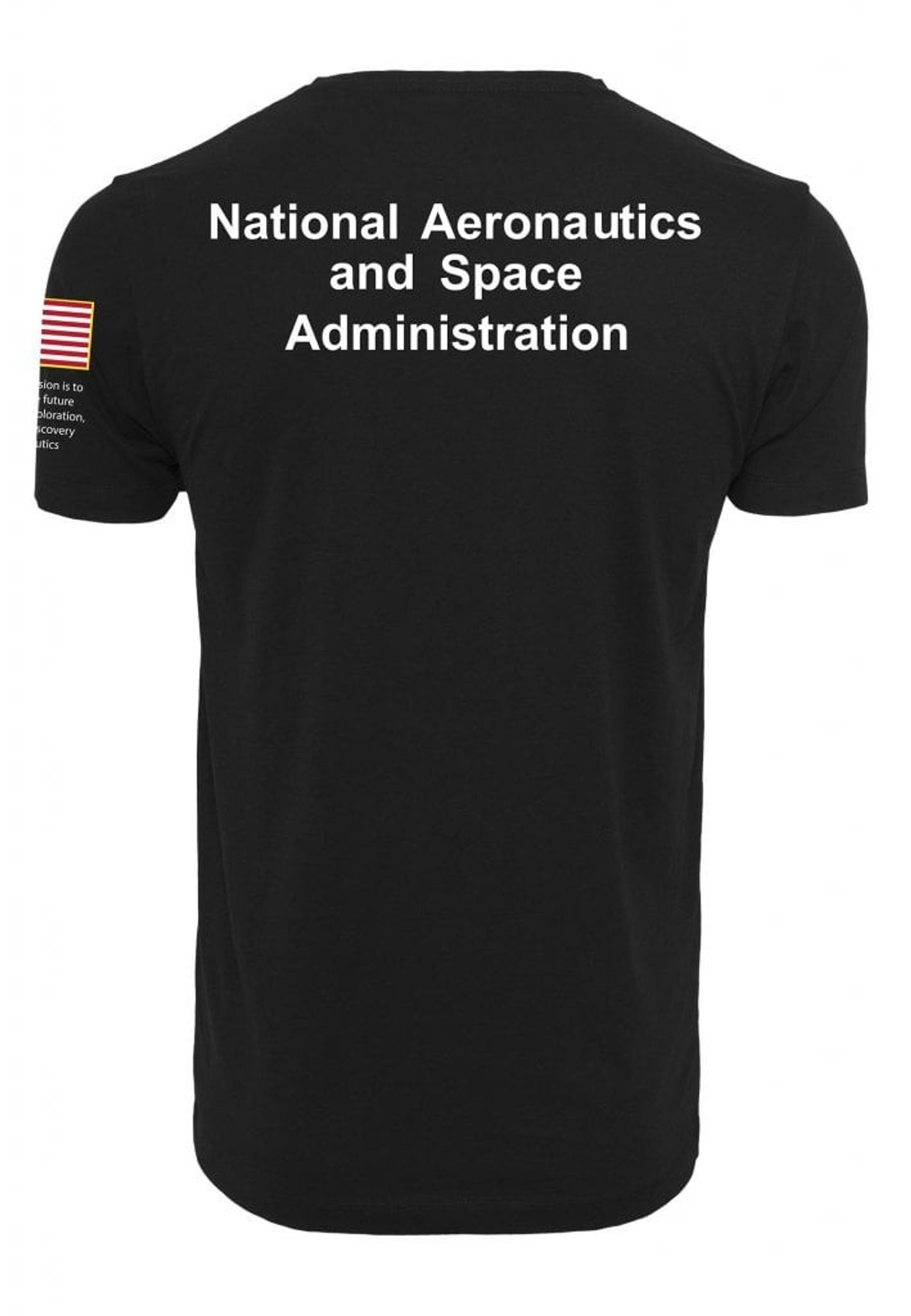 En sort T-shirt med NASA's logo trykt på brystet. På venstre ærme er en patch med det amerikanske flag broderet og nedenfor er en meddelelse om NASAs formål.