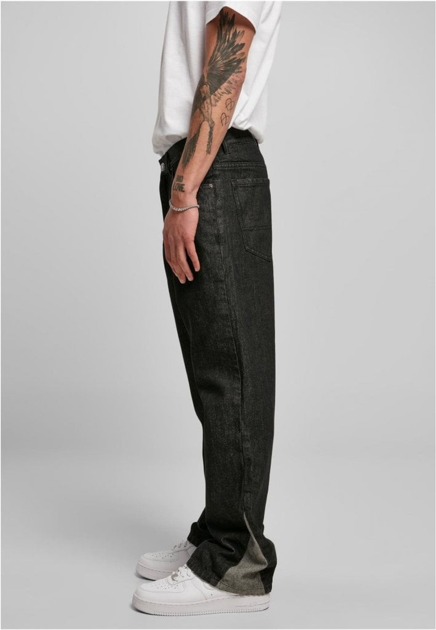 Udstyret med trekantede og farvede indlæg i den nederste ende, har disse jeans let udstrakte ben. Den ellers traditionelle stil består af sidelommer, linning med bæltestropper, metalliske knapper og påsyede lommer bagpå, som er formet af et ekstra bærestykke. Denimen er lavet af bomuld og pasformen er normal.