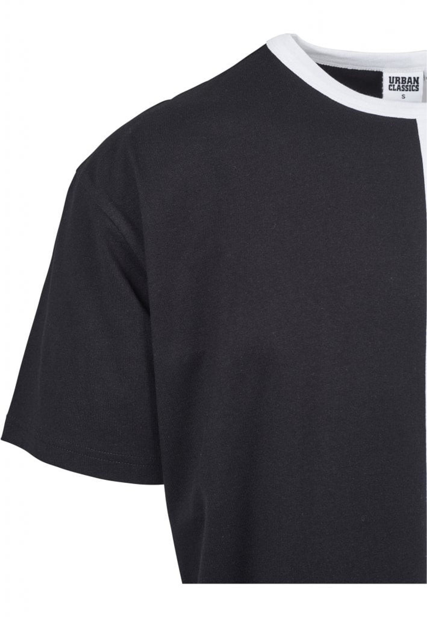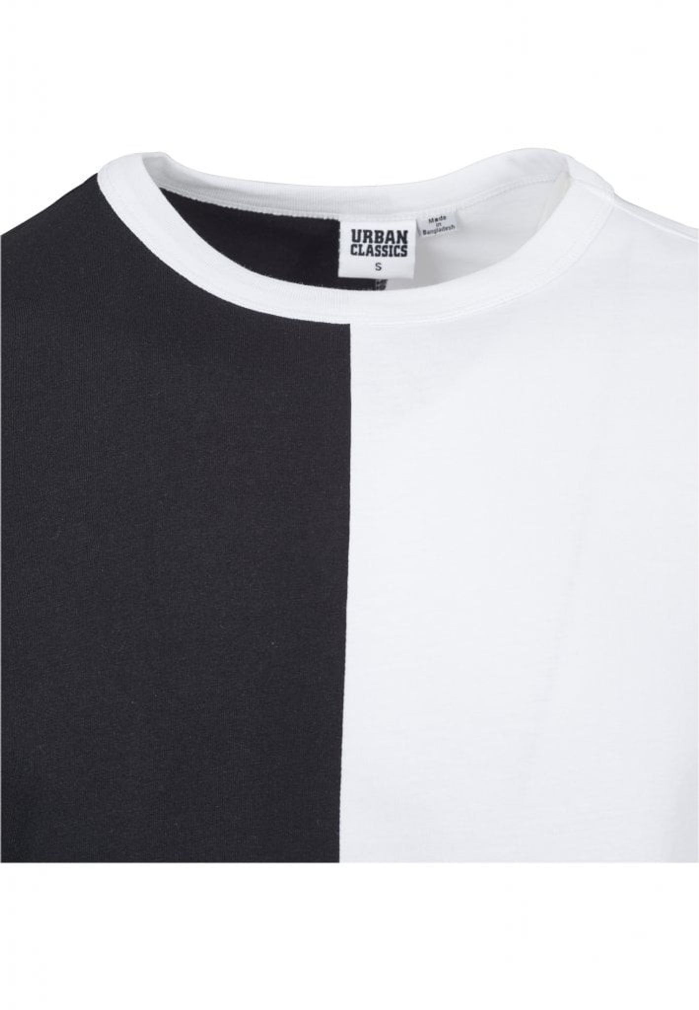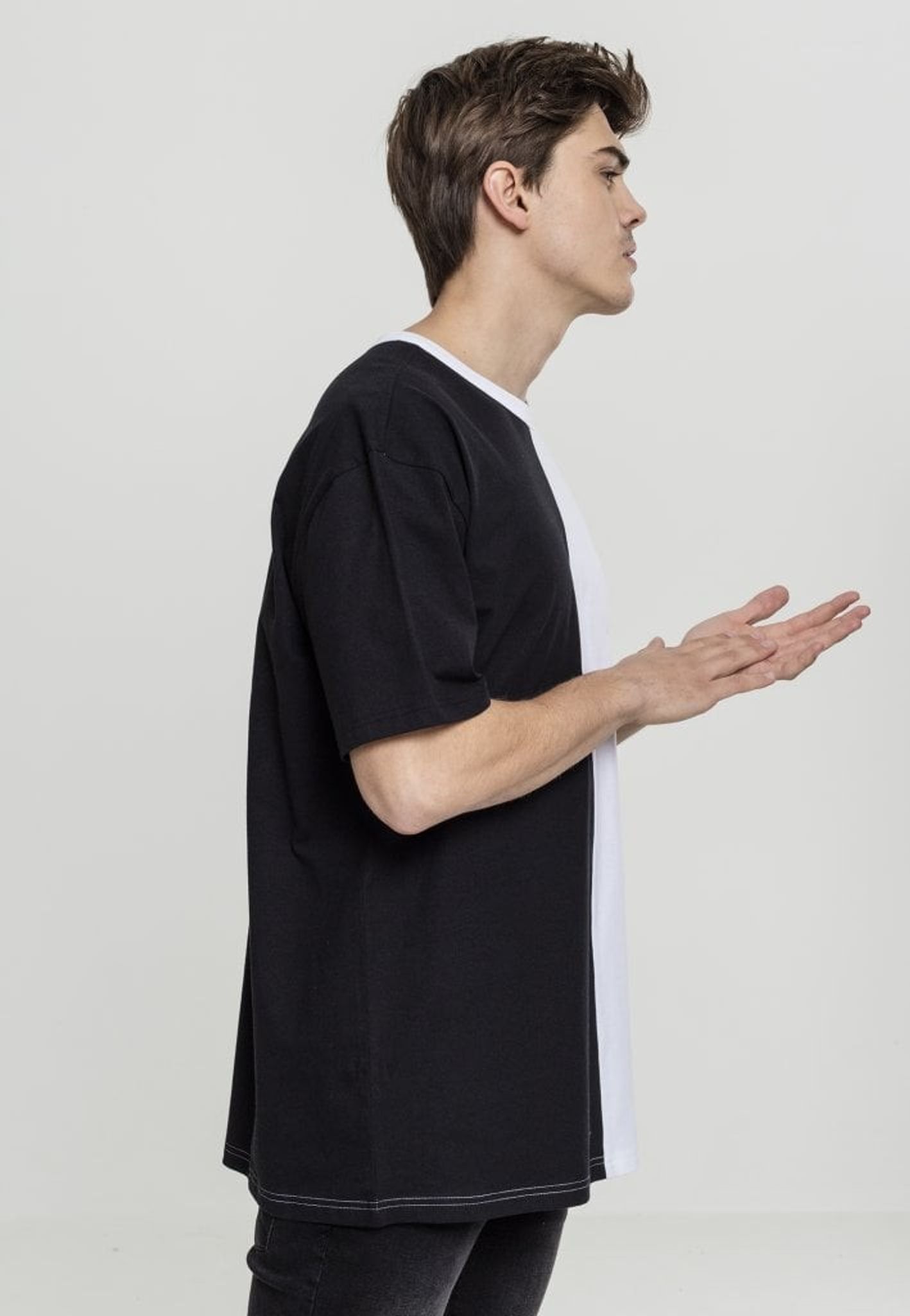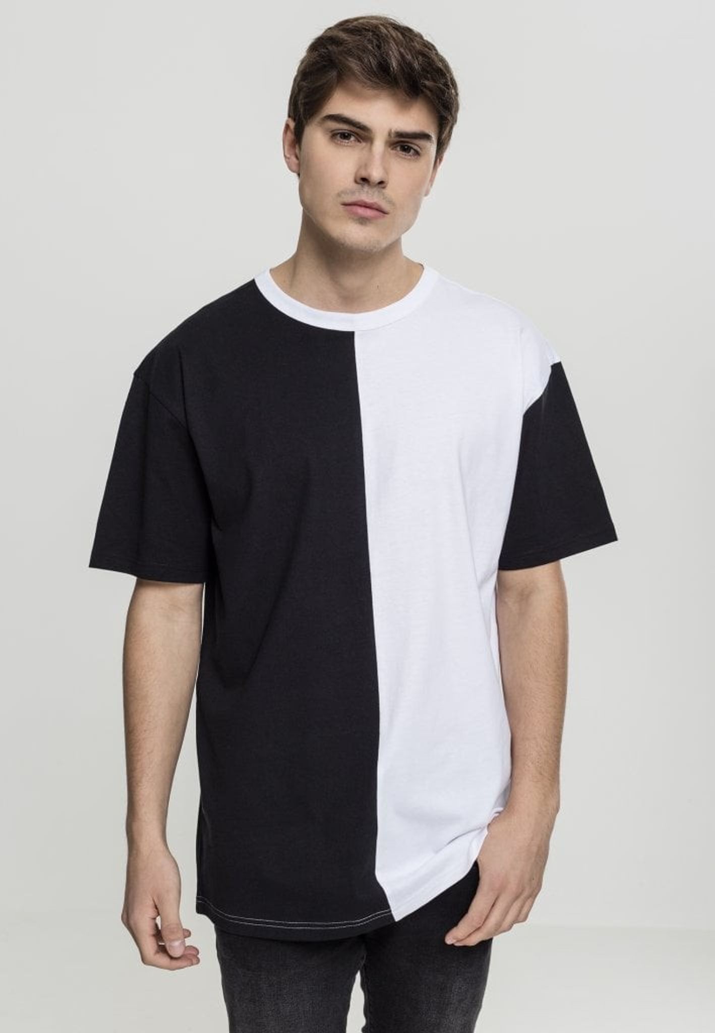 En hård T-shirt opdelt i to kontrastfarver. En skarp linje i midten af tøjet.