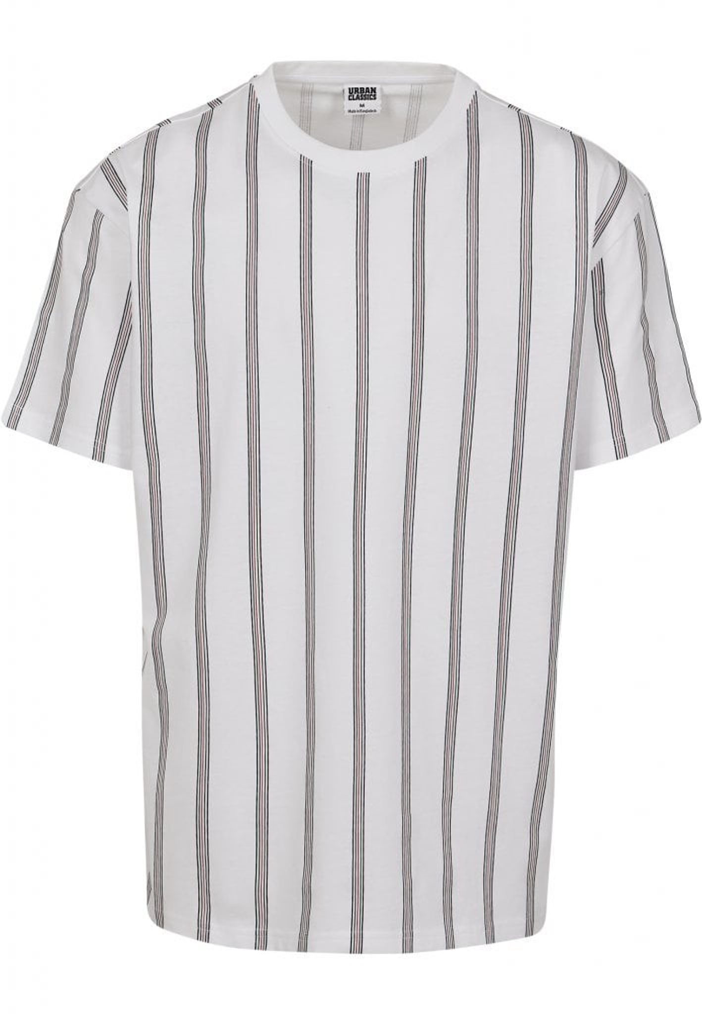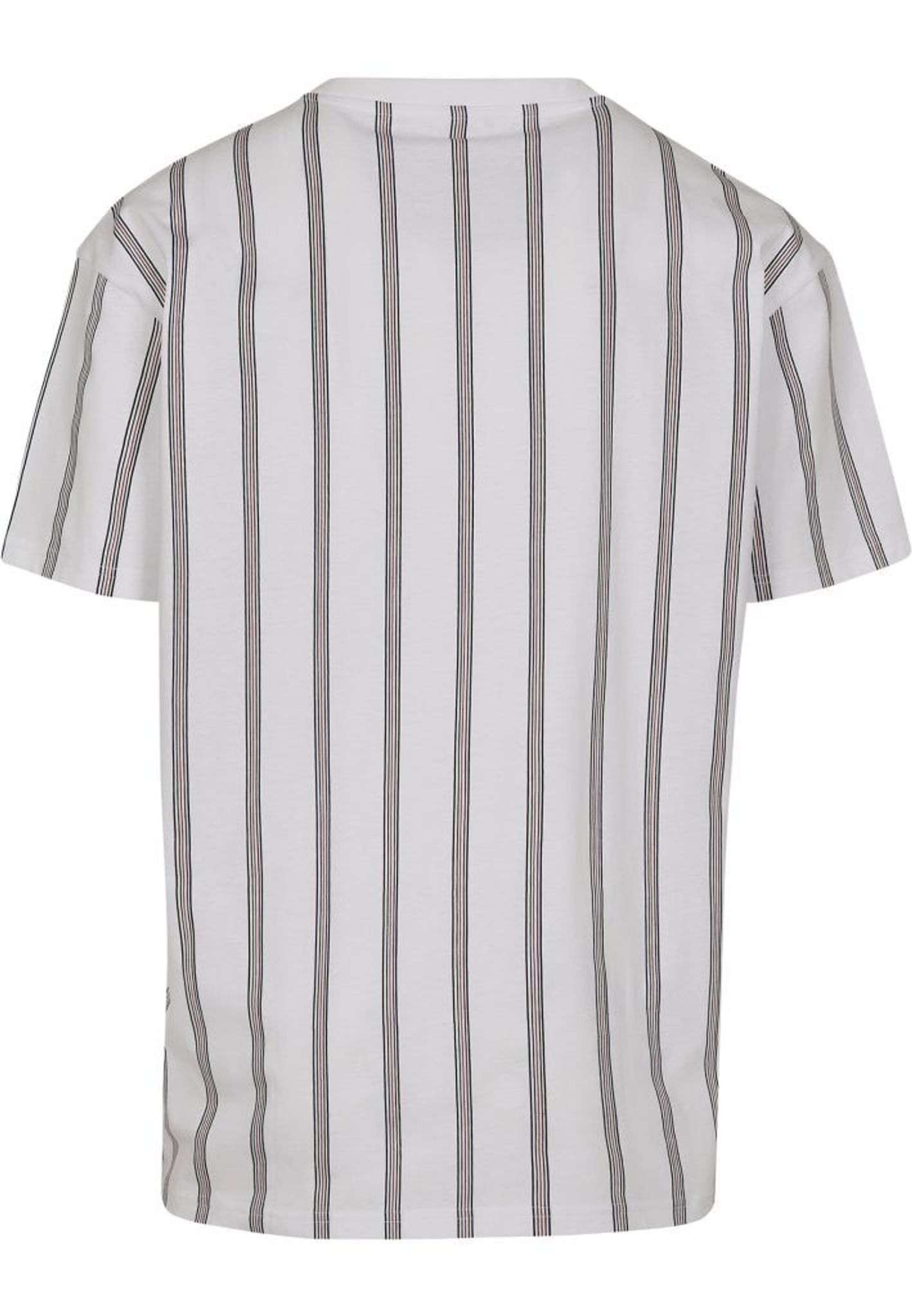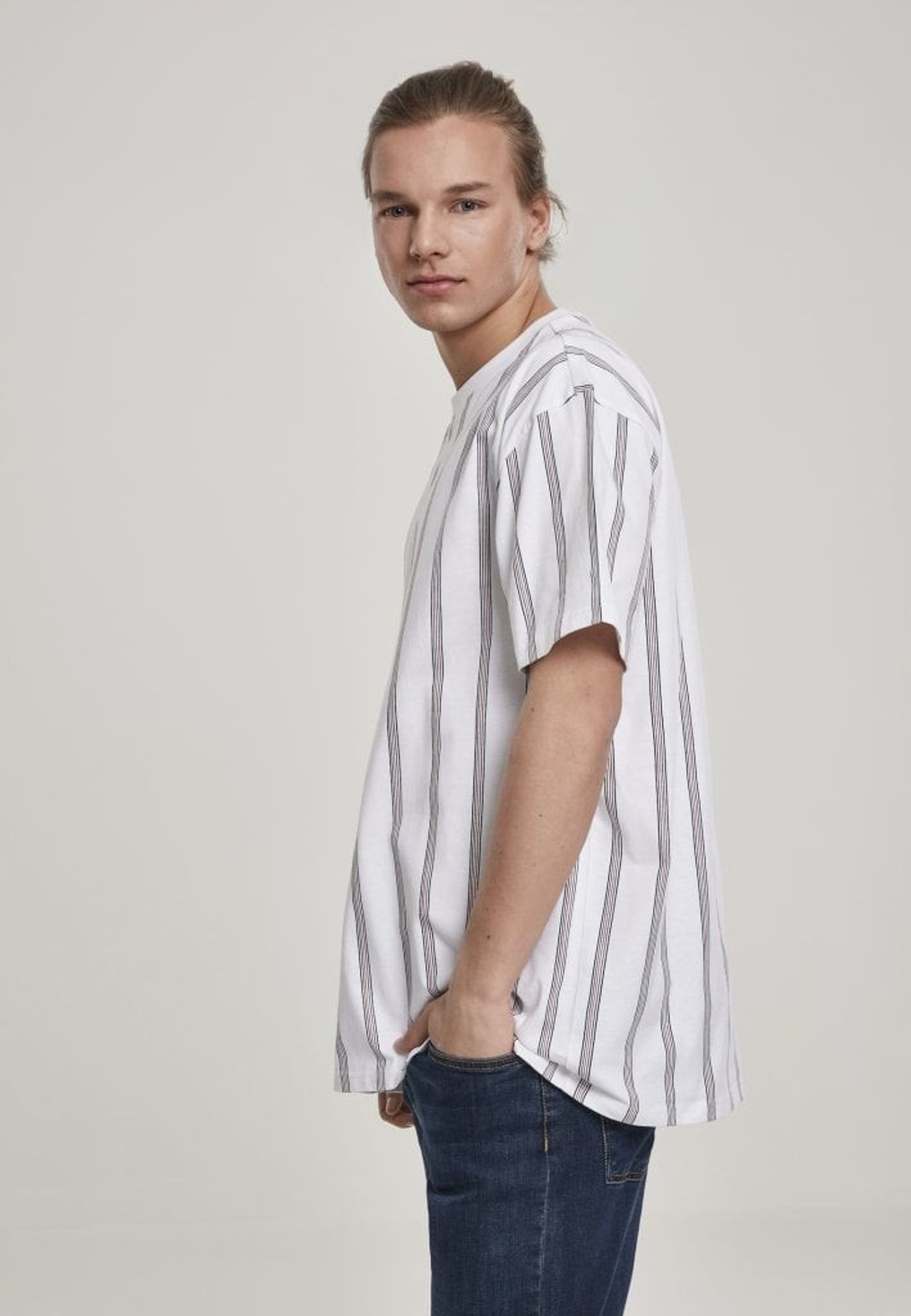 En hvid T-shirt med lodrette striber og overdimensioneret model.
