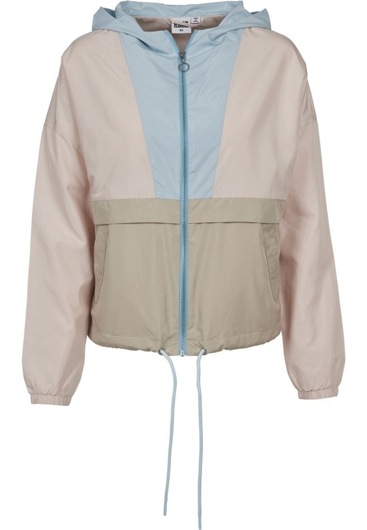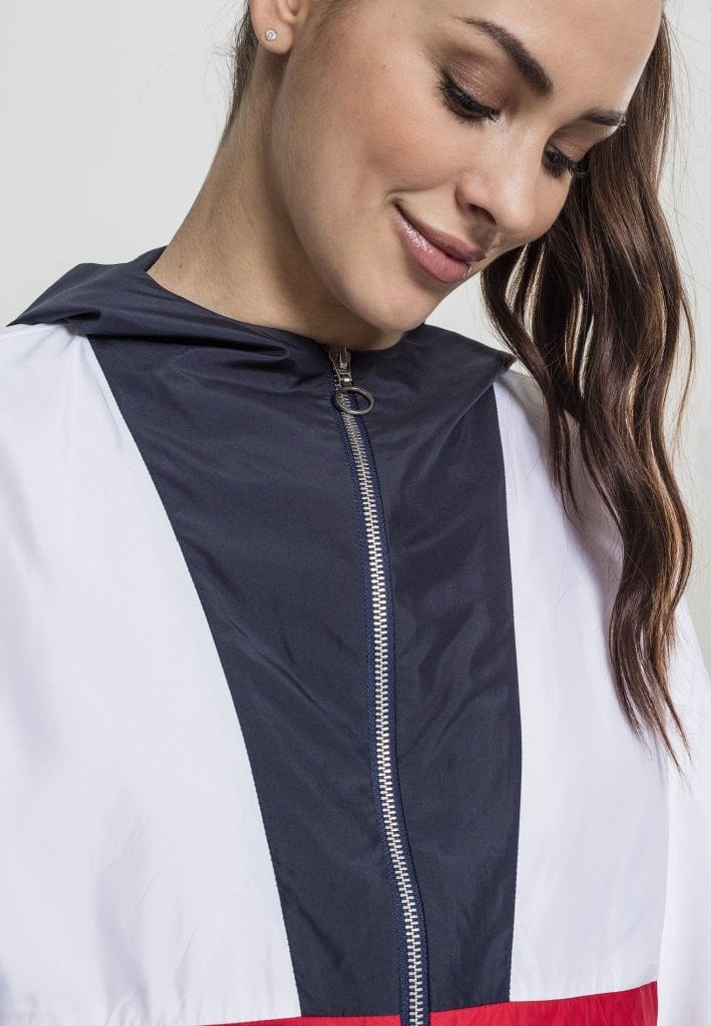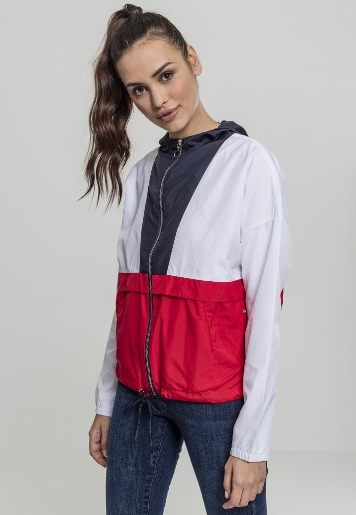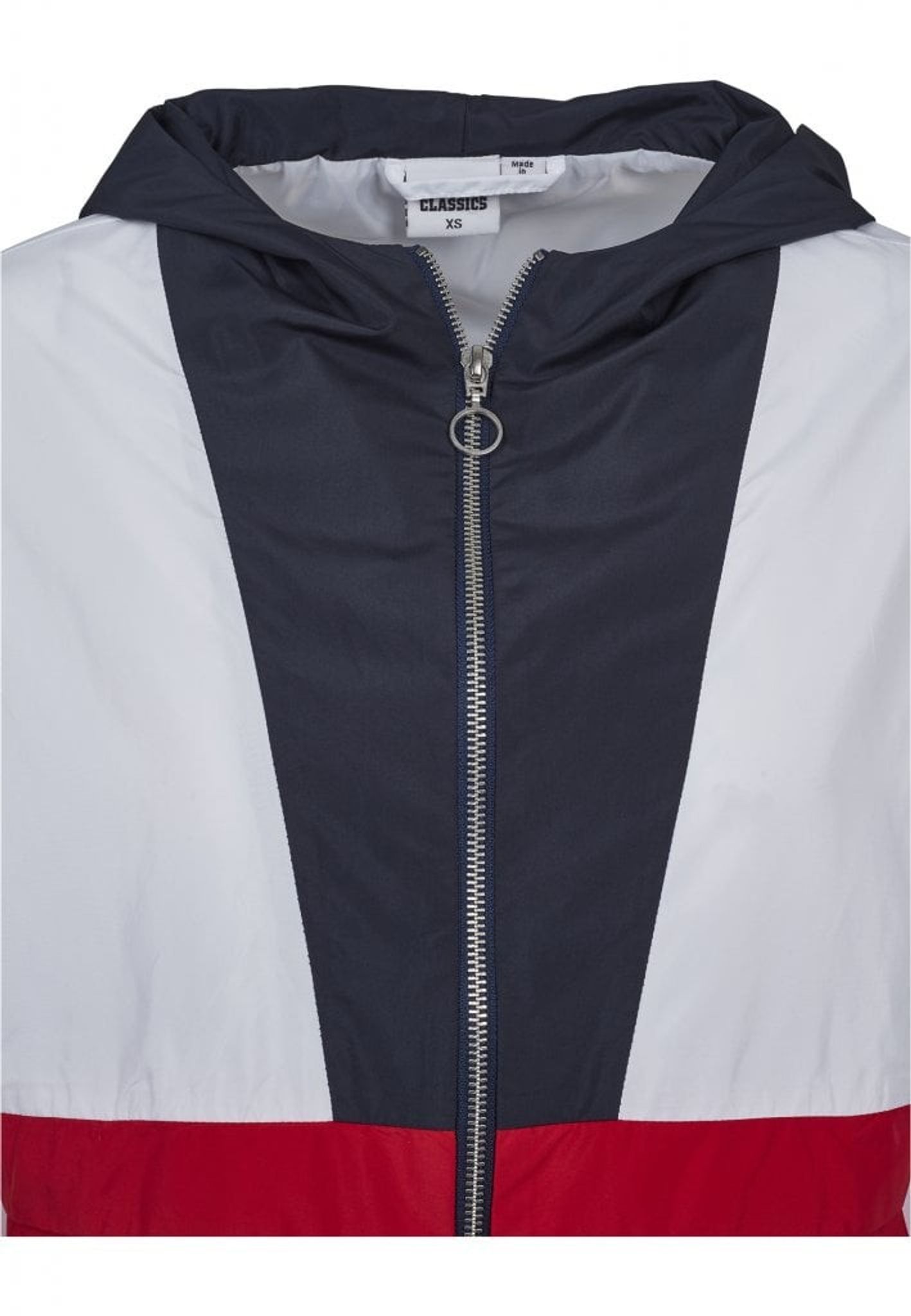 En tre-farvet vindjakke med en stor hætte.