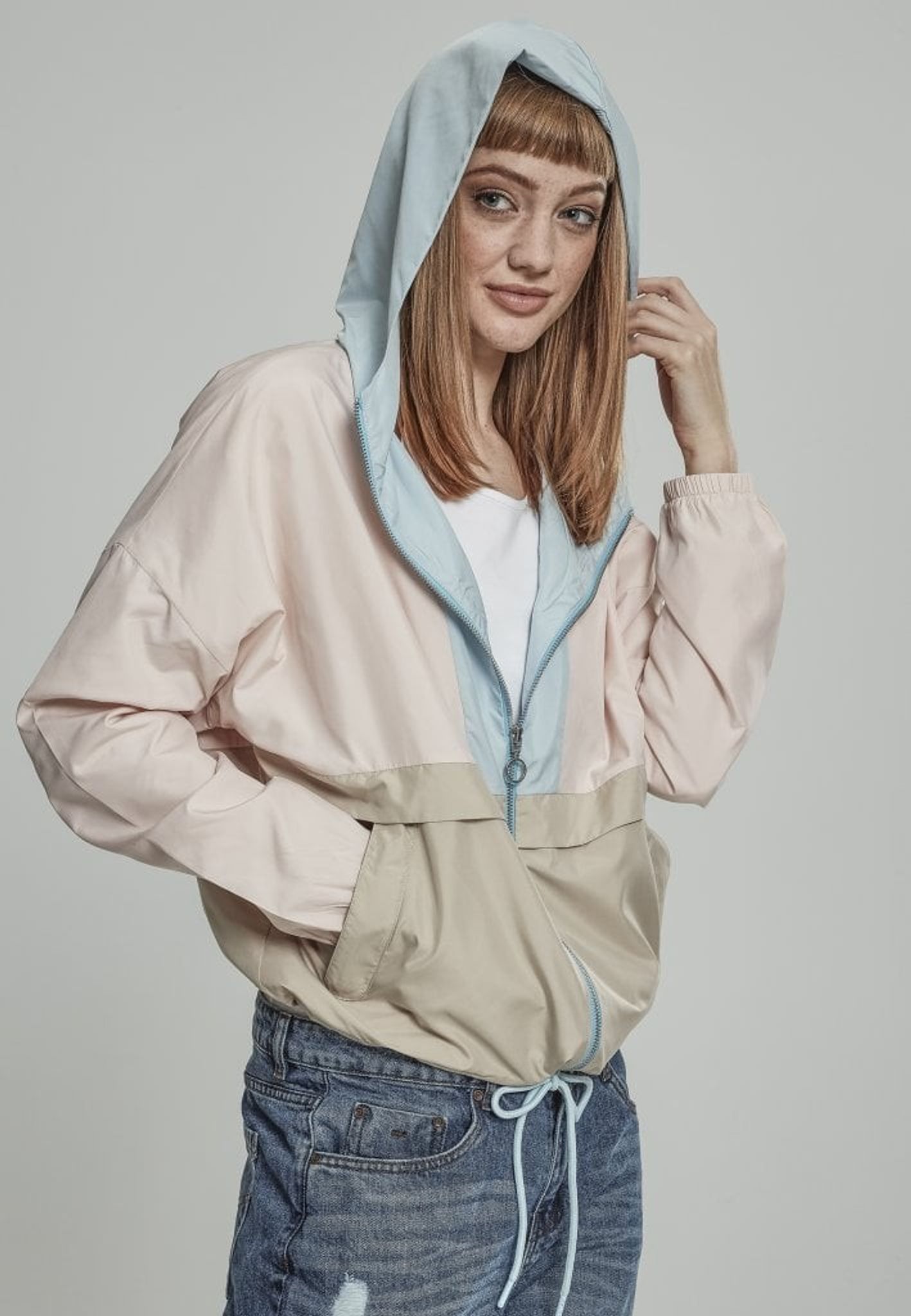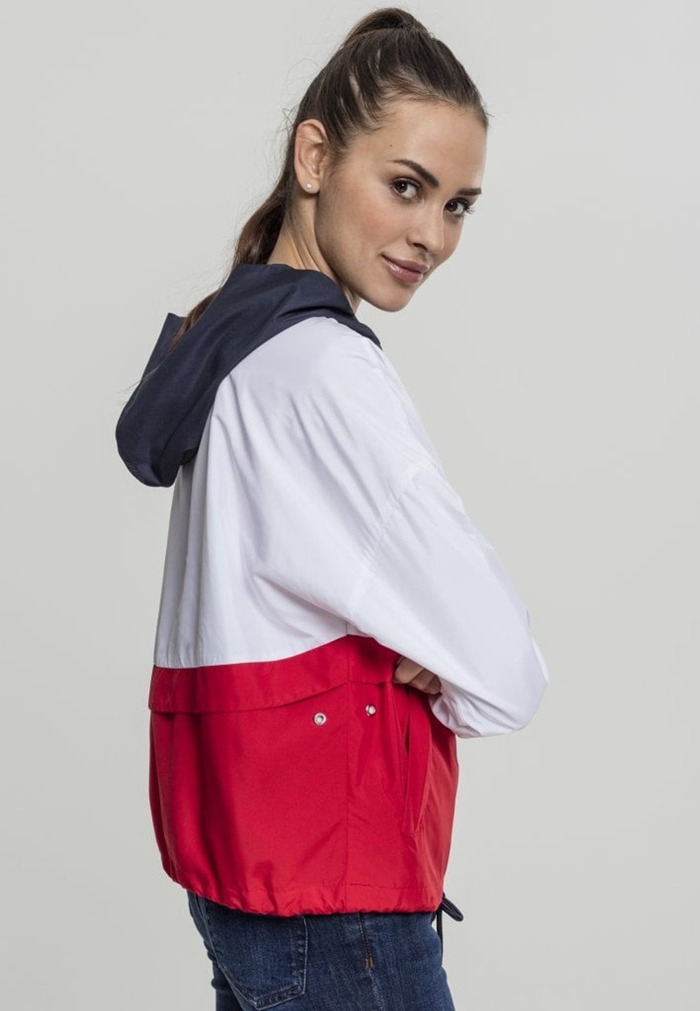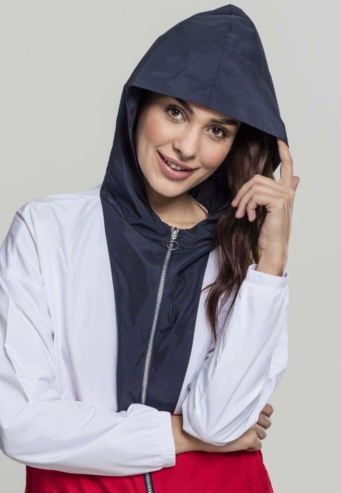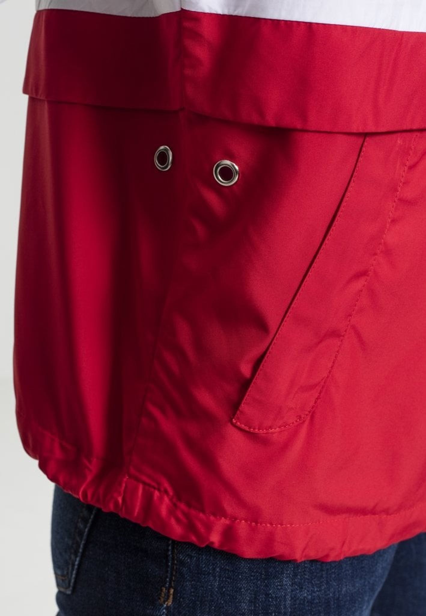 En tre-farvet vindjakke med en stor hætte.