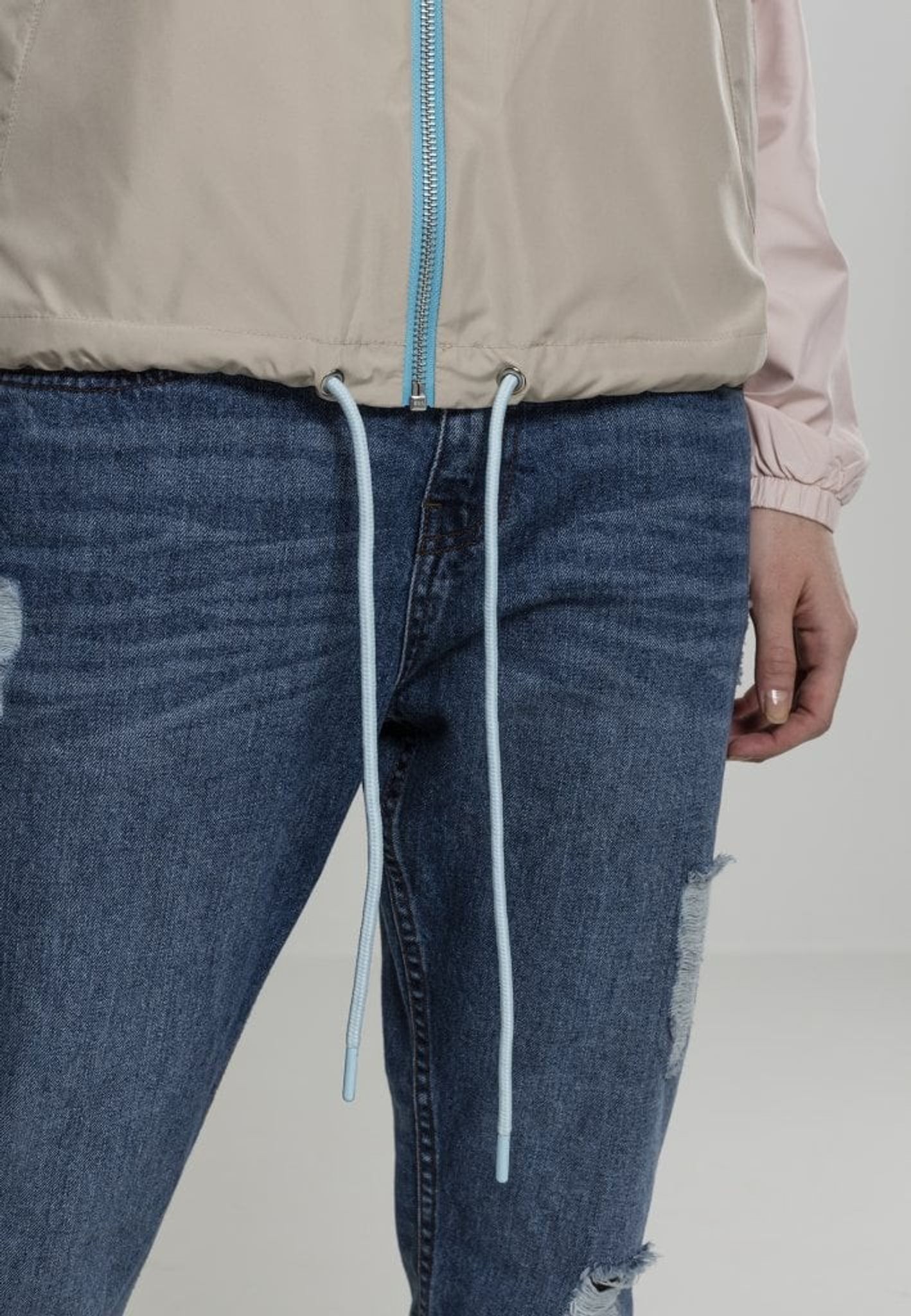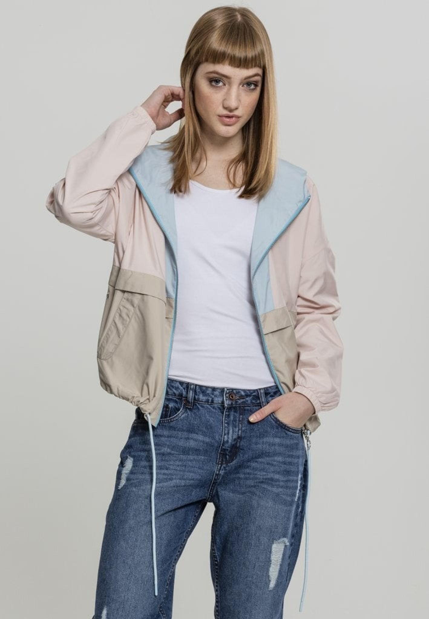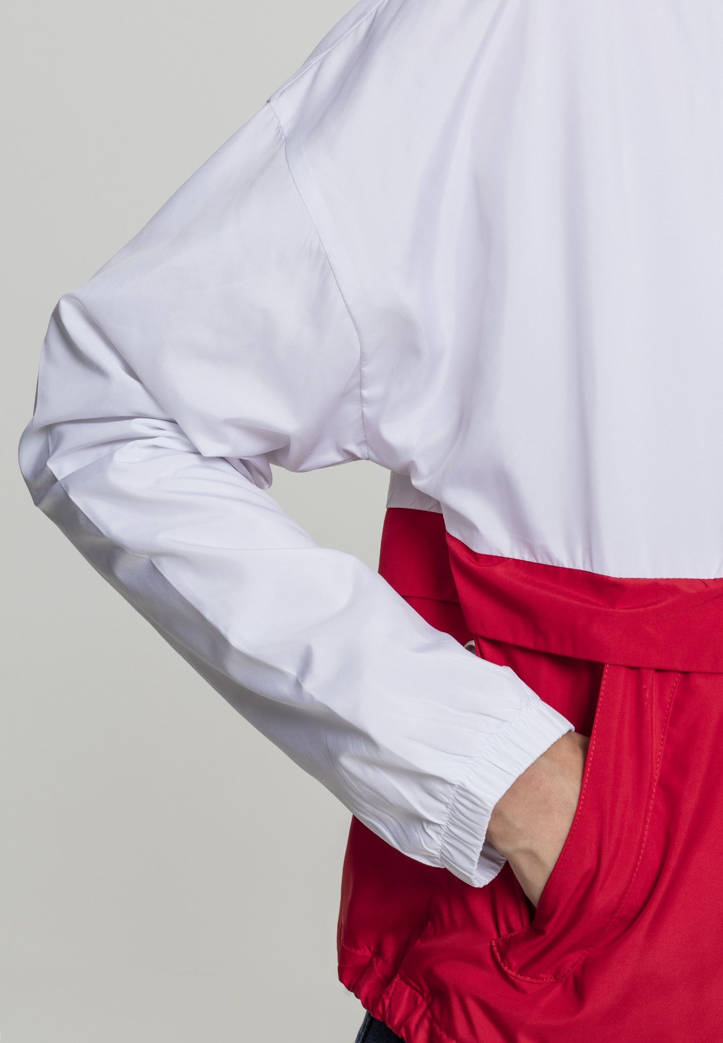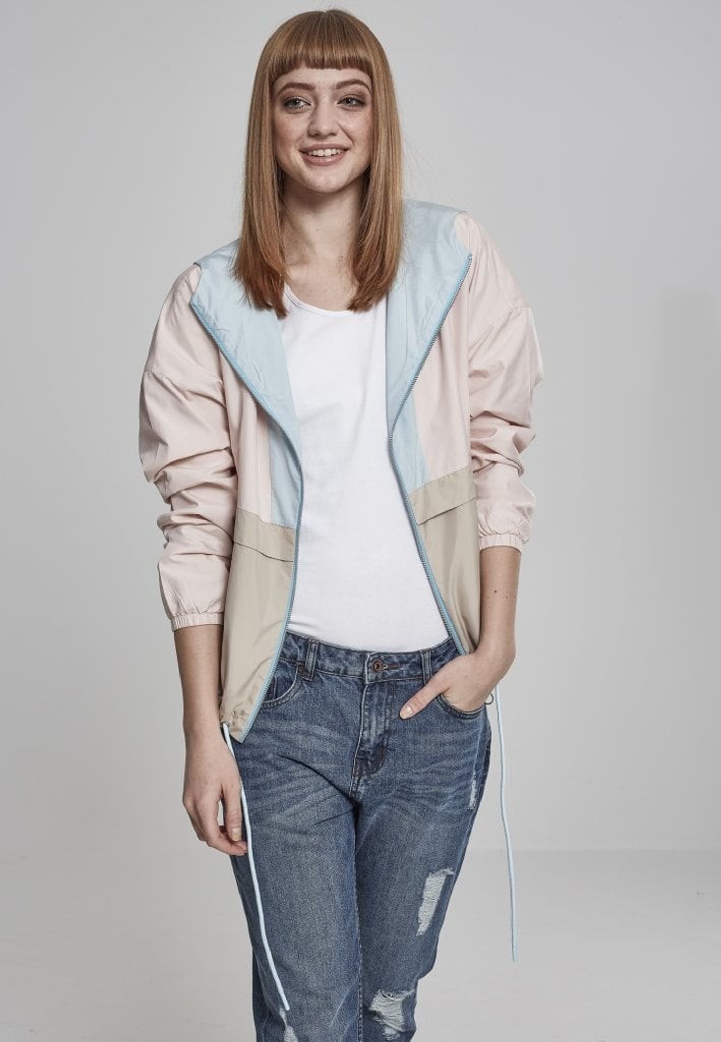 En tre-farvet vindjakke med en stor hætte.