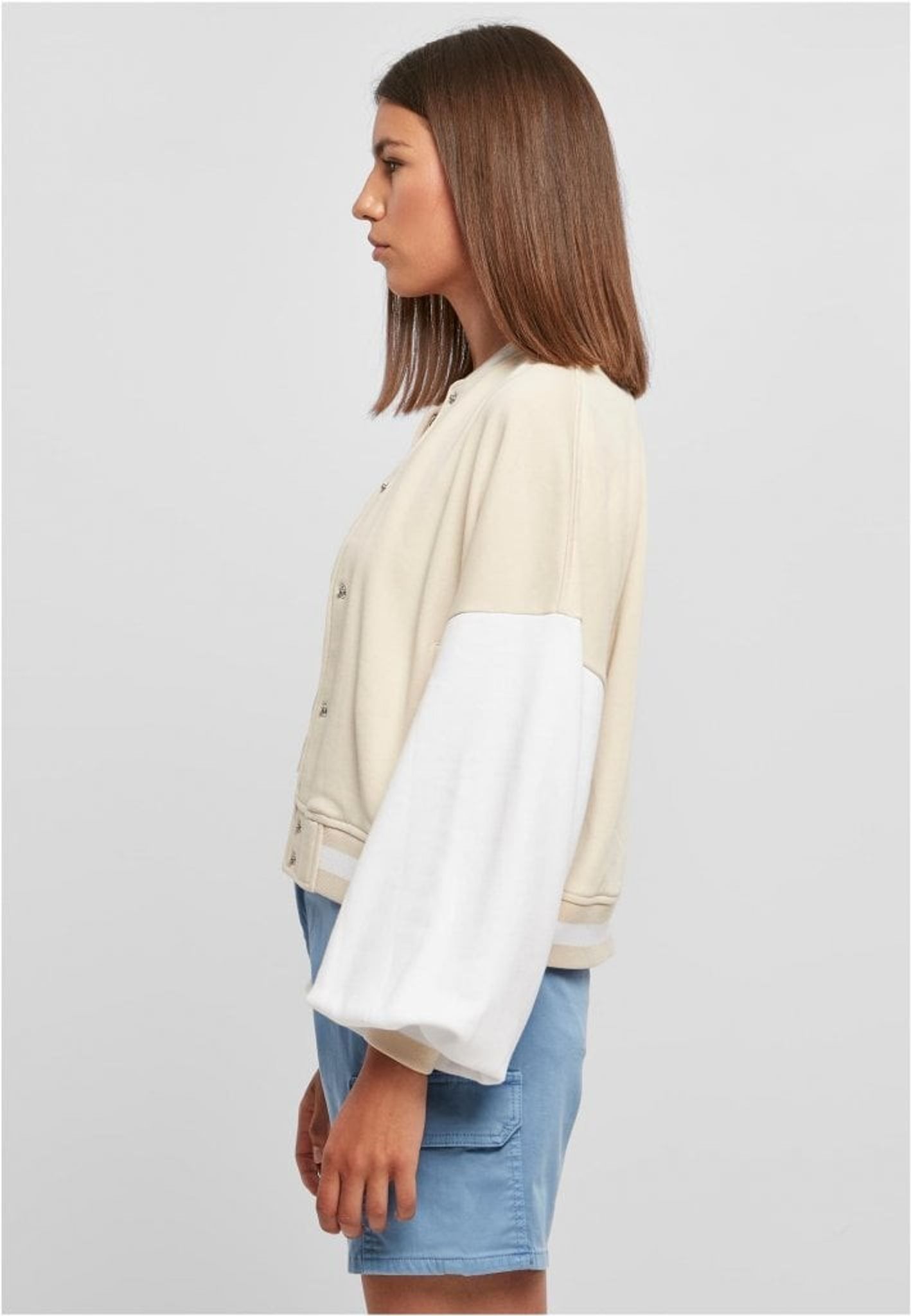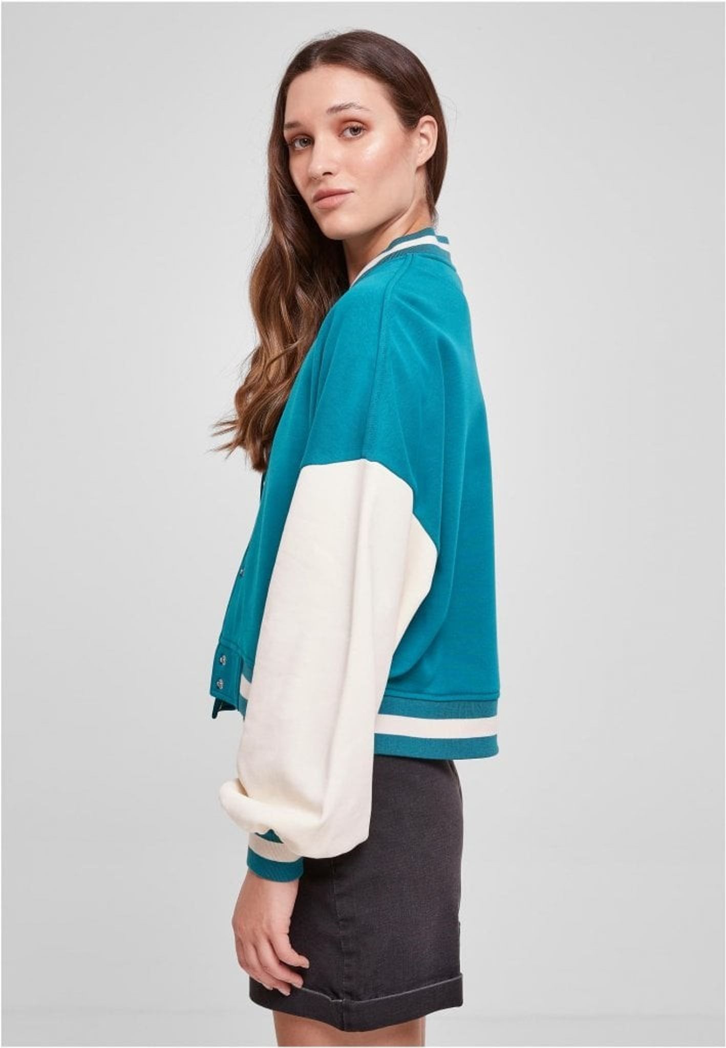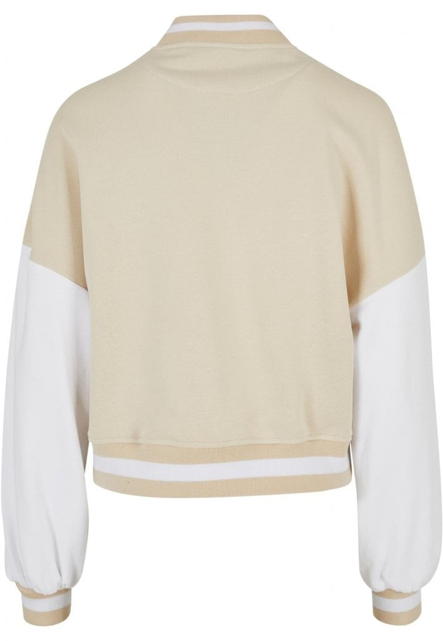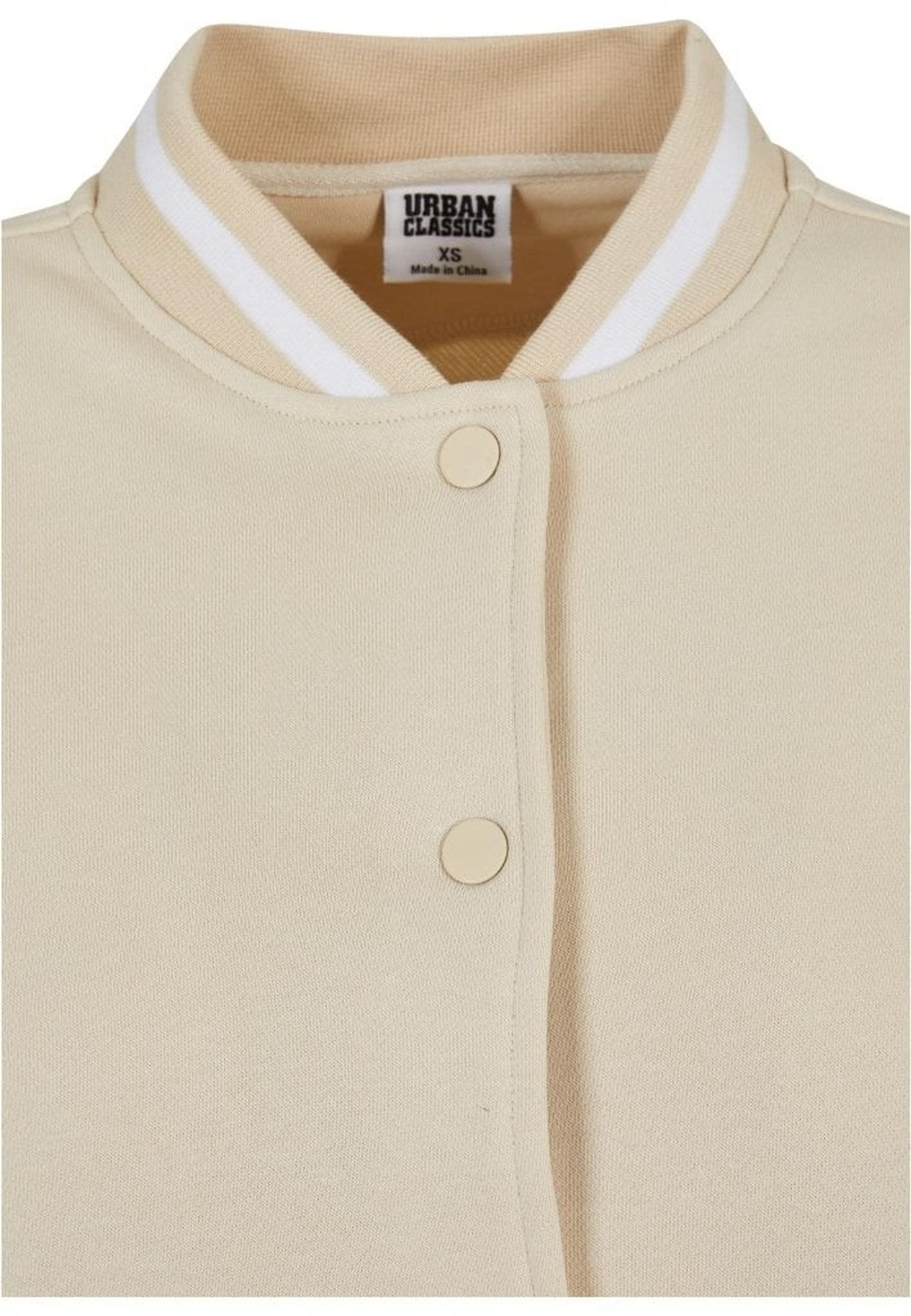 Denne succesfulde damer college jakke tilfredsstiller fuldt ud. Strikkene manchetter på kanten, kraven og ærmerne er designet i to forskellige farver og giver jakken dens college-appel. Jakkens to lommer har trykknapper såvel som hovedlukningen foran.