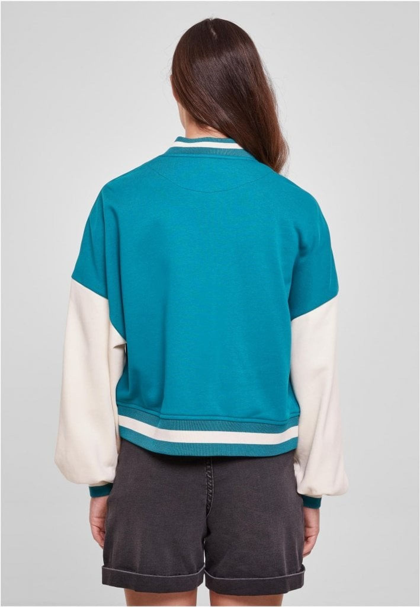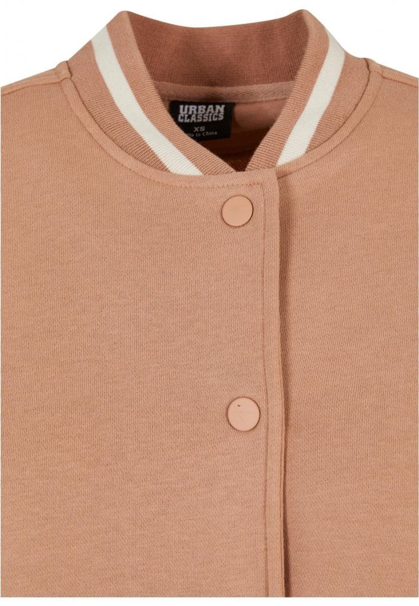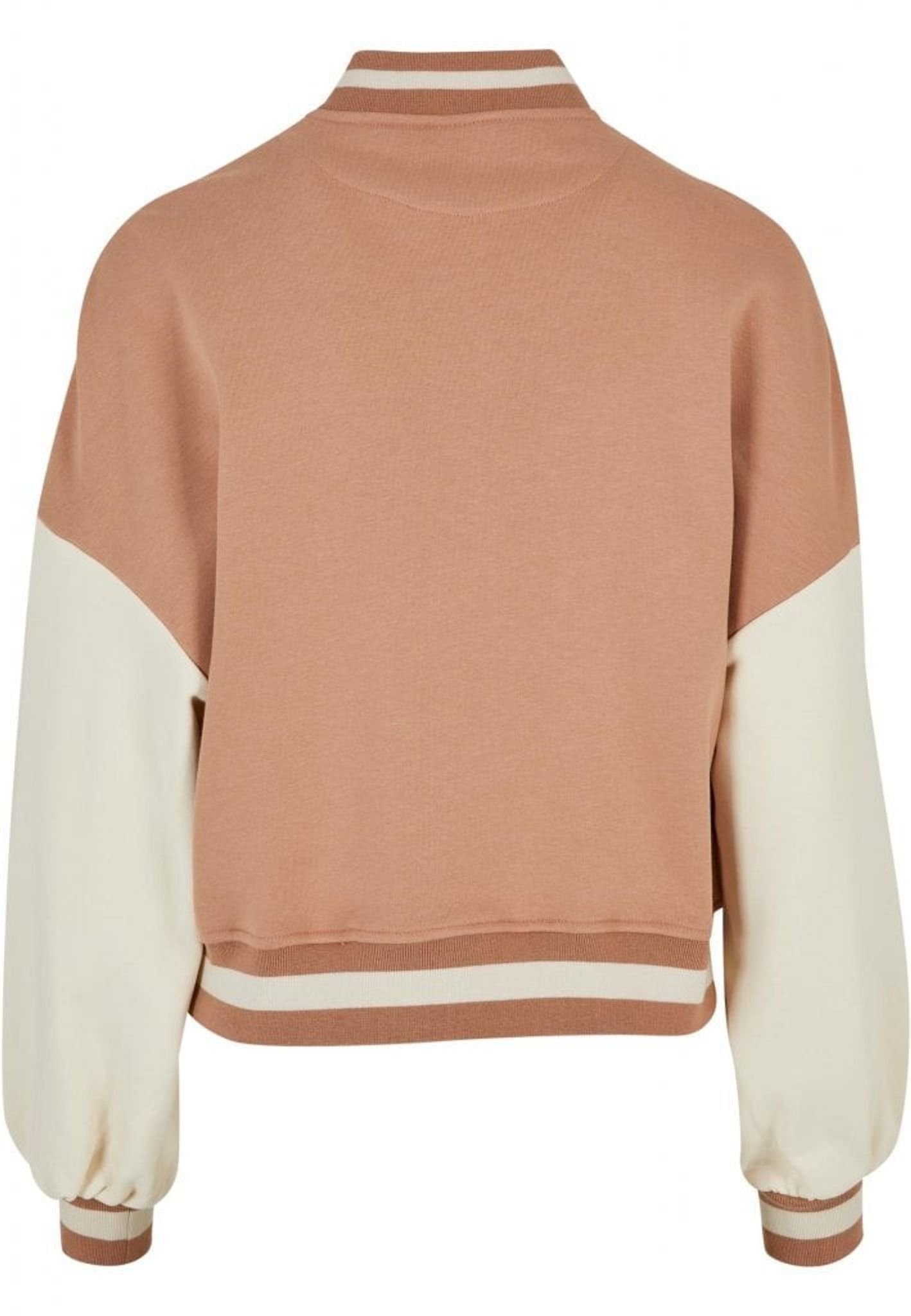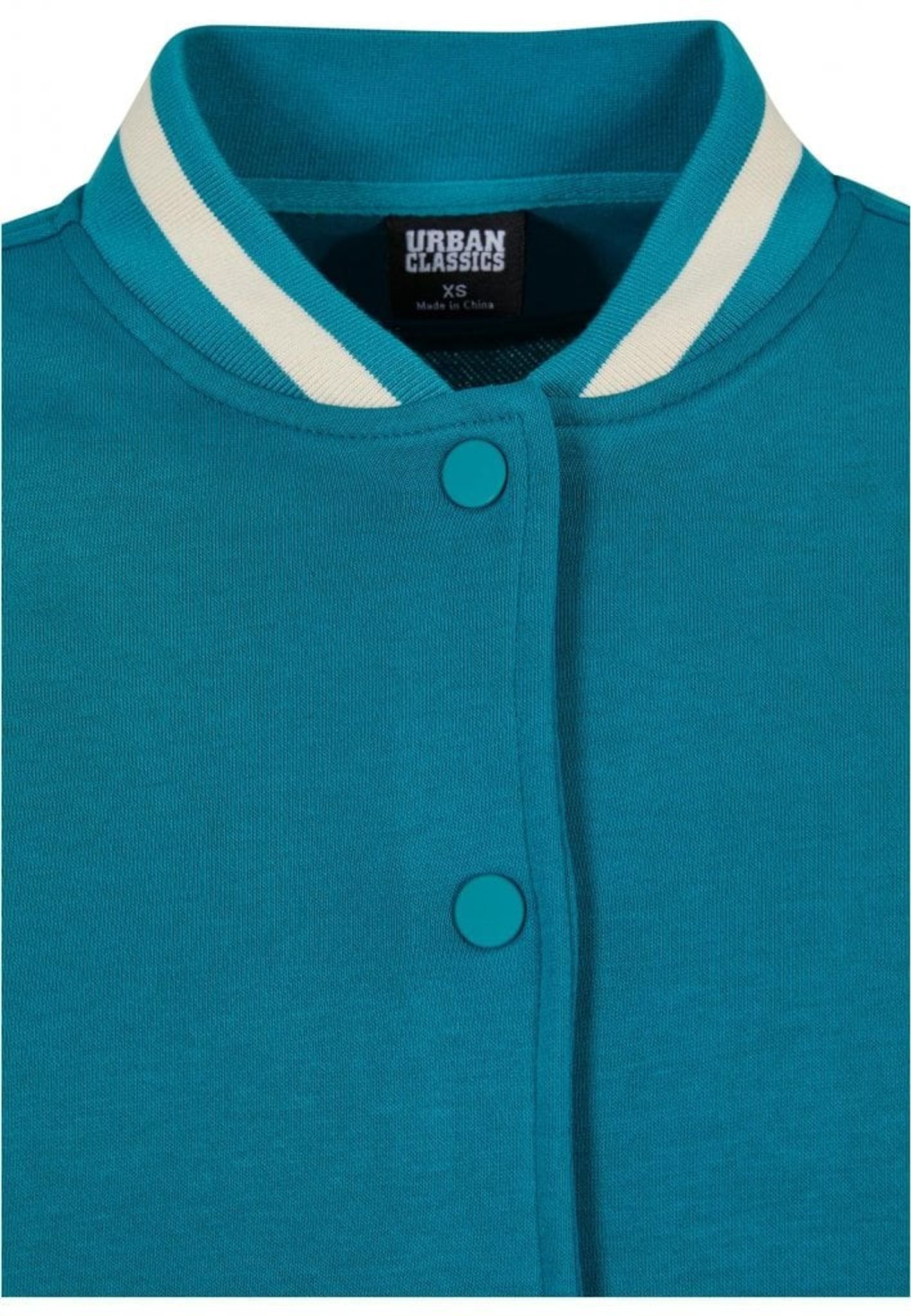 Denne succesfulde damer college jakke tilfredsstiller fuldt ud. Strikkene manchetter på kanten, kraven og ærmerne er designet i to forskellige farver og giver jakken dens college-appel. Jakkens to lommer har trykknapper såvel som hovedlukningen foran.