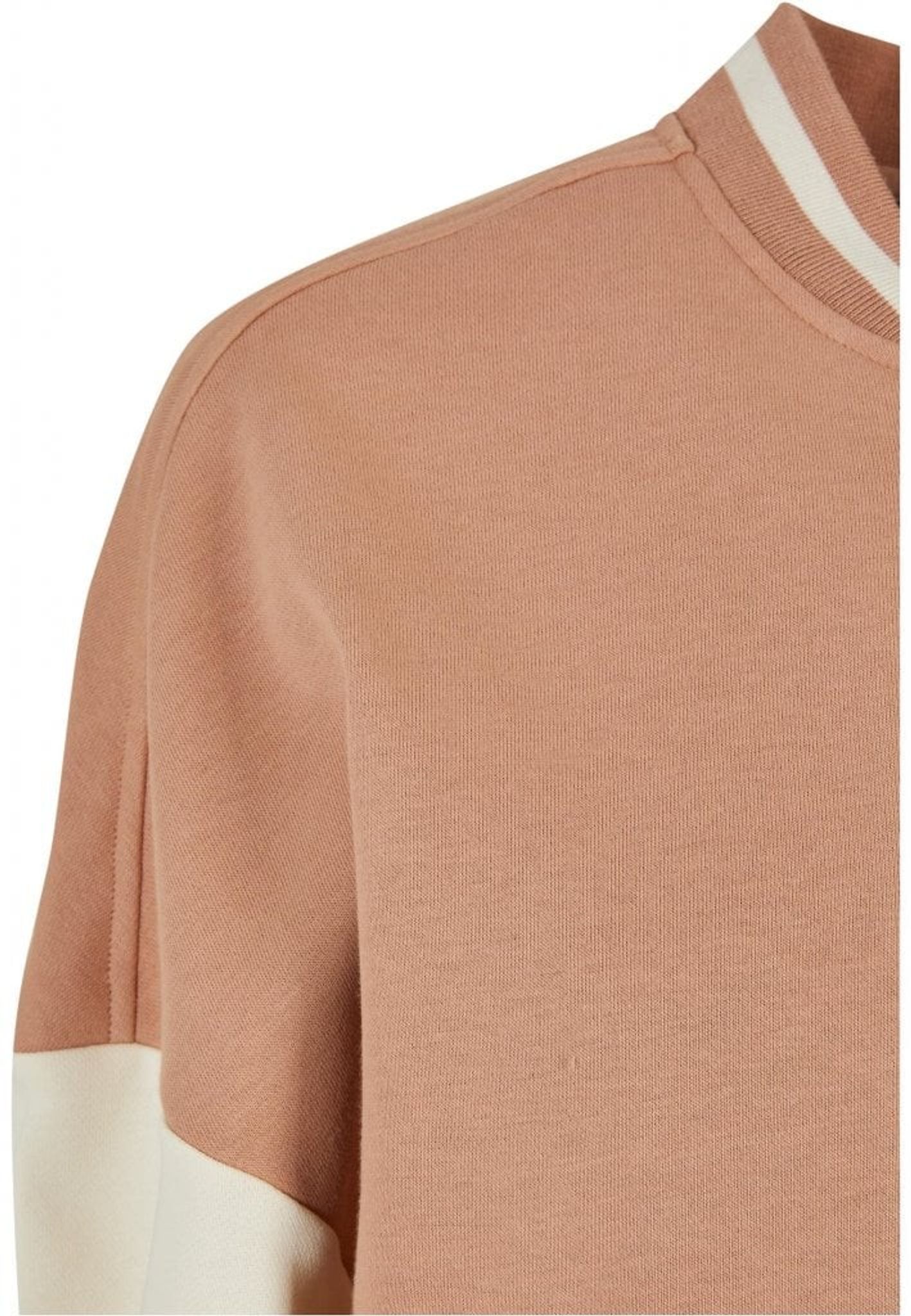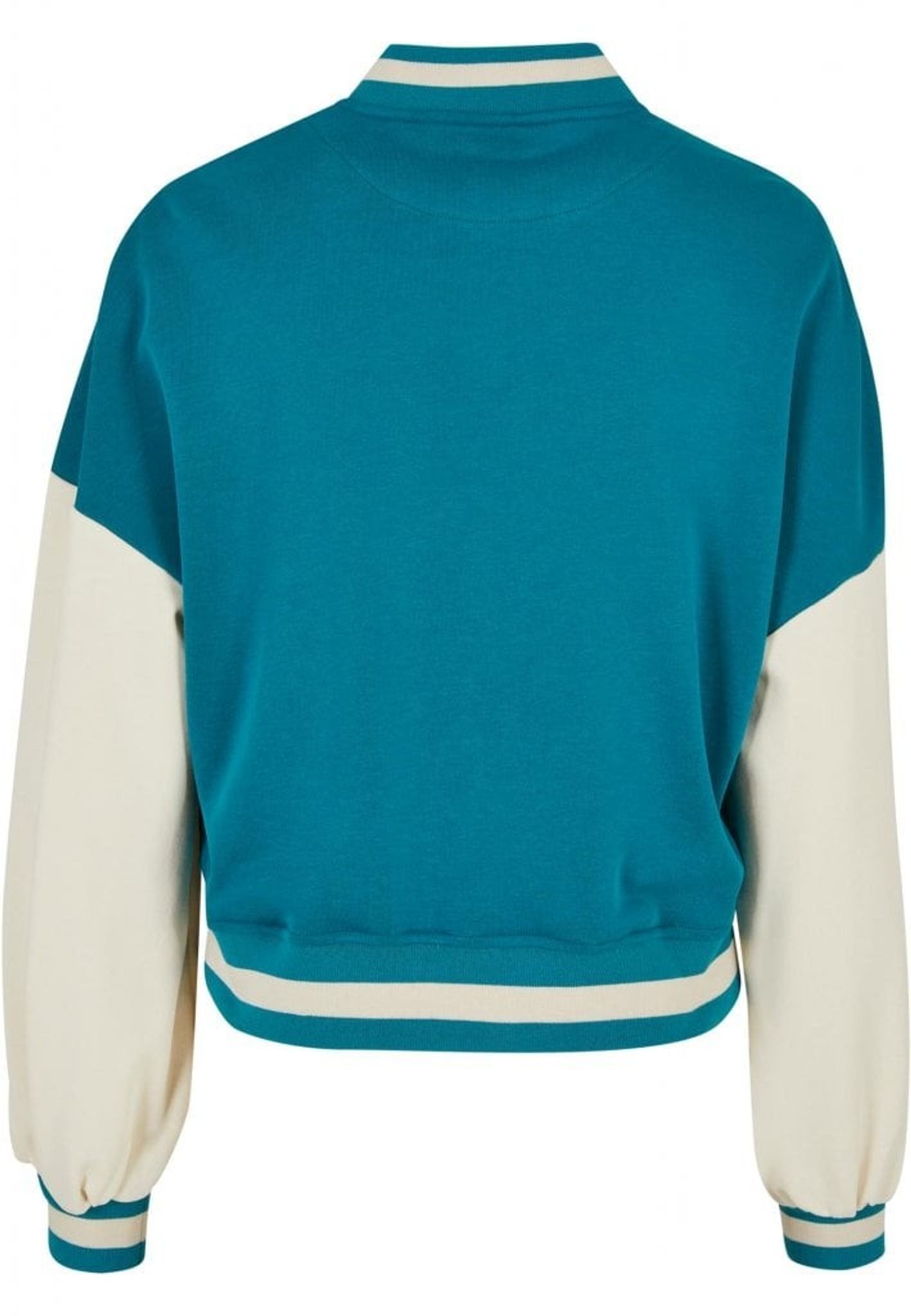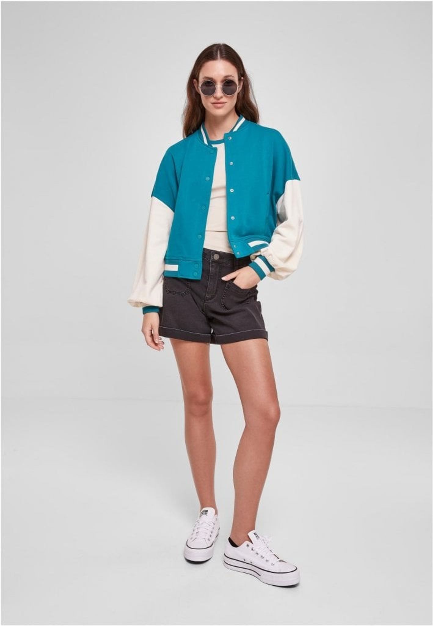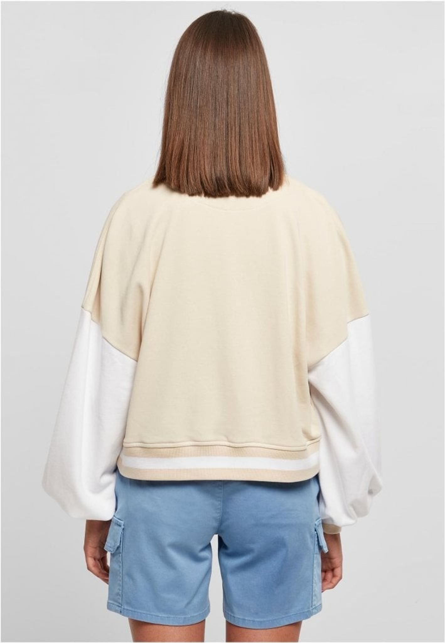 Denne succesfulde damer college jakke tilfredsstiller fuldt ud. Strikkene manchetter på kanten, kraven og ærmerne er designet i to forskellige farver og giver jakken dens college-appel. Jakkens to lommer har trykknapper såvel som hovedlukningen foran.