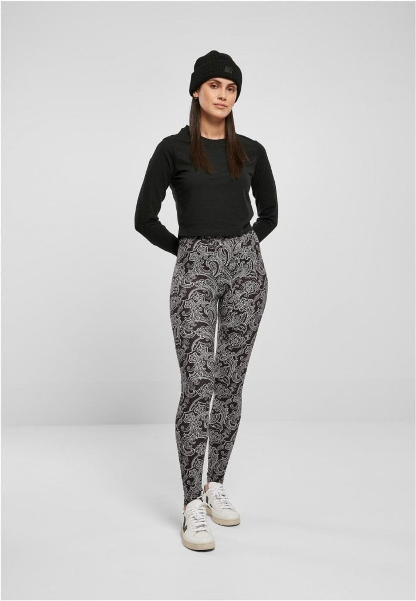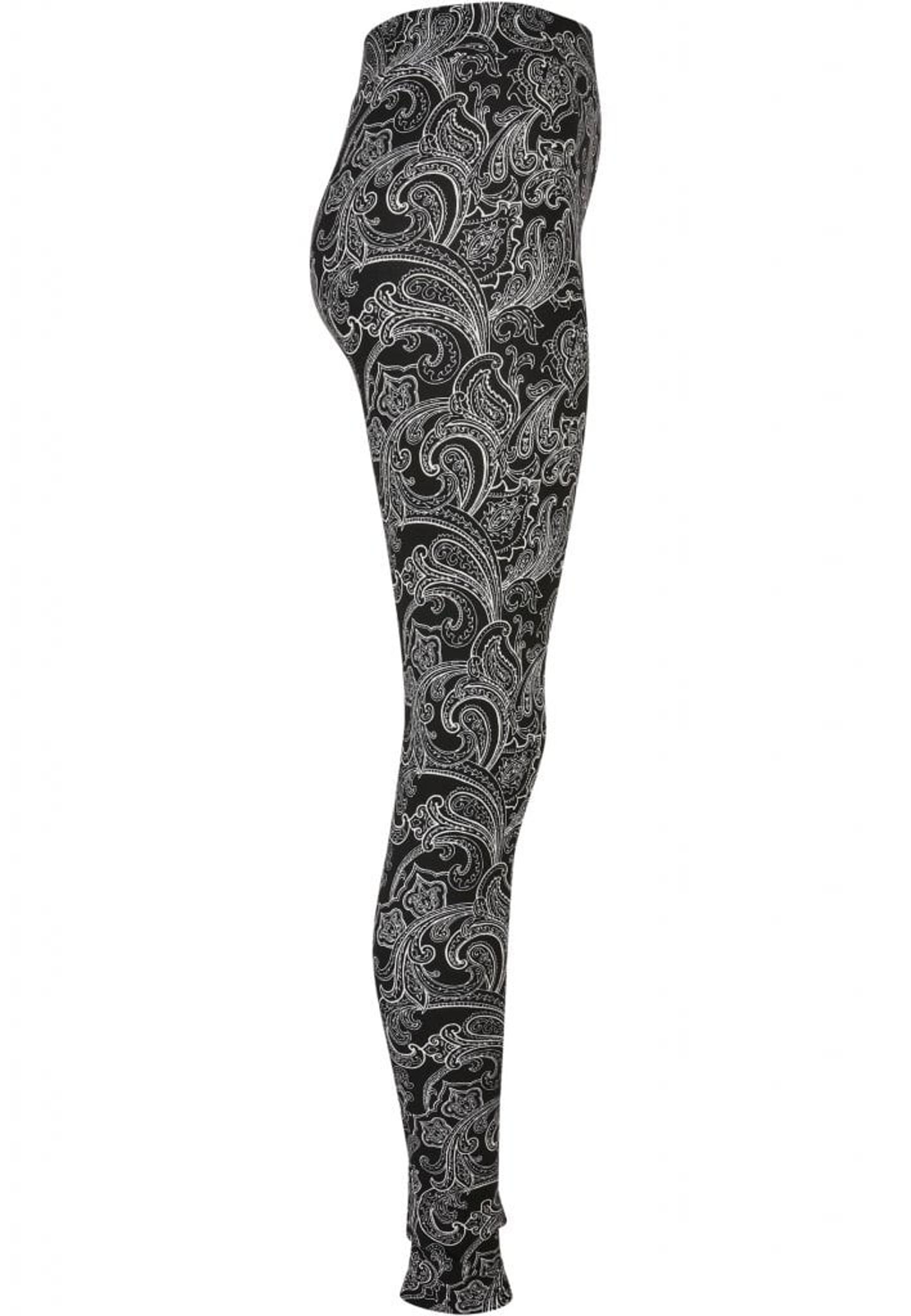 Leggings med sort stof og paisleymønster med hvide linjer.