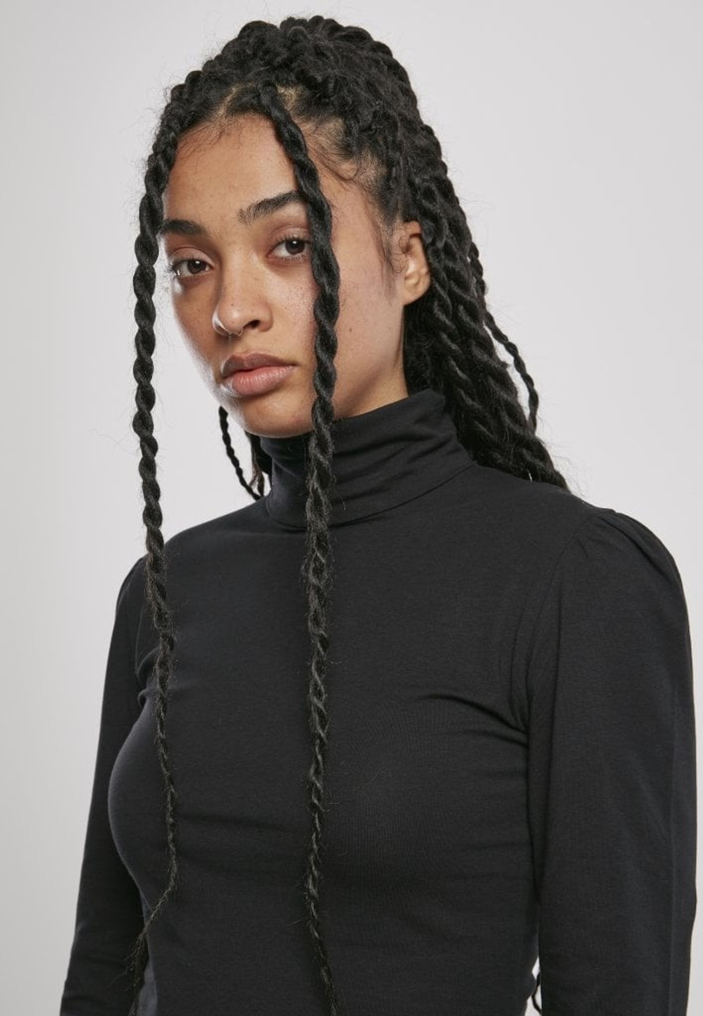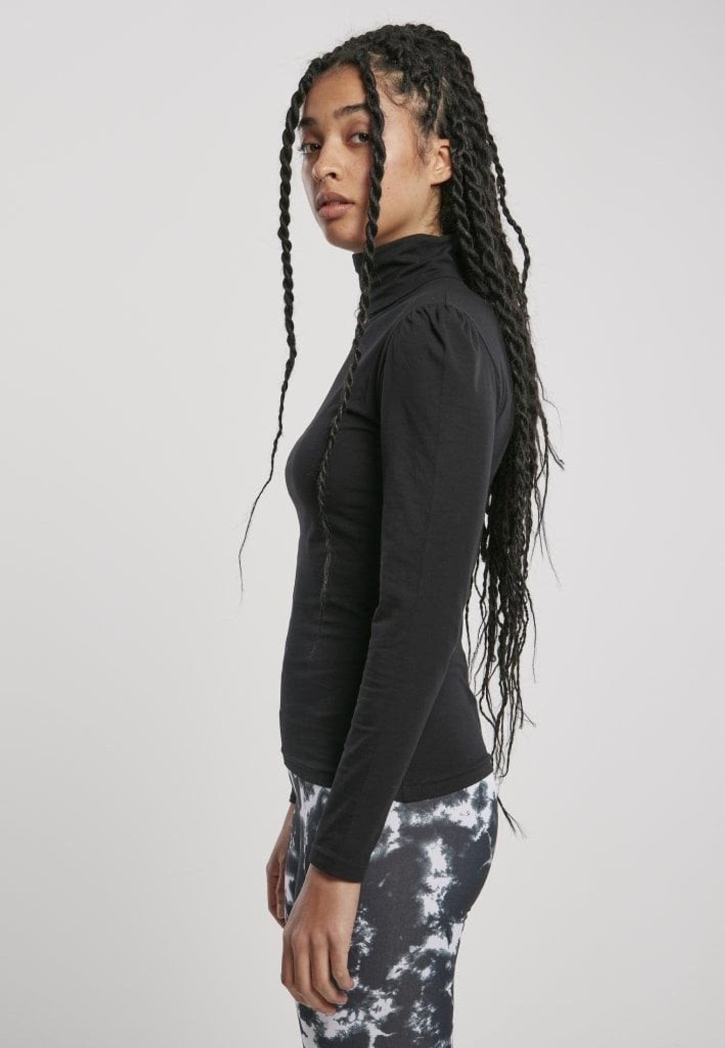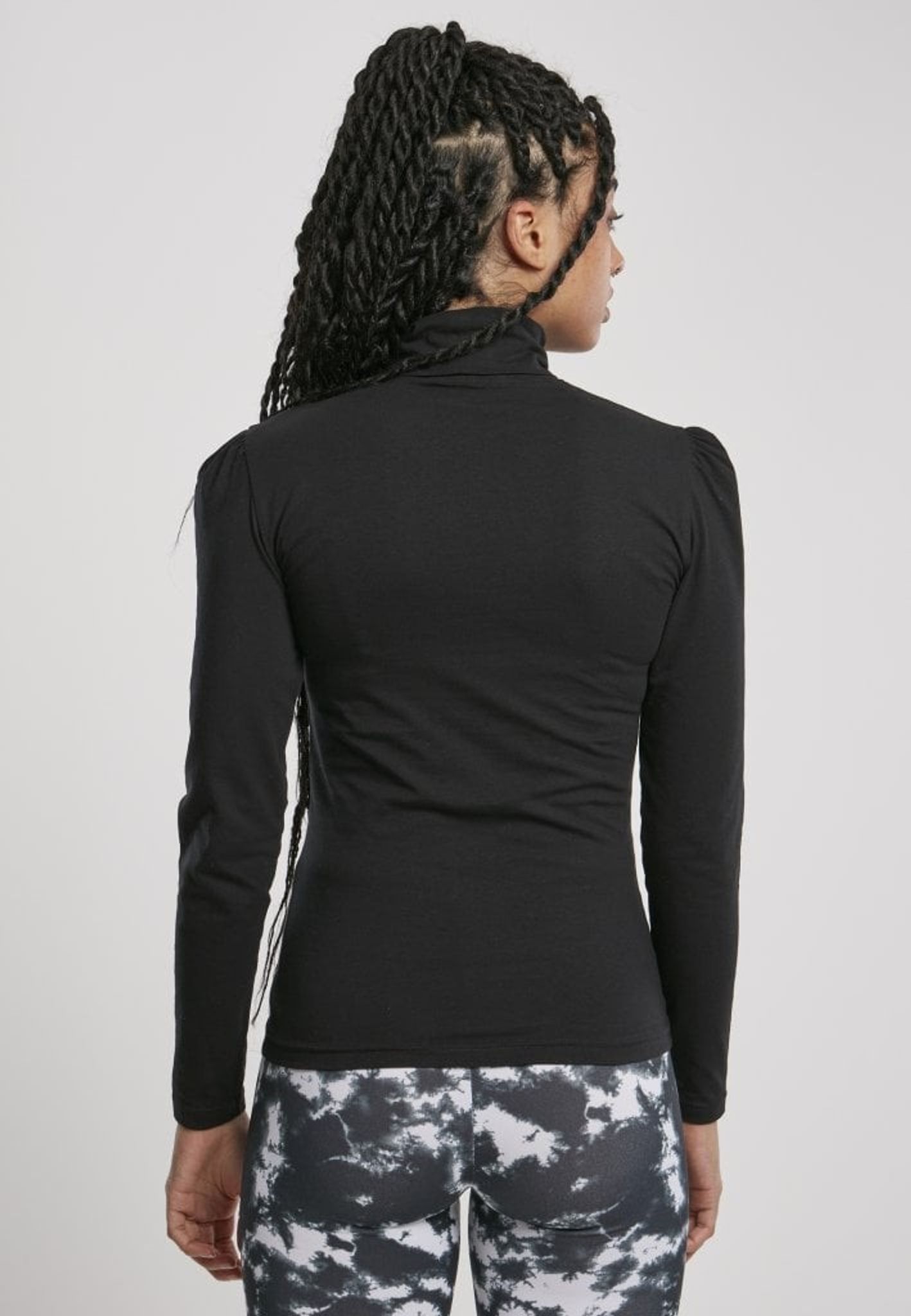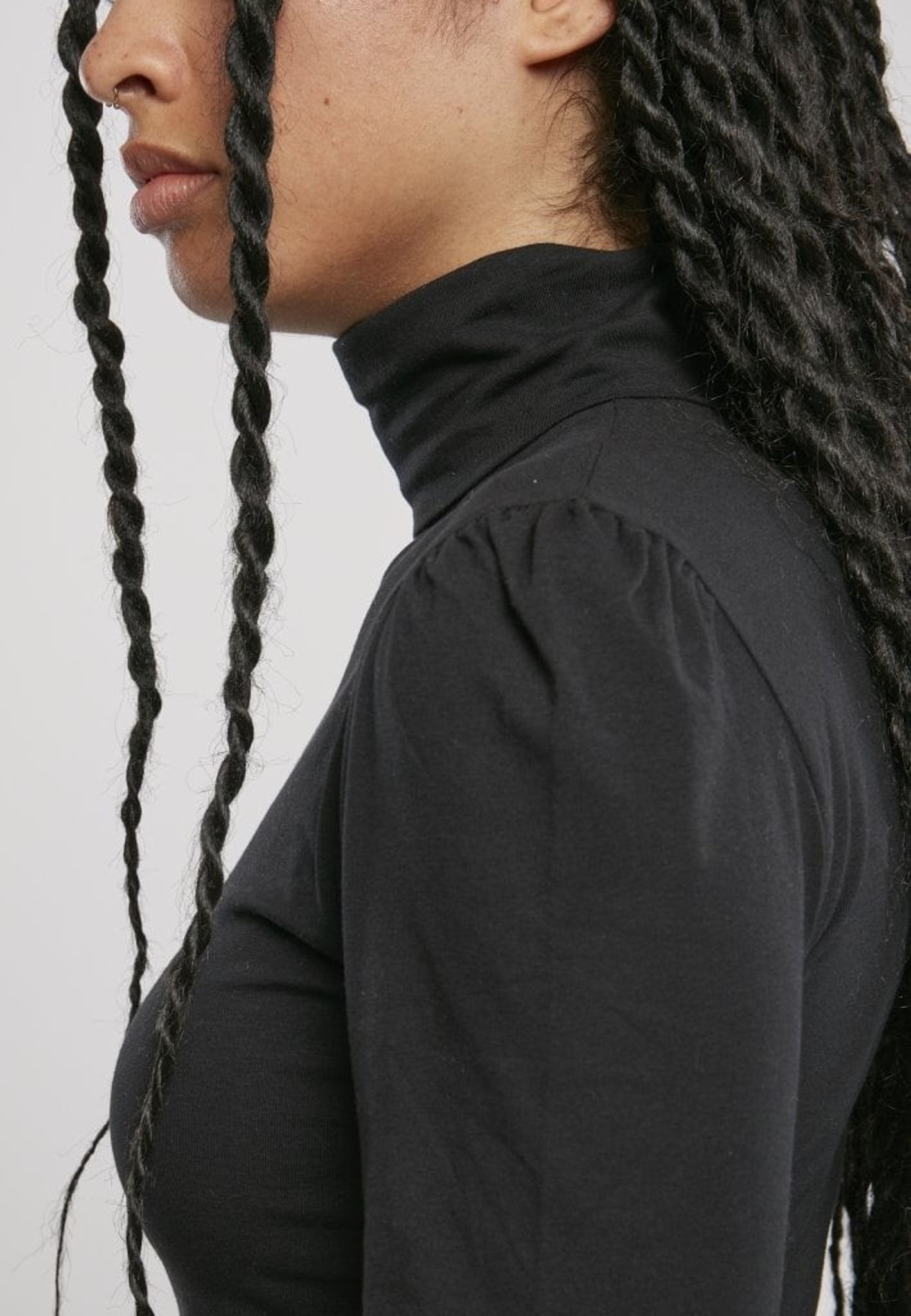 Trøjen er skræddersyet og nakken er høj, og ved skulderen er der en lille puffearm.