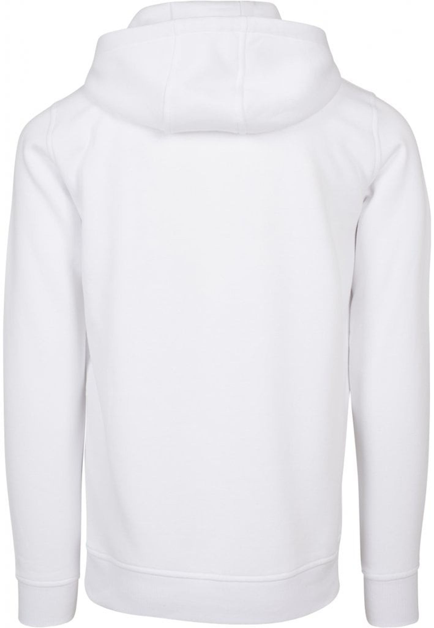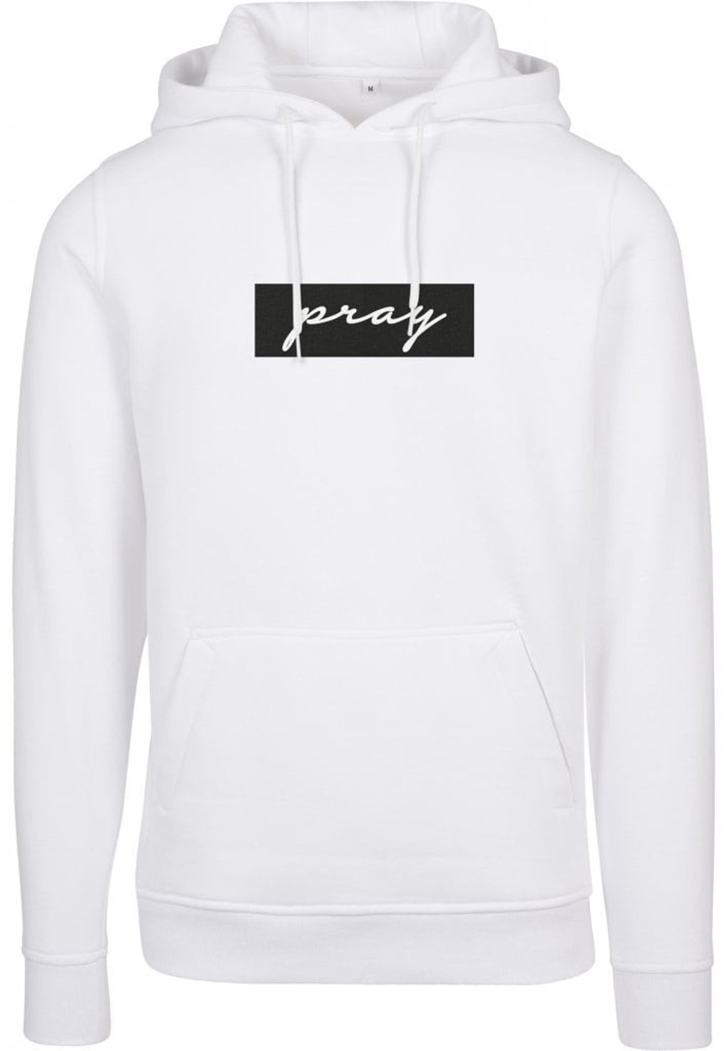 En hvid hættetrøje med teksten Pray indrammet i en sort boks.