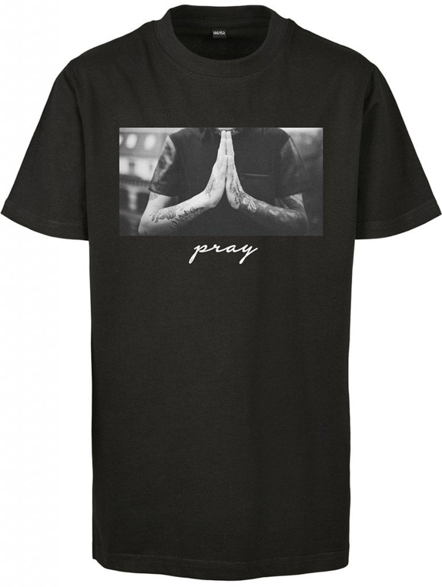 En hård T-shirt i barnestørrelser og et brystprint med tatoverede arme, der står og beder. Nedenfor er teksten "bed".