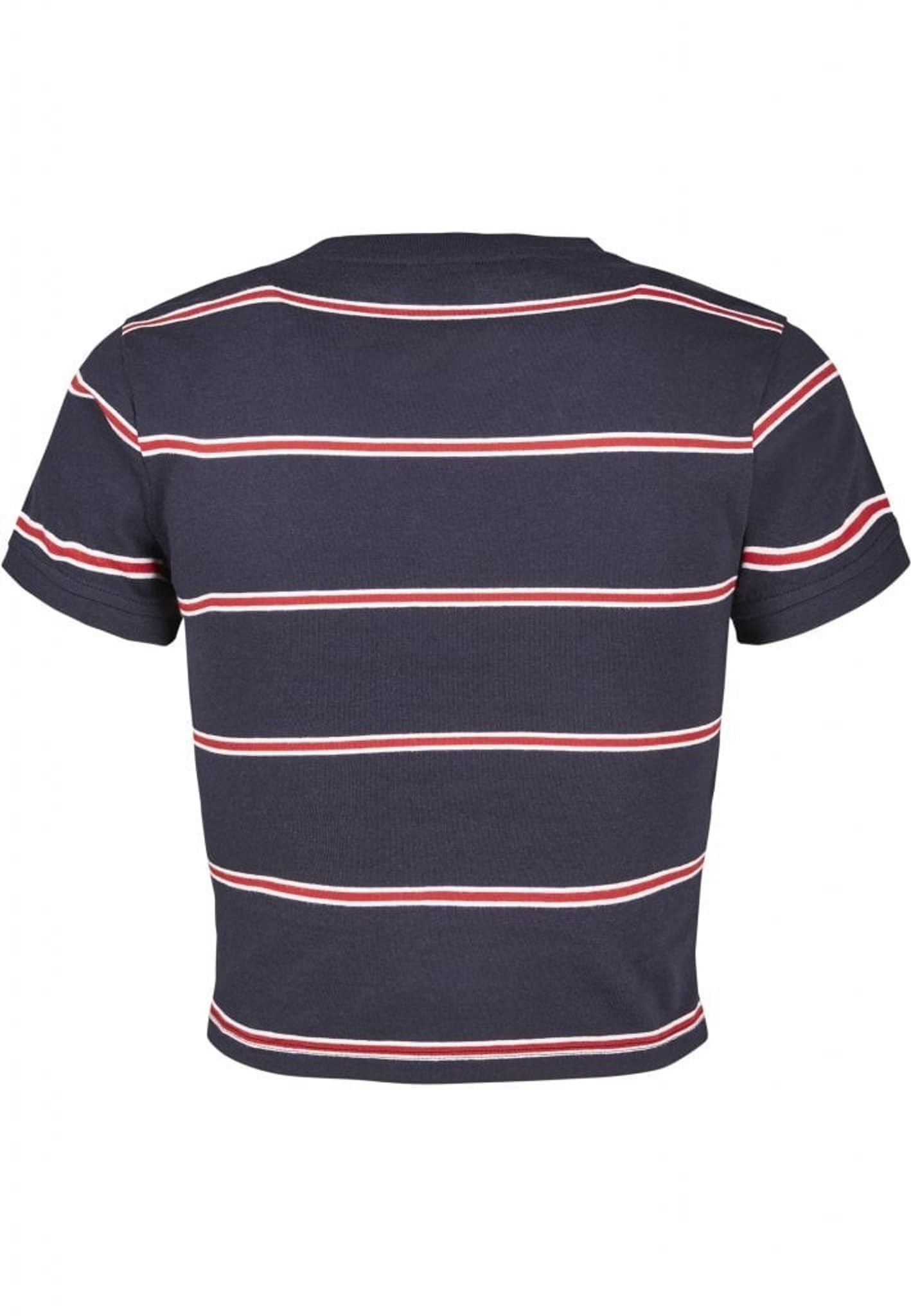 En blå t-shirt med røde og hvide striber, der slutter midt i maven.