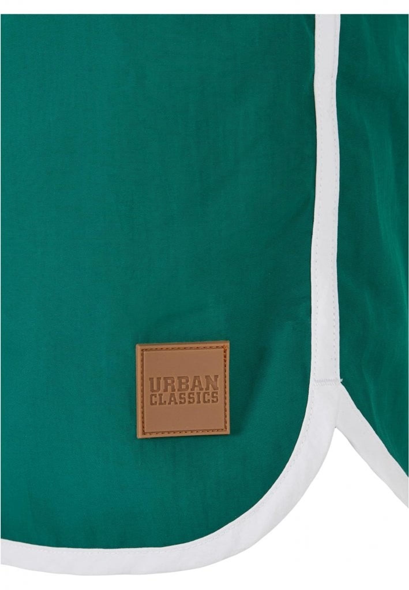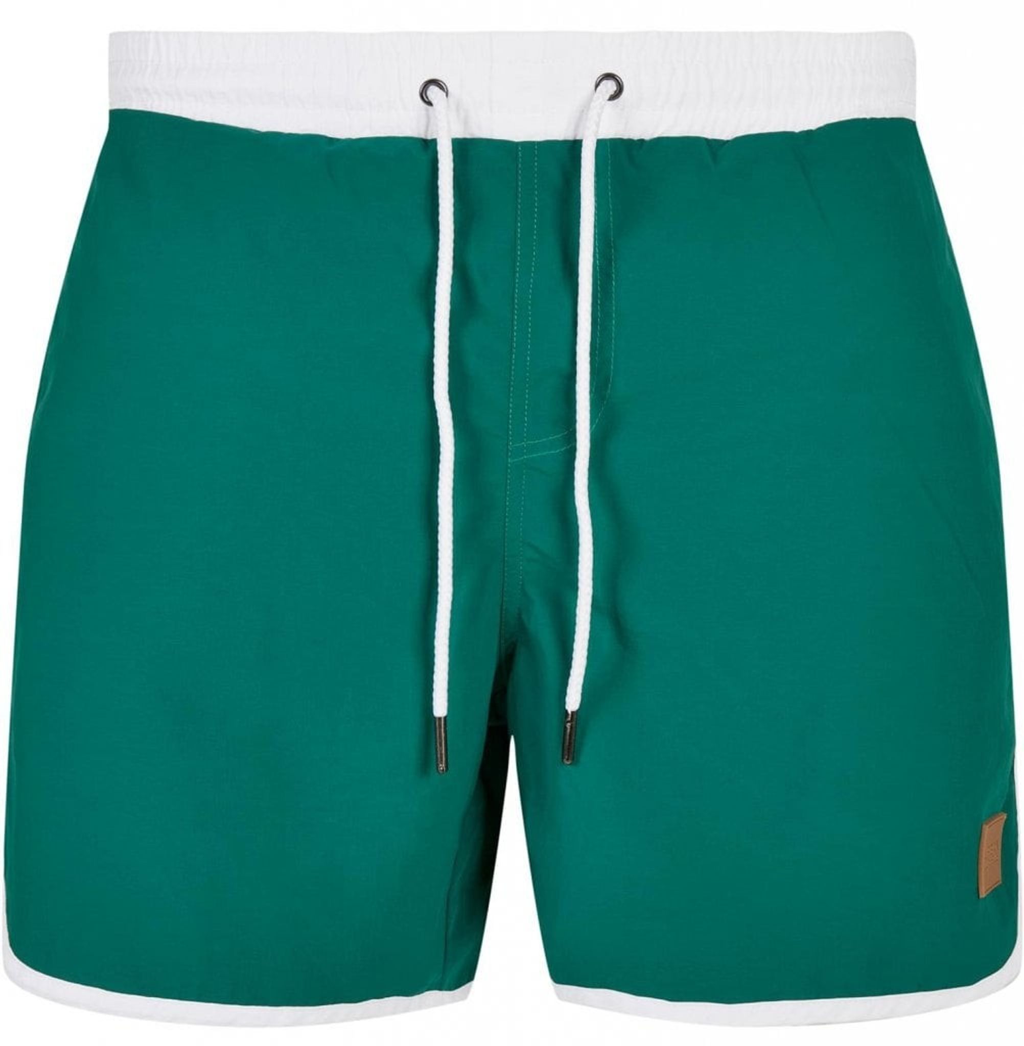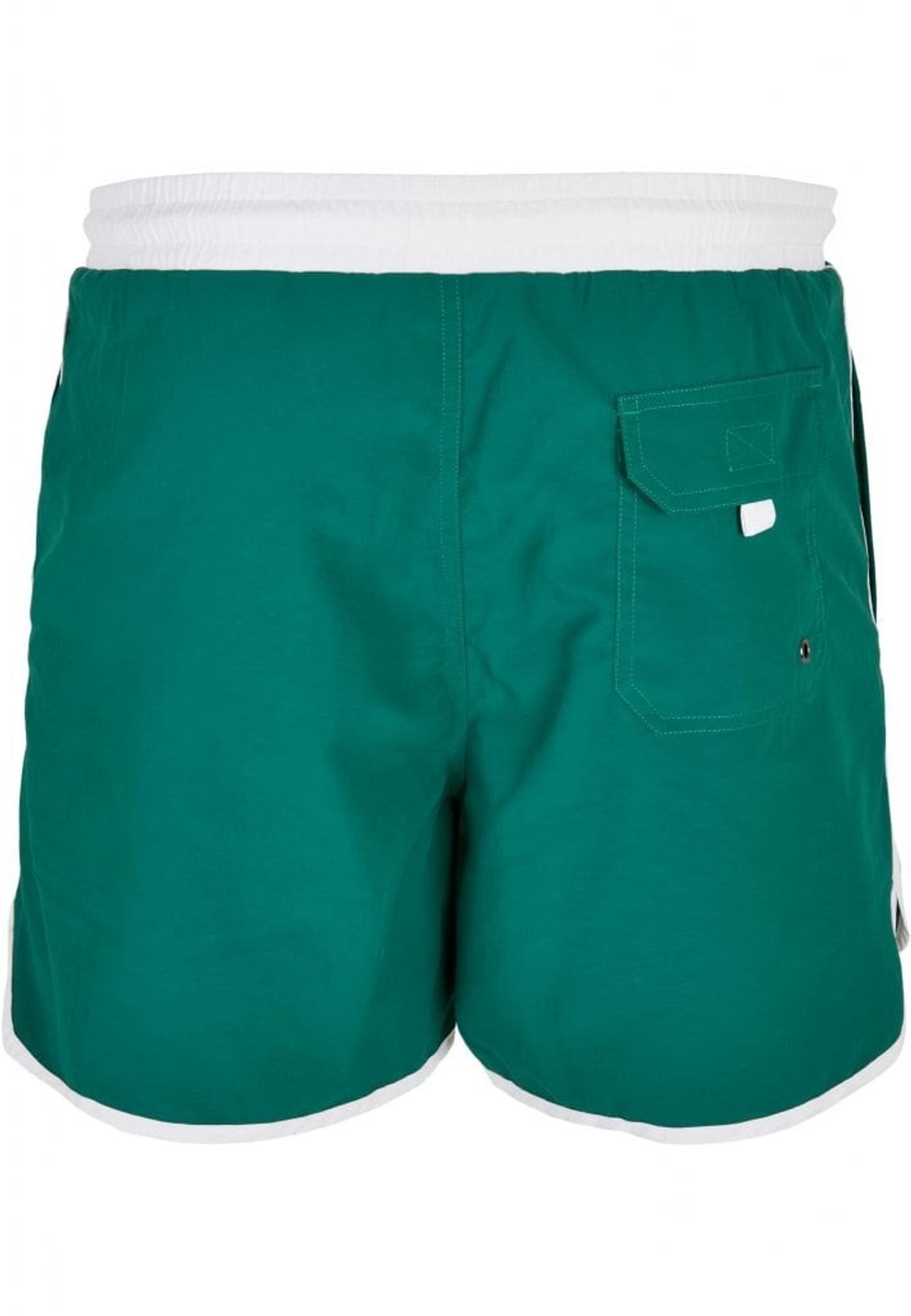 Et par stilfulde retro badeshorts i grønt stof med hvide kanter. Shortsene er udstyret med to åbne sidelommer og en baglomme med låg.