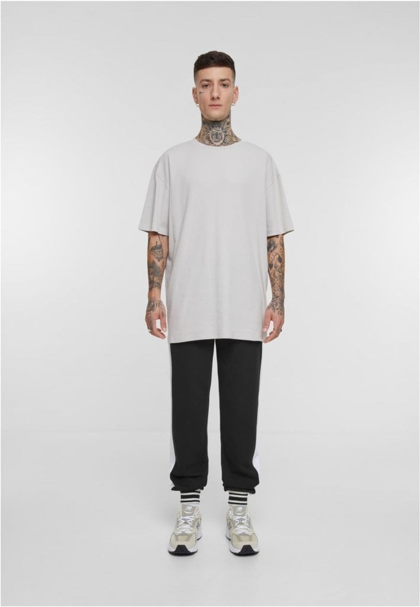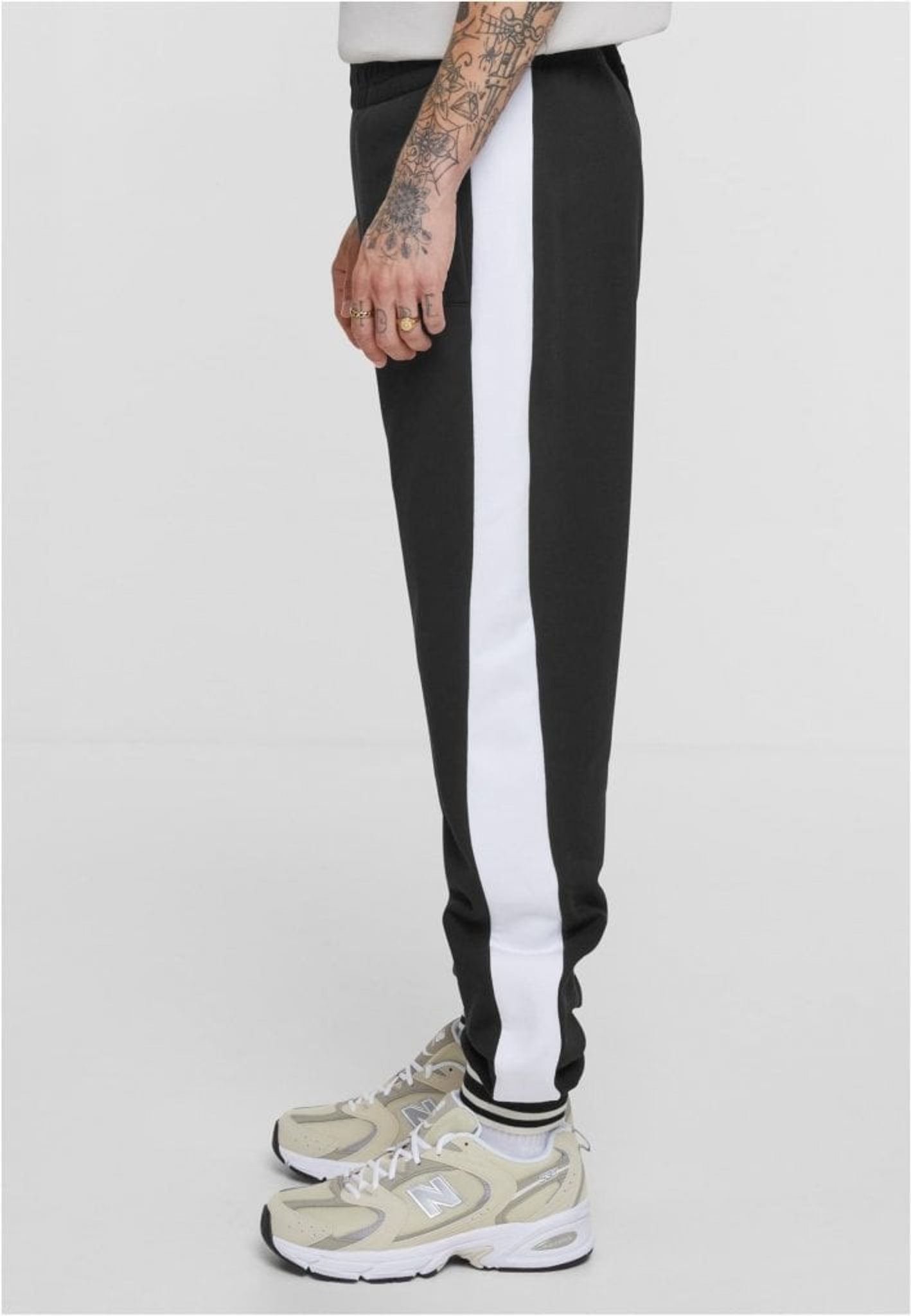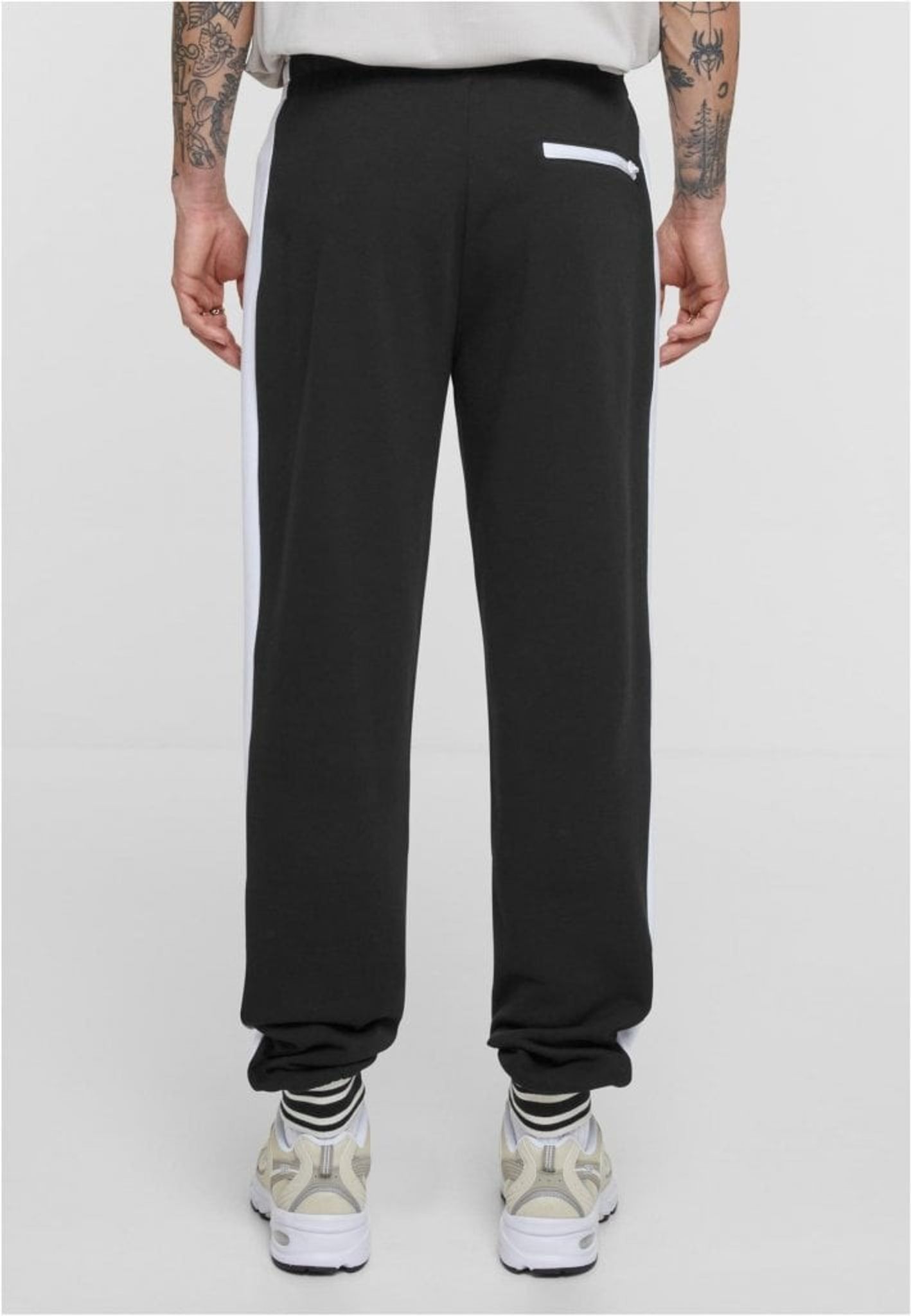 Retro Track Pants har et monokromt design og vil helt sikkert tiltrække opmærksomhed med deres iøjnefaldende bånd langs siderne. Disse bånd giver det klassiske design et moderne twist, hvilket gør dem perfekte til både fritids- og træningstøj. De stribede ribmanchetter på buksebenene giver en retro-følelse, der minder om tidligere epoker.