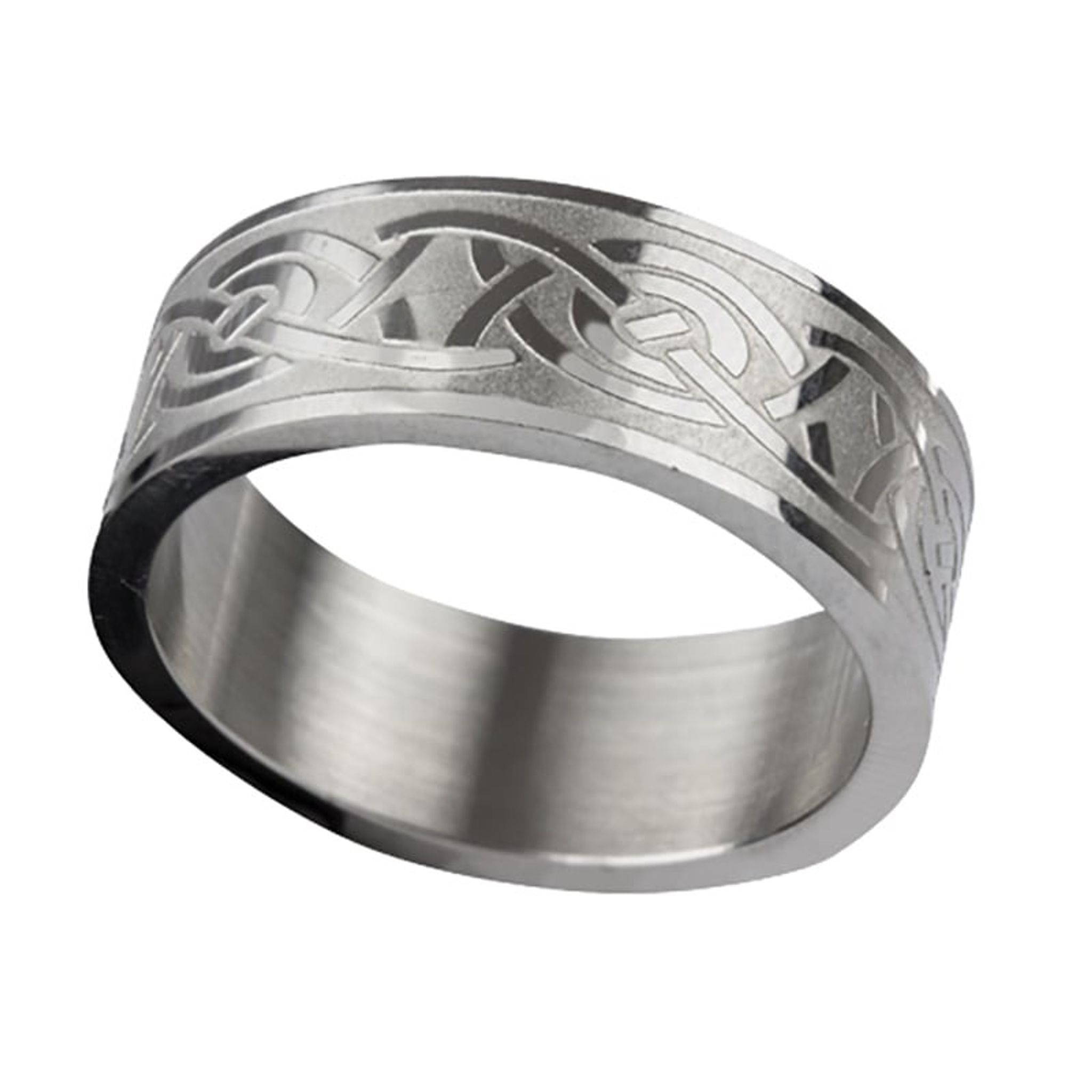 En pænt designet ring med et mønster indgraveret med laser i rustfrit stål.