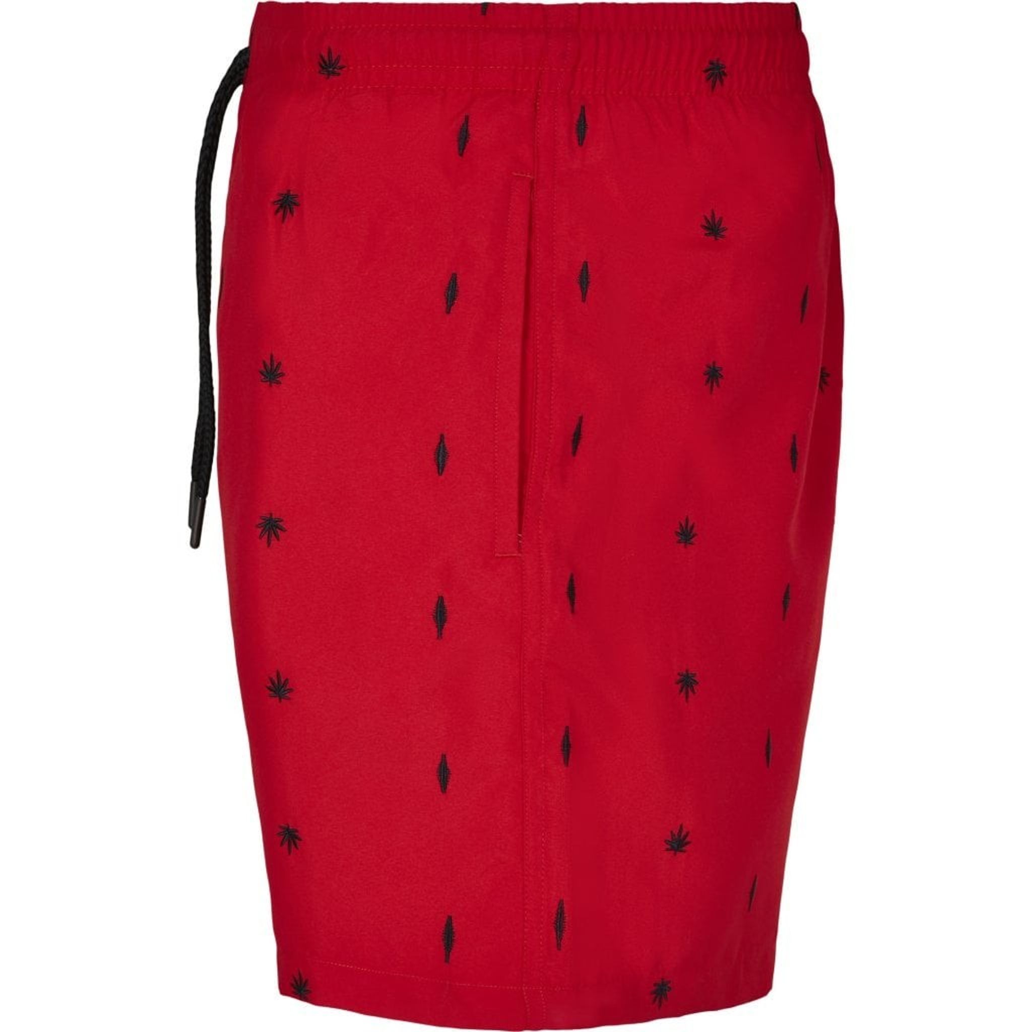 Røde badebukser med broderede blade.