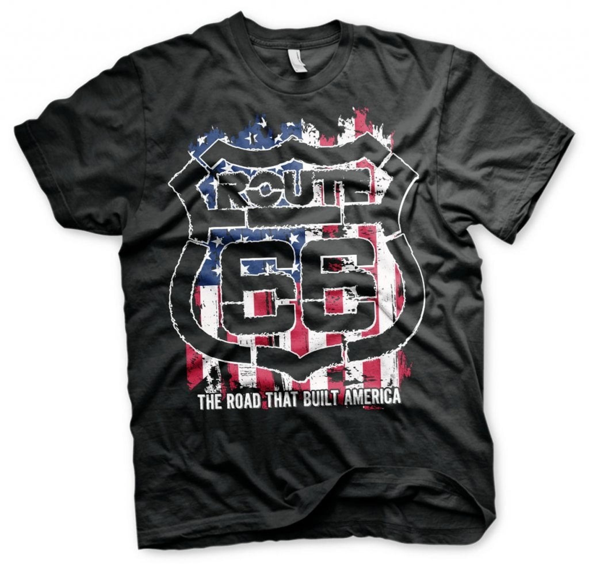 Har du altid drømt om at gå i gang med en eventyrlig rejse langs rute 66 i en kølig bil med vinden i dit hår? Så er denne T-shirt perfekt til dig! Med sit store motiv af den ikoniske amerikanske landevej og det slidte amerikanske flag foran logoet til rute 66, vil du virkelig føle dig som en ægte vejtripper!