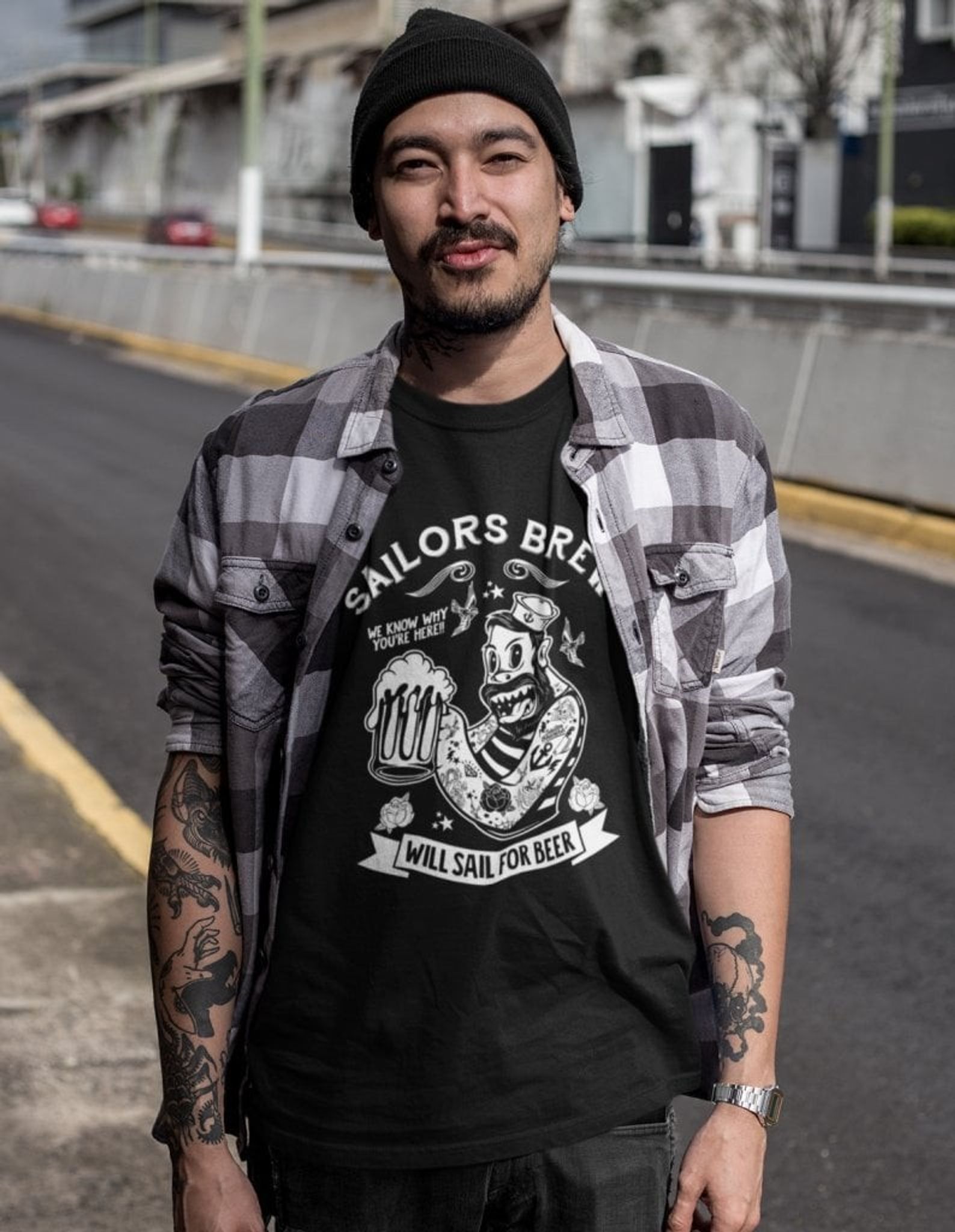 Hvis du nogensinde har undret dig over motivationen bag sømandens liv, skal du ikke lede længere. Med denne T-shirt bliver alt klart. Designet med teksten "SAILORS BREW - We know why you're here. I WILL SAIL FOR BEER" giver et humoristisk nik til enhver, der kan forestille sig at sejle over syv have, bare for at få fat i en kold øl.