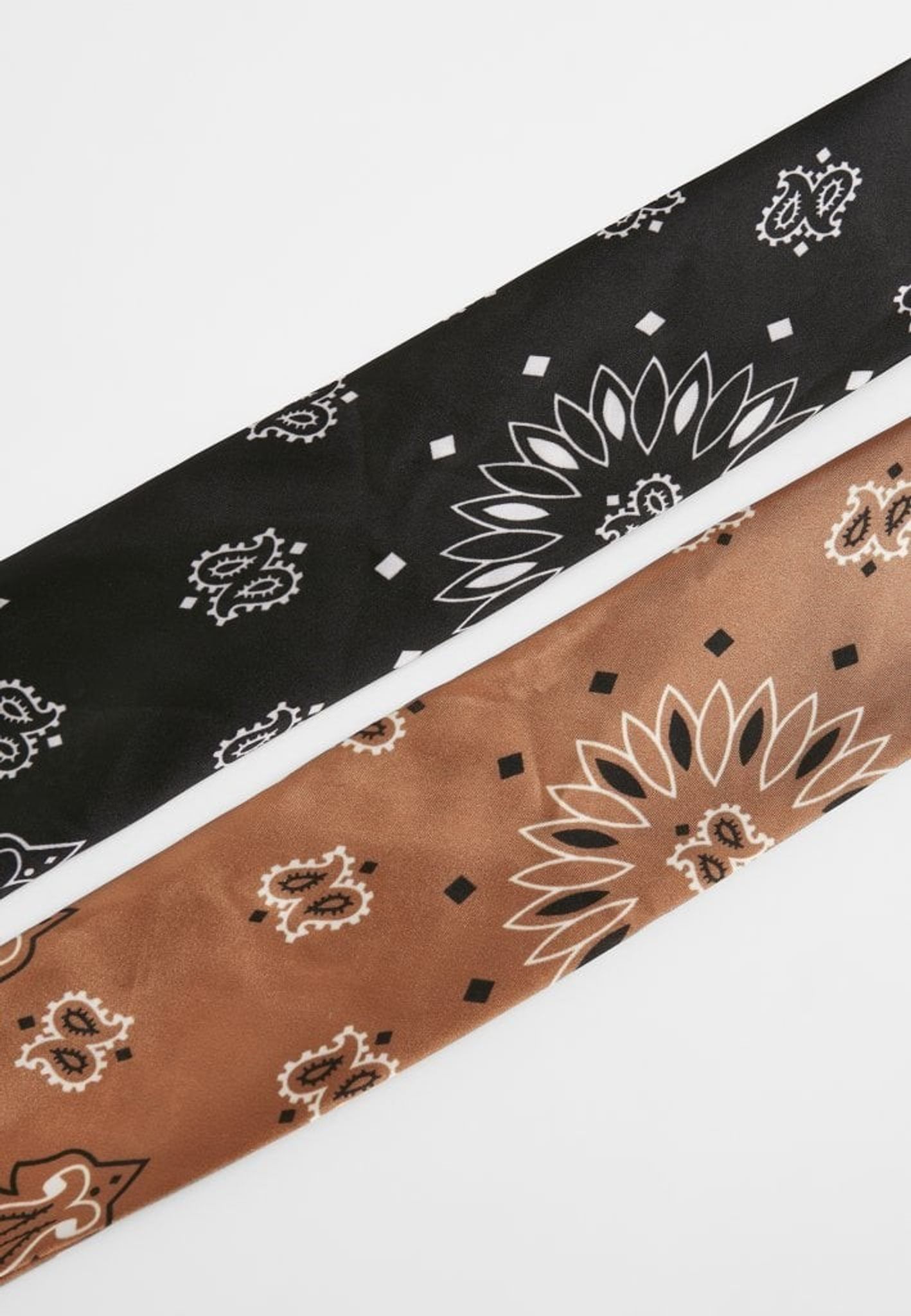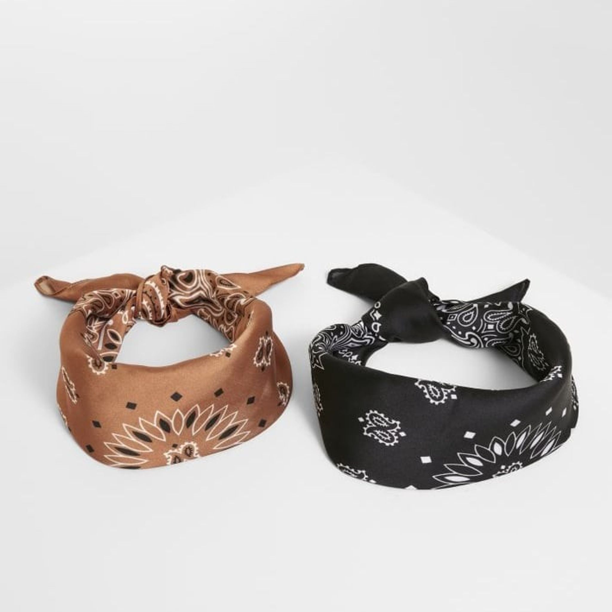 2-pack bandanas med farverne sort og cognac. I modsætning til den klassiske bandana i bomuldsstof er disse bandanas lavet af let satinpolyester.