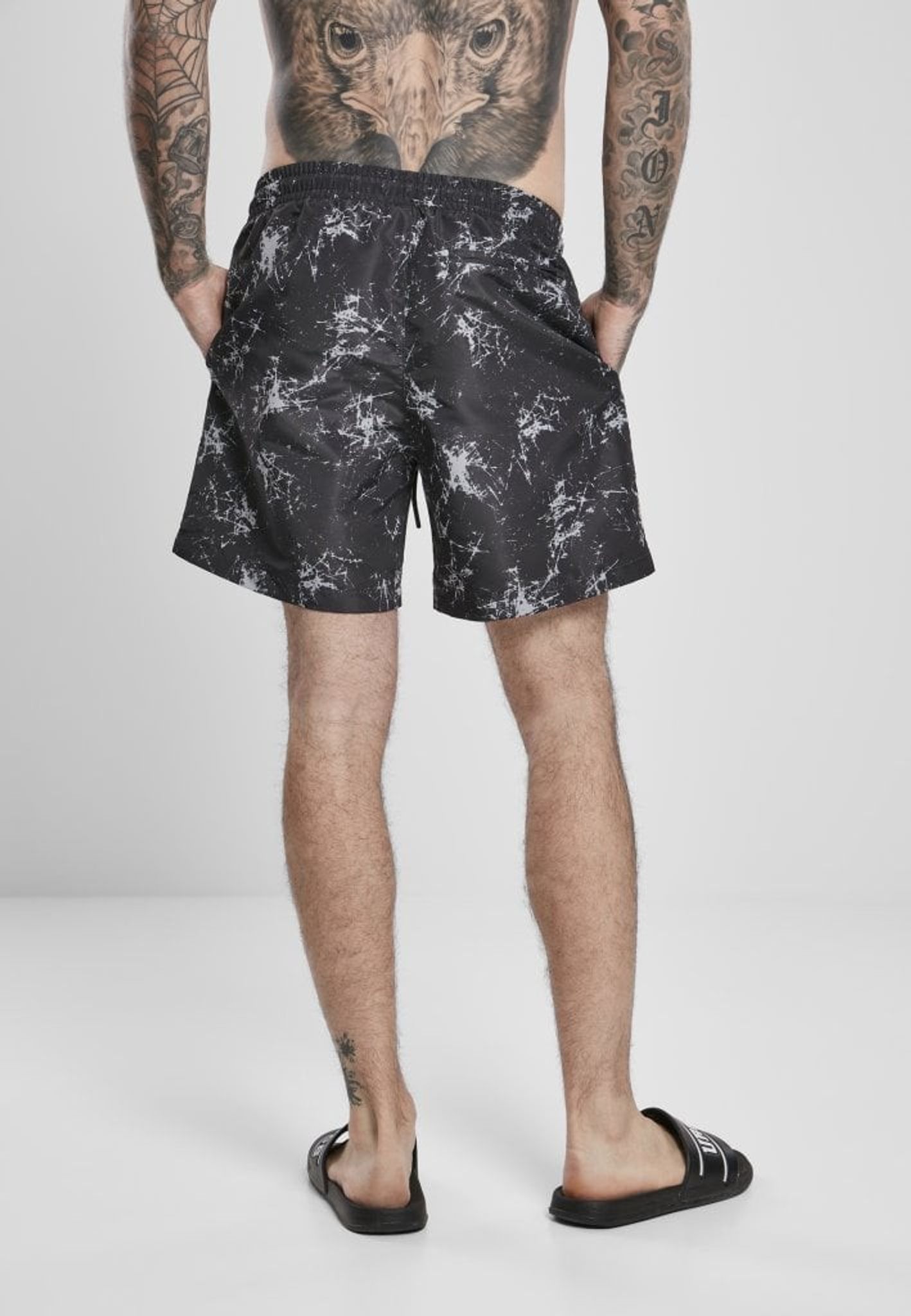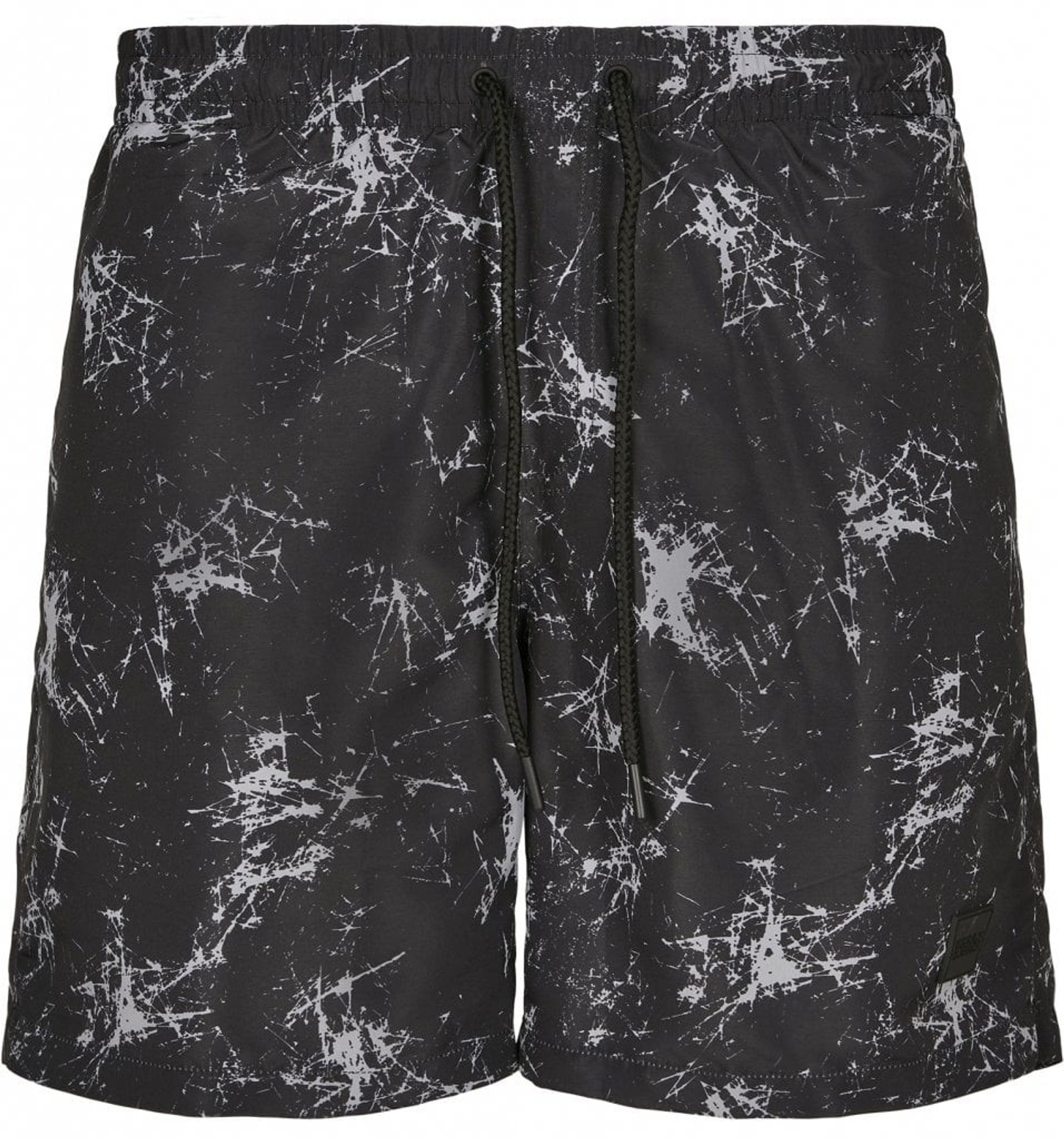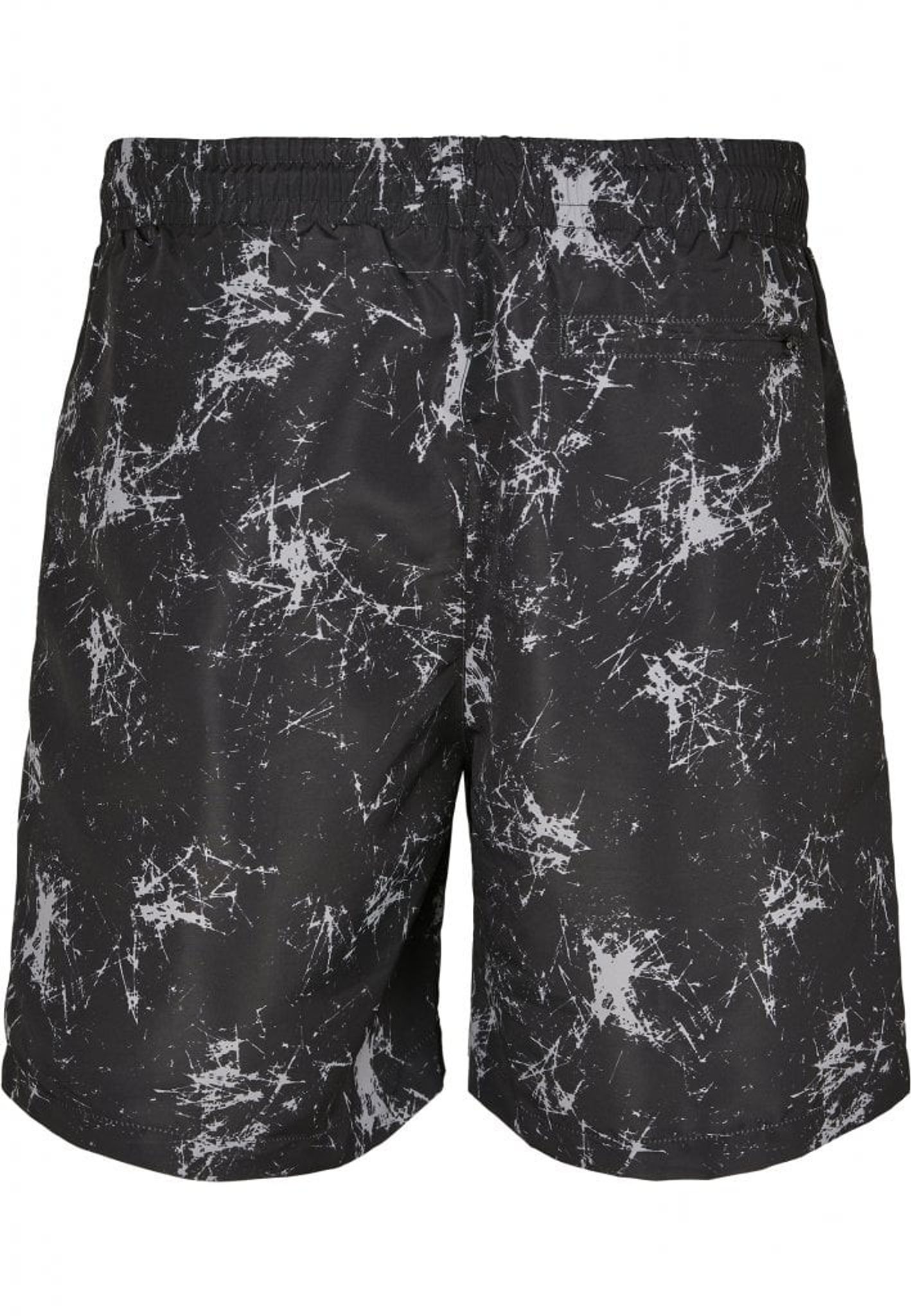 Et par kølige badeshorts med et tryk der ligner ridser i stofoverfladen.