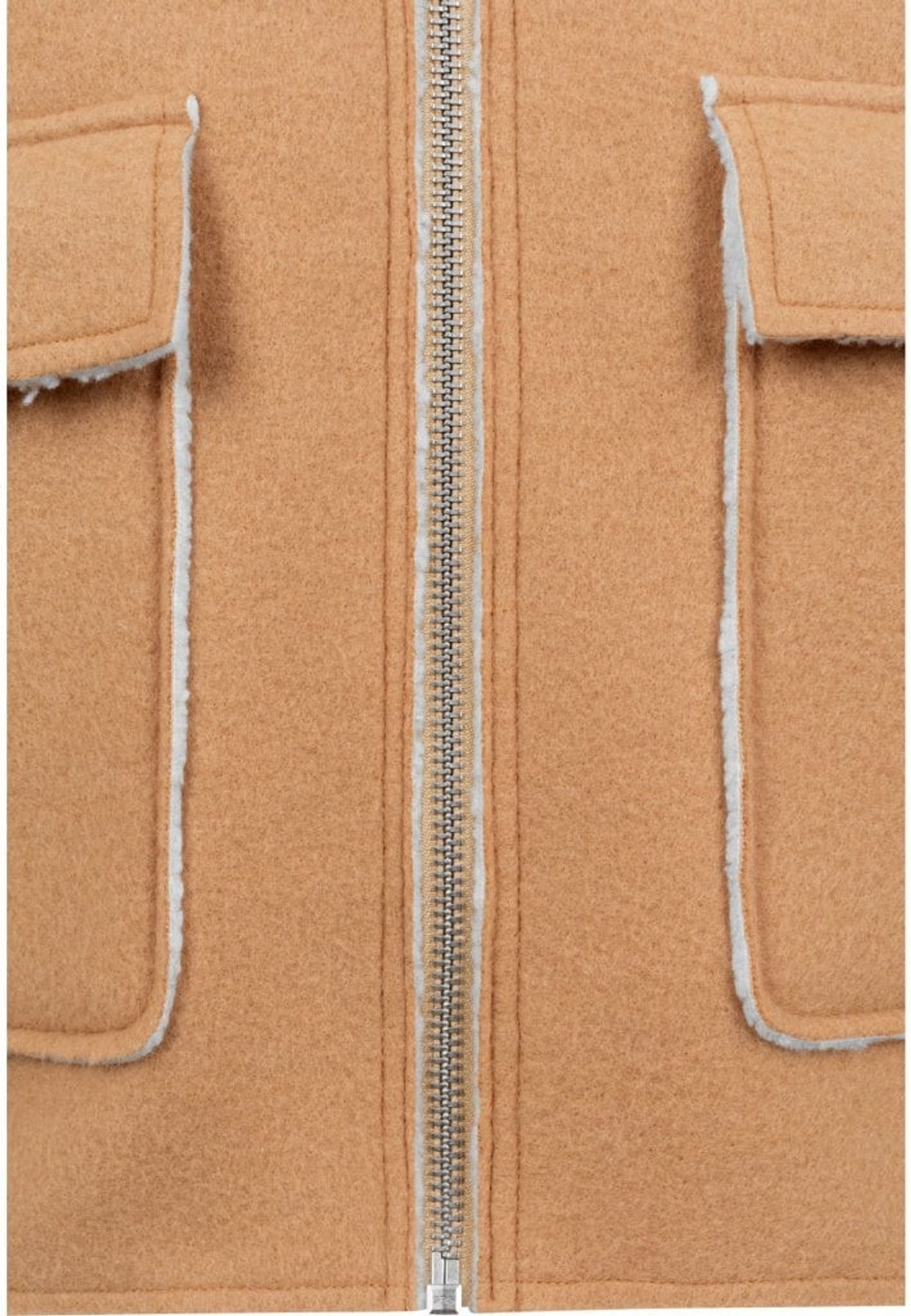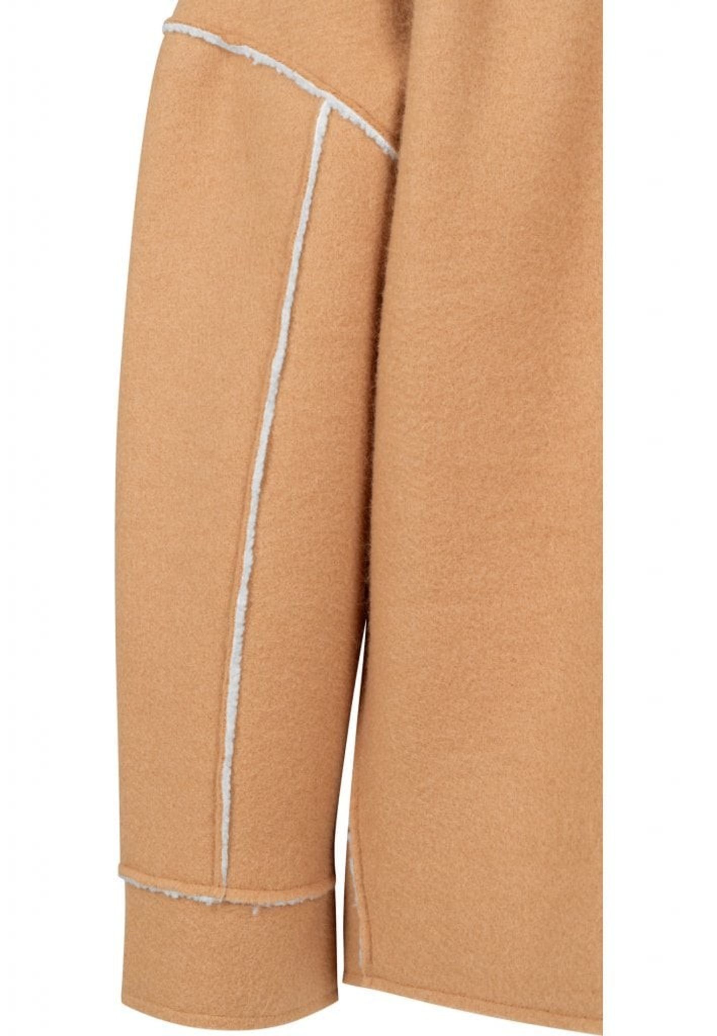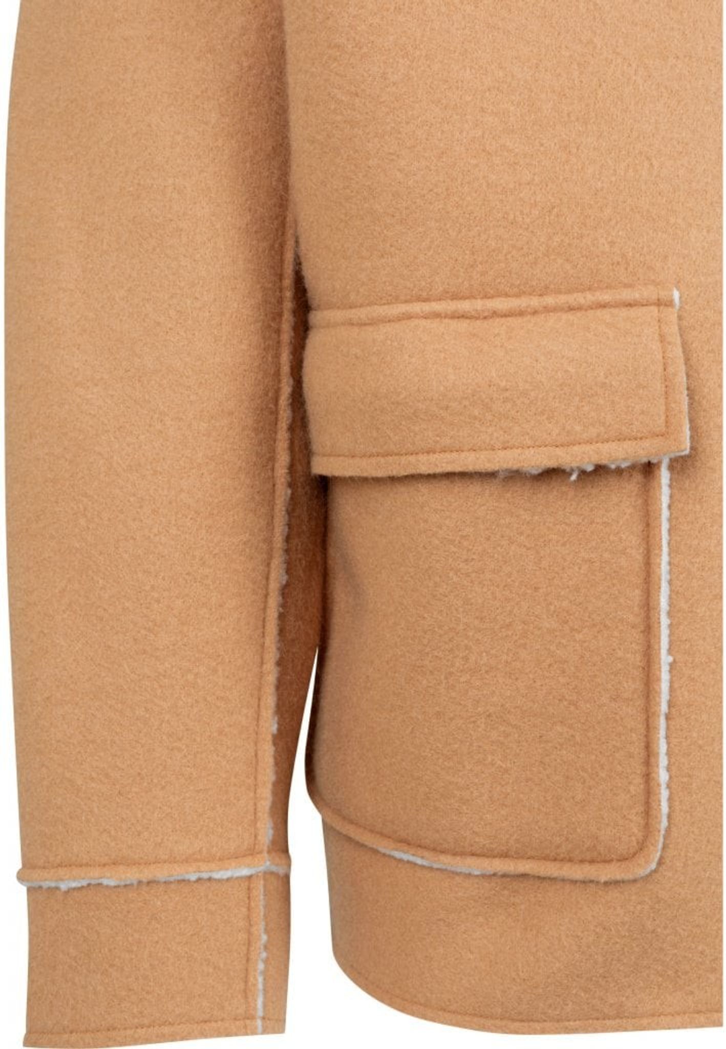 En hård jakke i kamelfarvet ruskindimitation og sherpa-pels på indersiden og krave.
