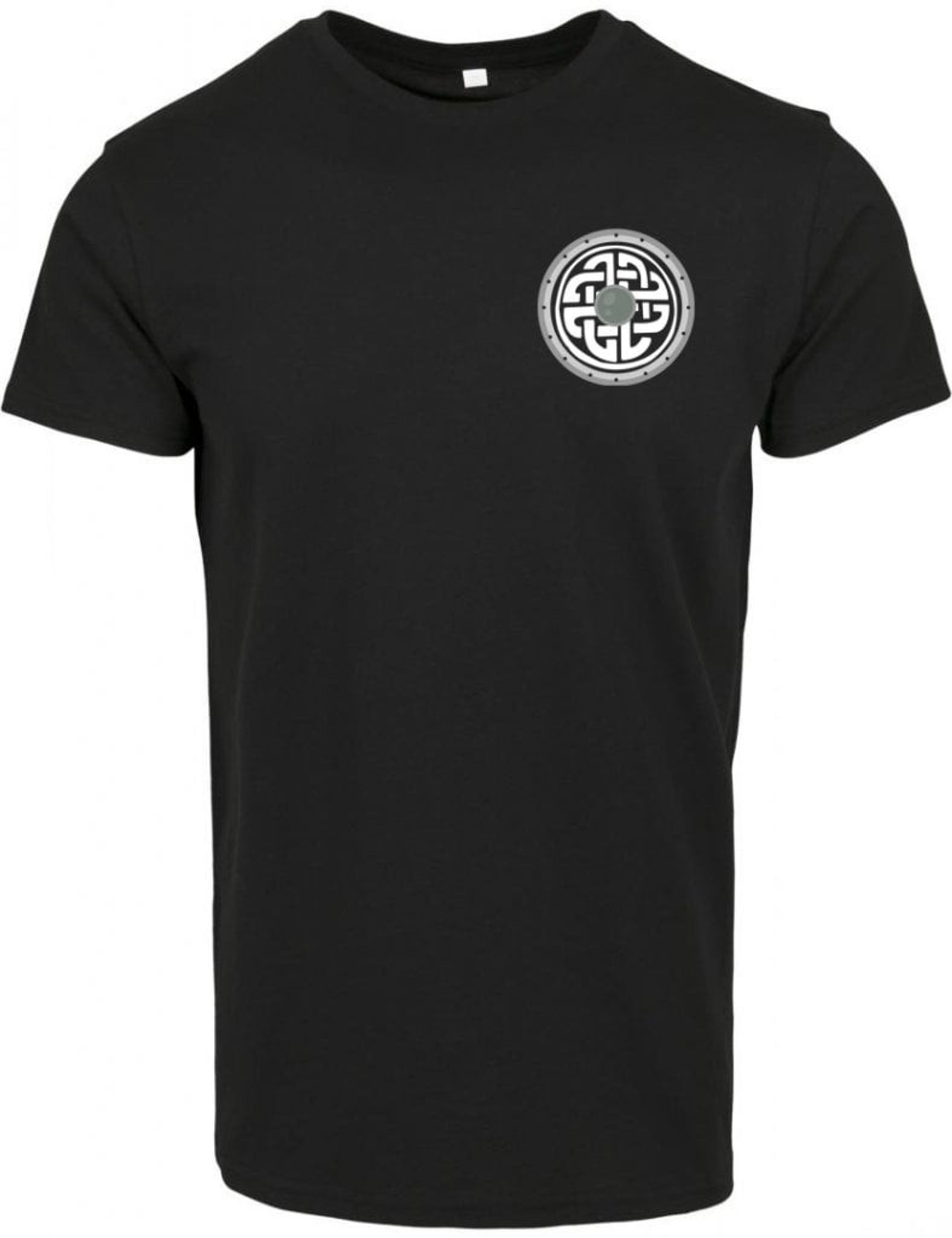 En stilfuld T-shirt med et vikingeskjold trykt på brystet. På skjoldet er der en keltisk knude i en rund version.