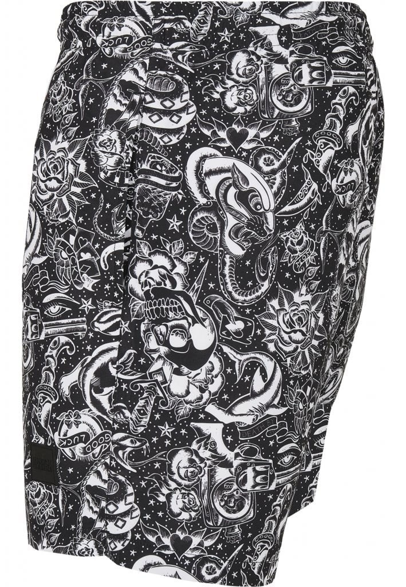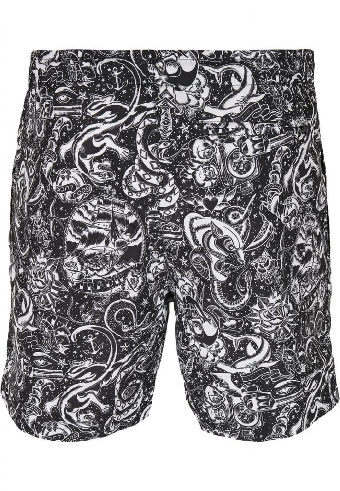 Et par svømmeshorts med et vanvittigt mønster. Masser af symboler er komprimeret og danner nu et dekorativt mønster i hvidt mod den sorte baggrund.
