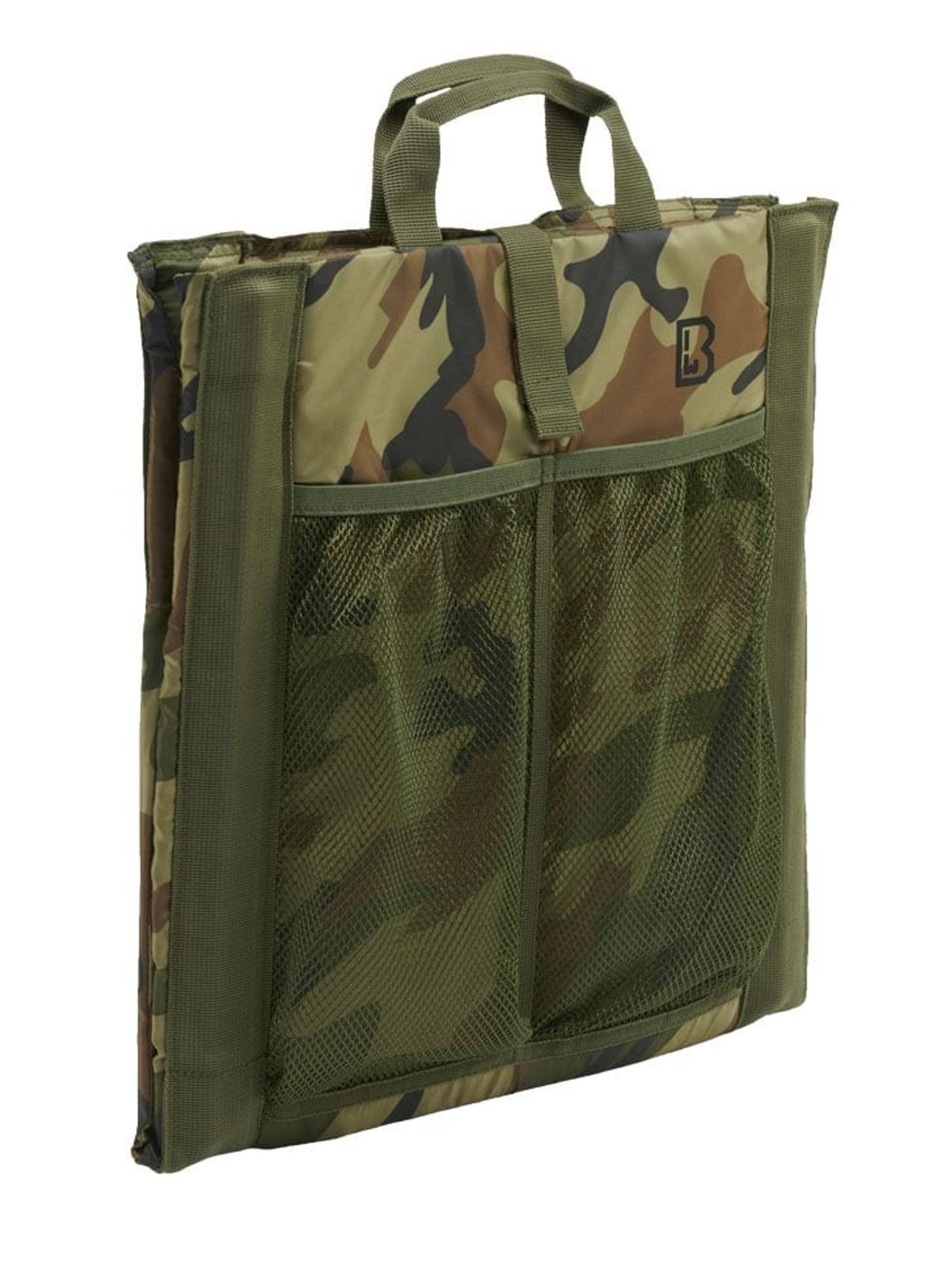 En praktisk siddepude i camouflage og med et stabilt ryglæn. Sædeunderlaget er også udstyret med bærehåndtag, der gør det let at bære denne foldestol.