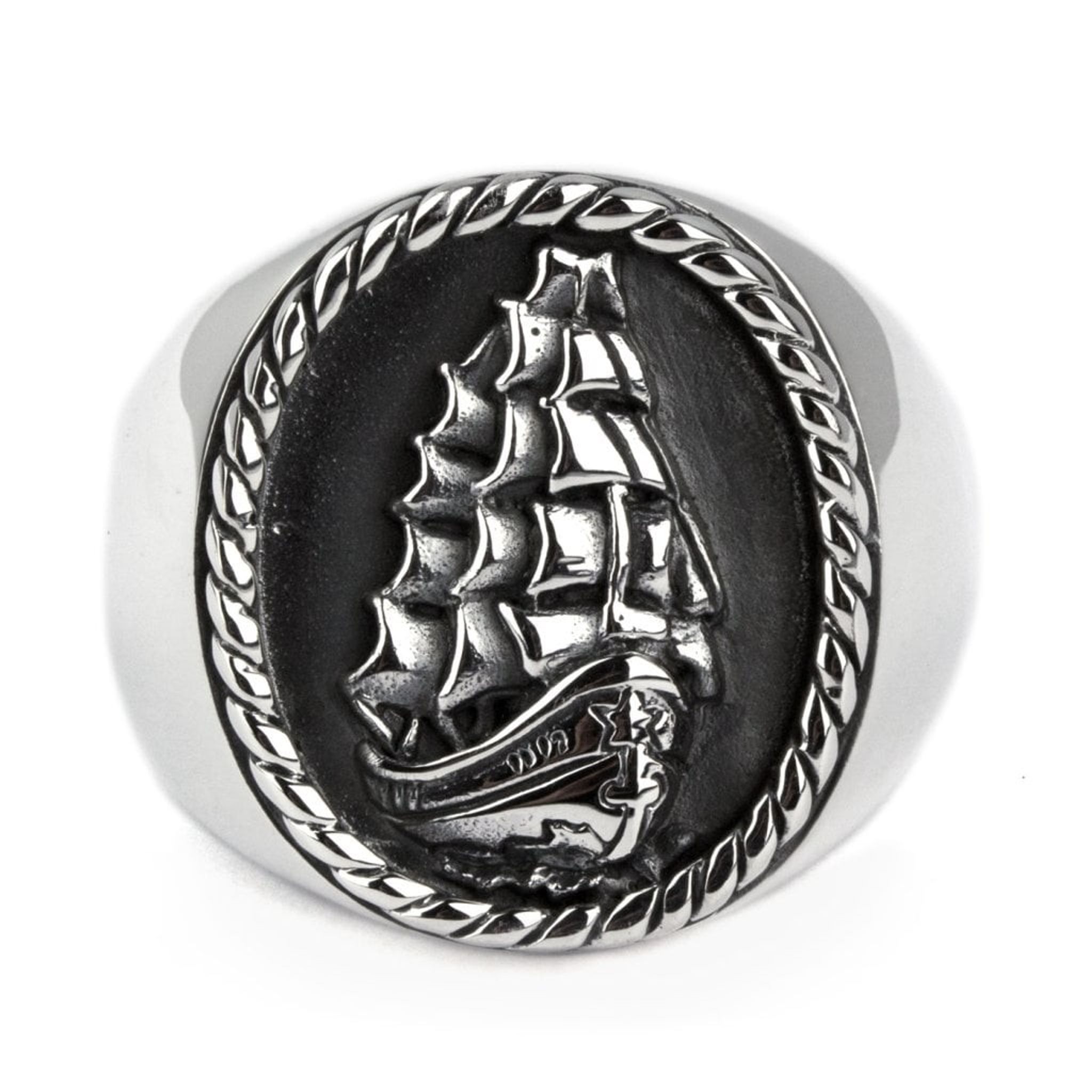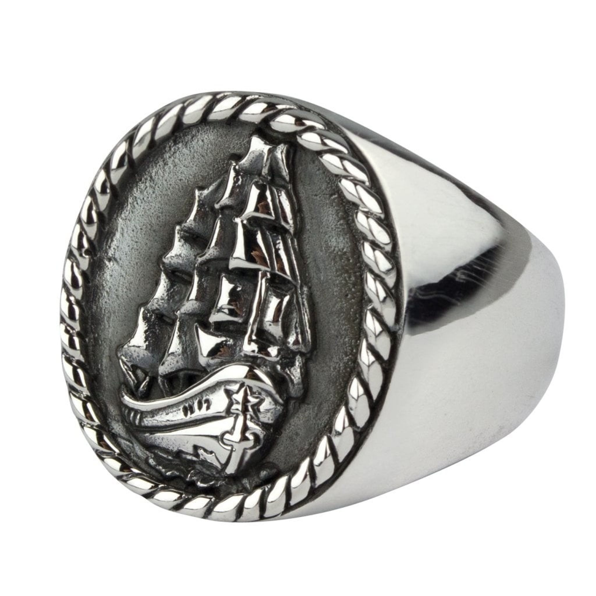 En sølvring med et stort skib, der trækker ud fra fairway.