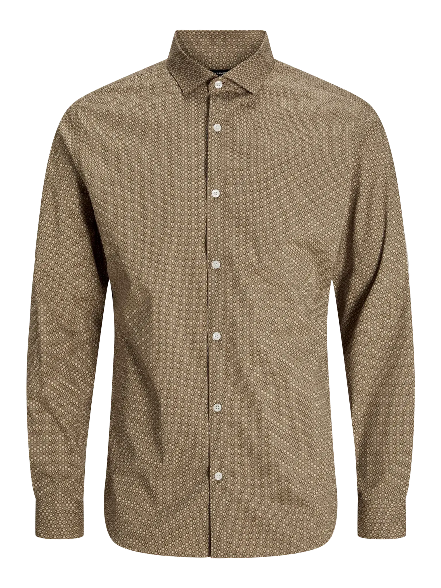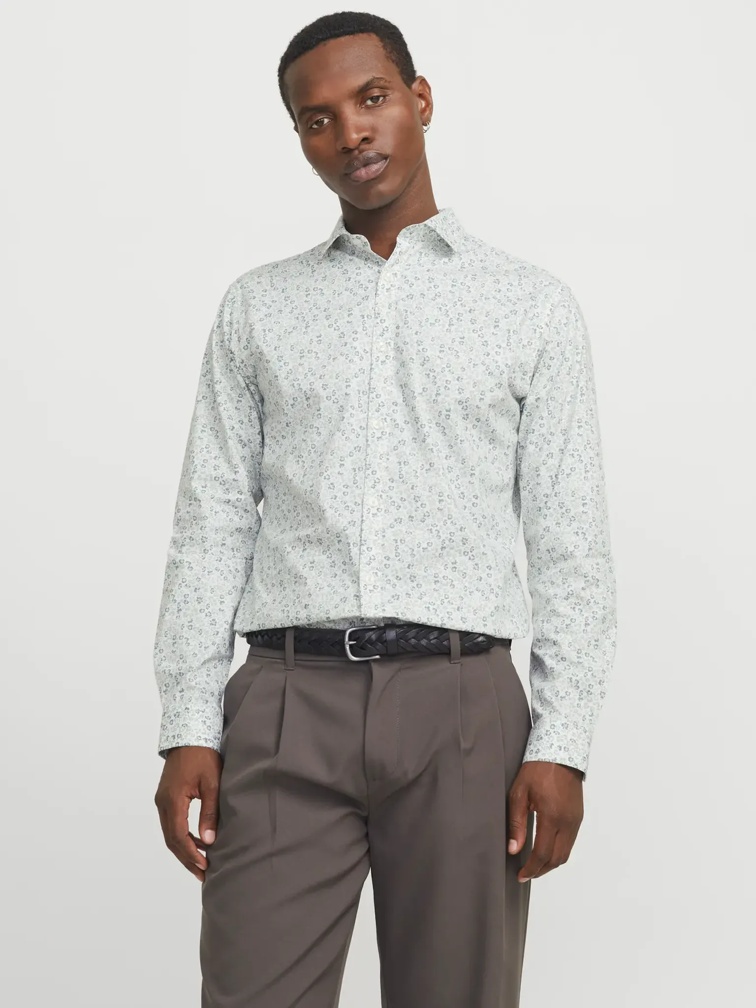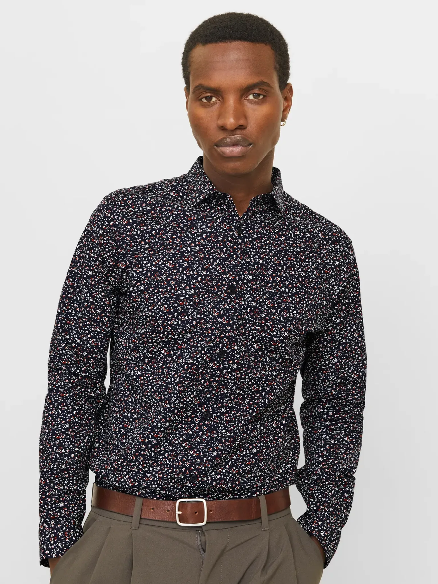 Skjortan har en klassisk skjortkrage och stängs med knappar, vilket ger en sofistikerad finish. Den smala passformen framhäver en modern silhuett och ger ett välvårdat intryck.
