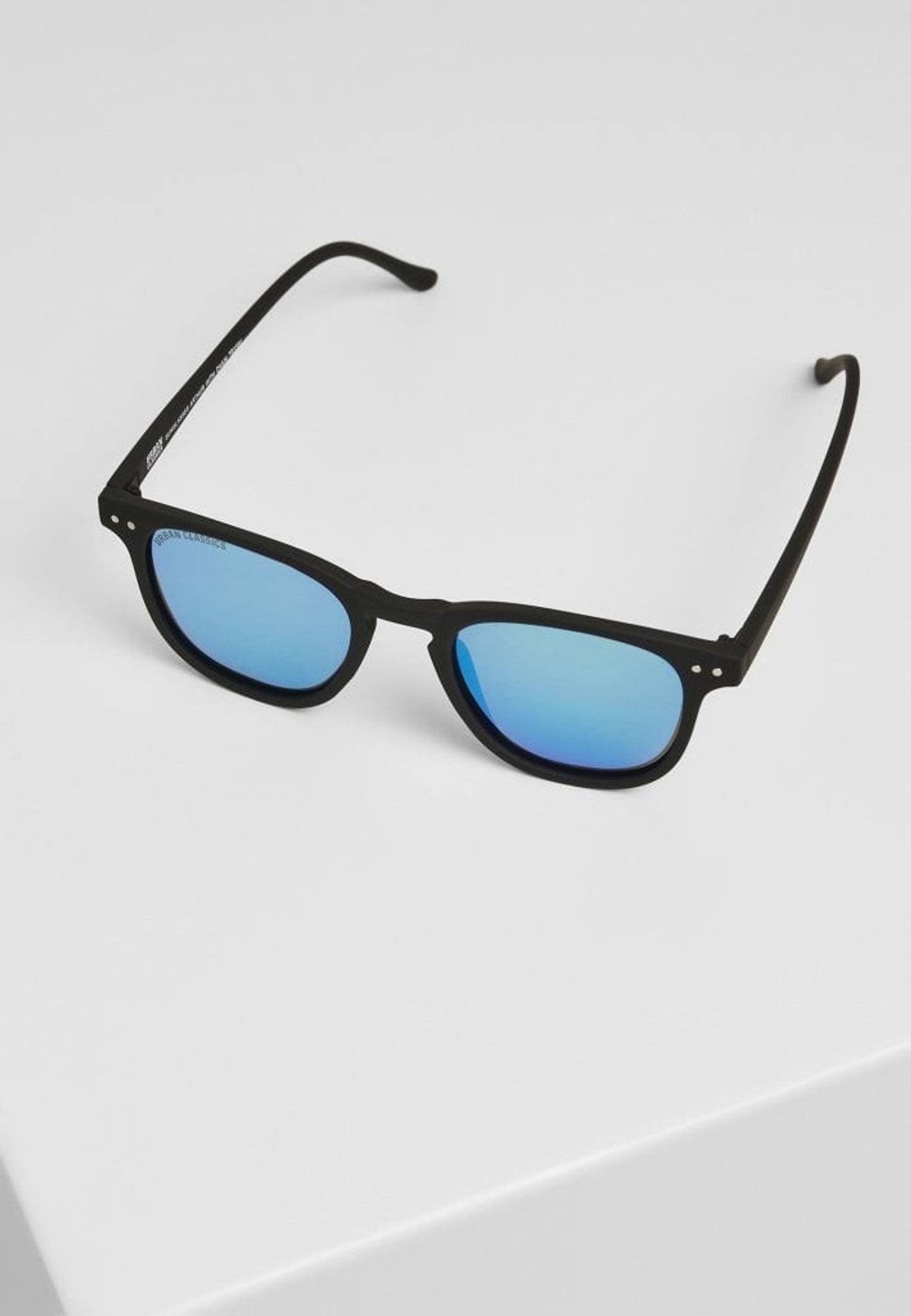 Sorte solbriller med blåt spejleglas og kæde til fastgørelse omkring buerne.