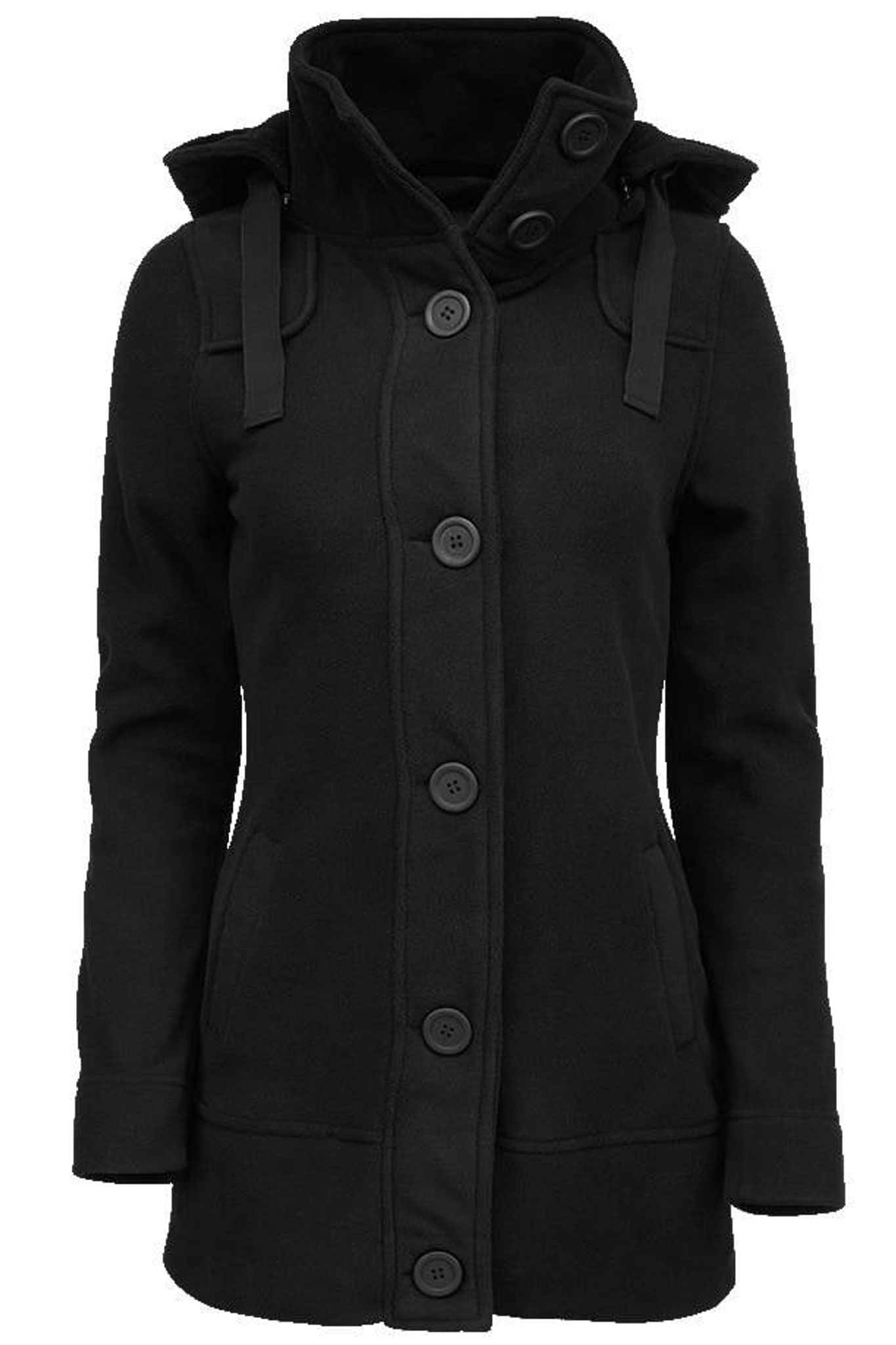 Frakken har en aftagelig hætte, der lukkes med lynlås.