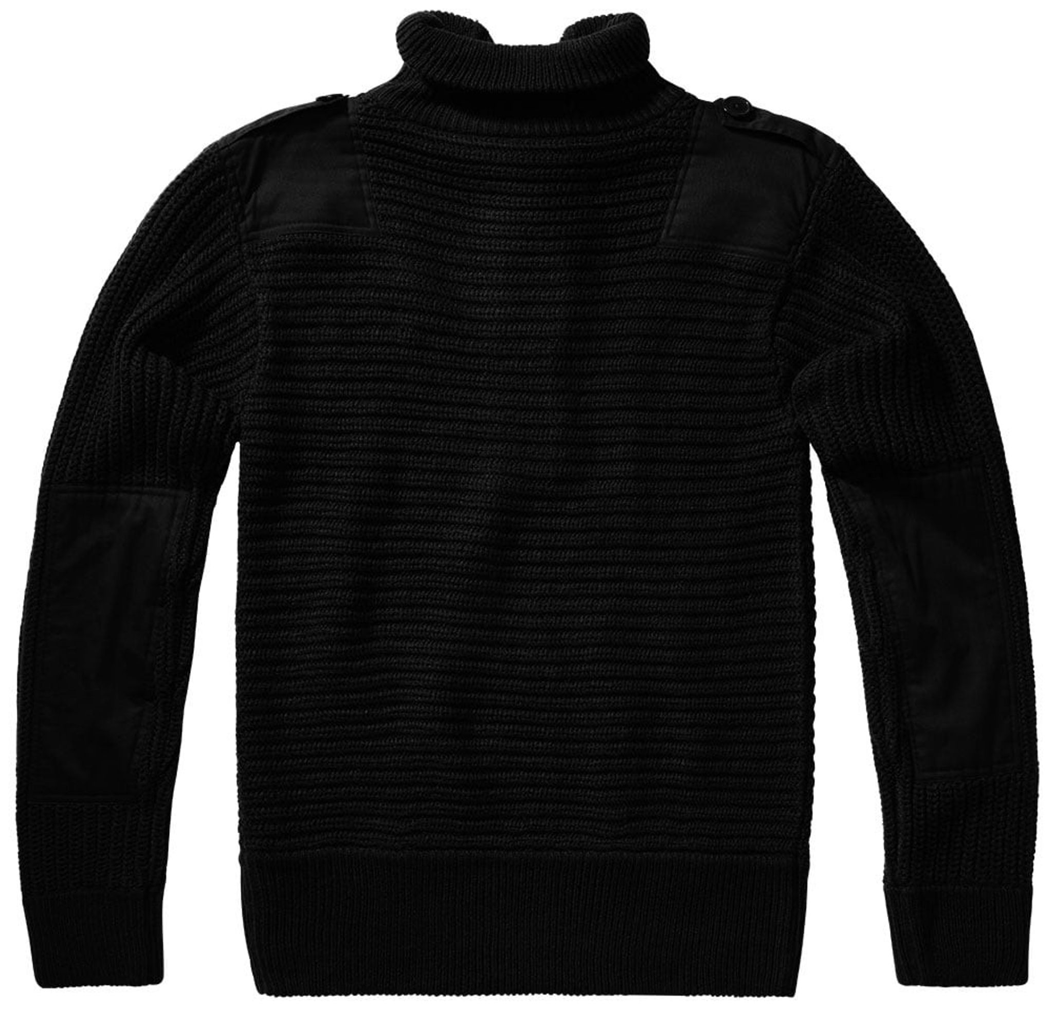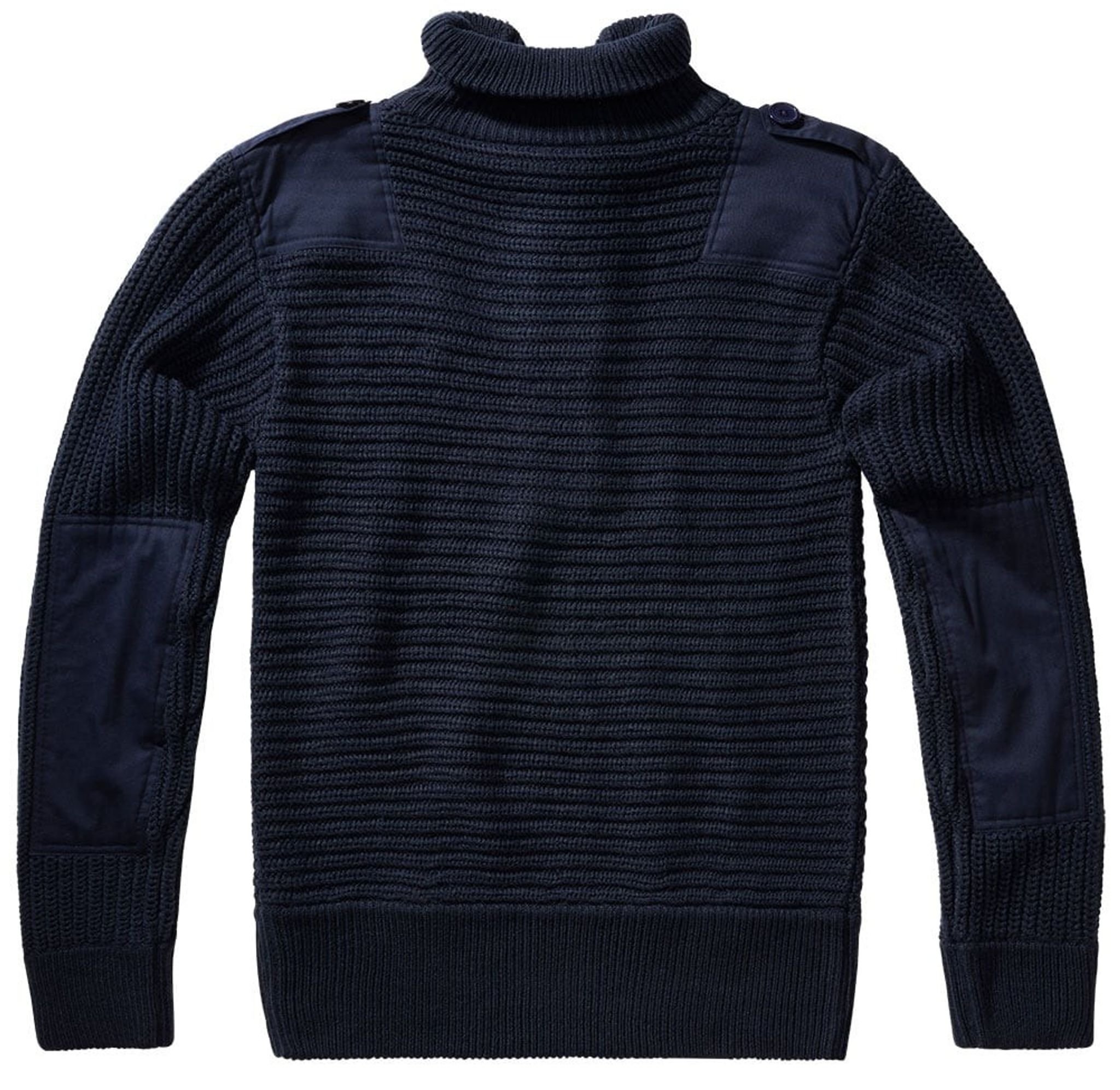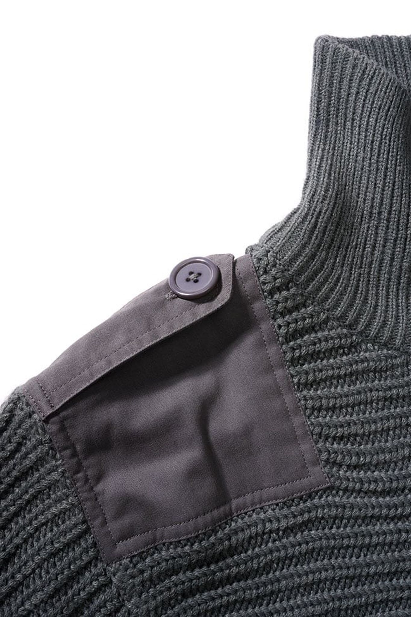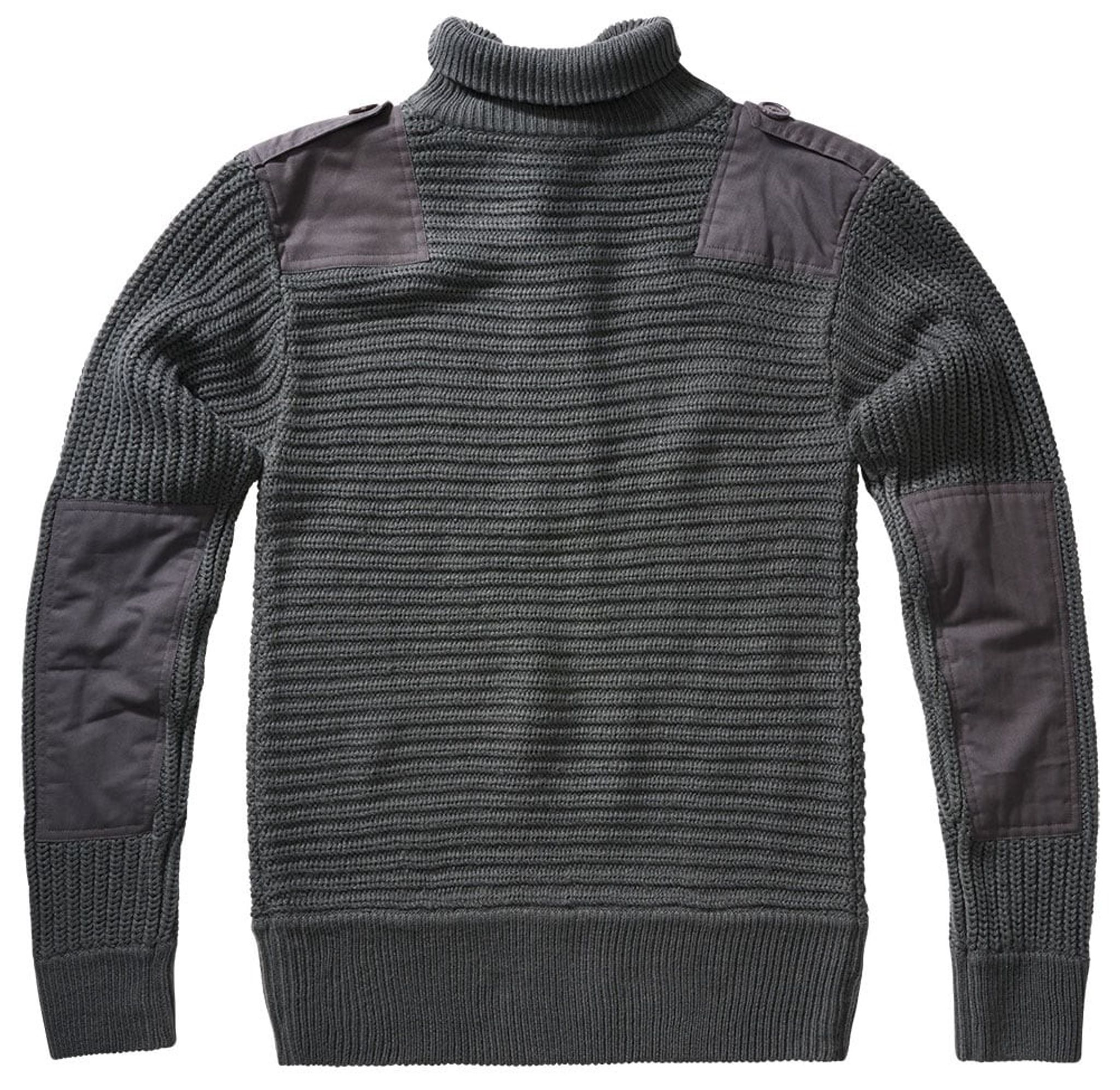 Ved manchetter og talje er der brede elastiske manchetter. Albuer og skuldre er forstærket, og skuldrene er udstyret med faner. Den strikkede sweater har en høj hals, der er knapper med matchende knapper.