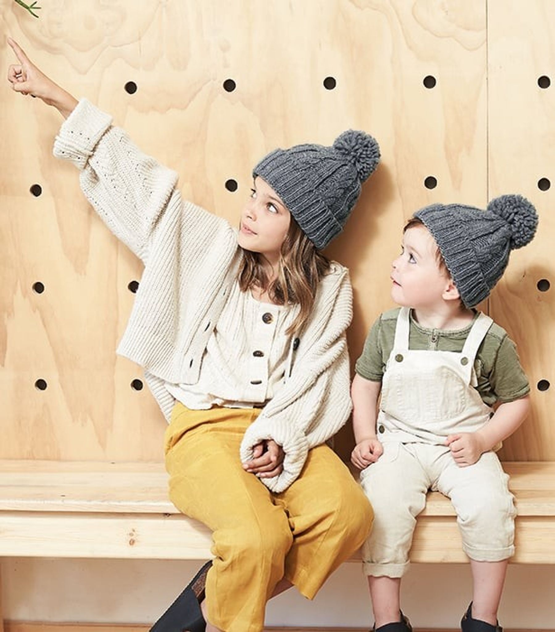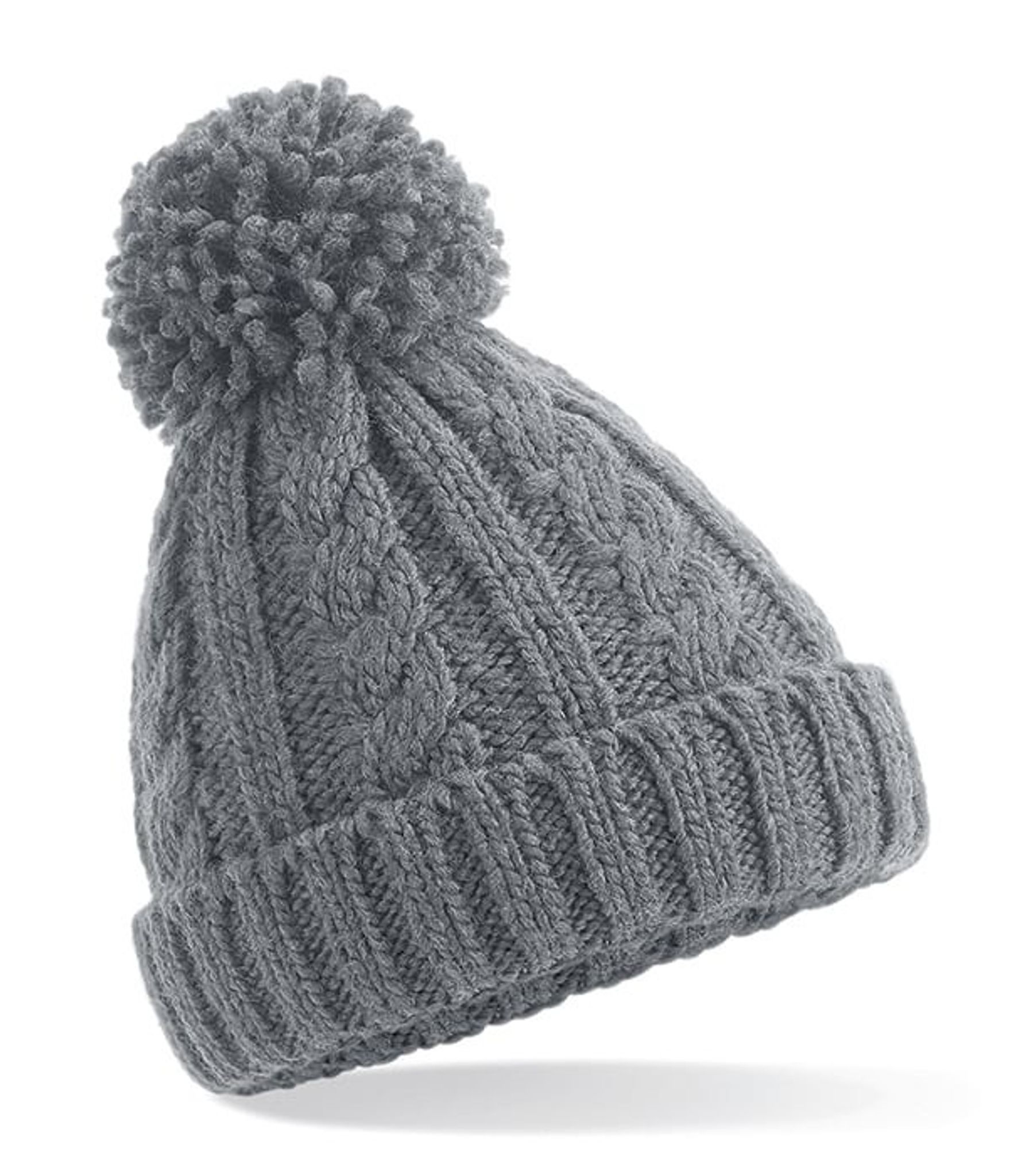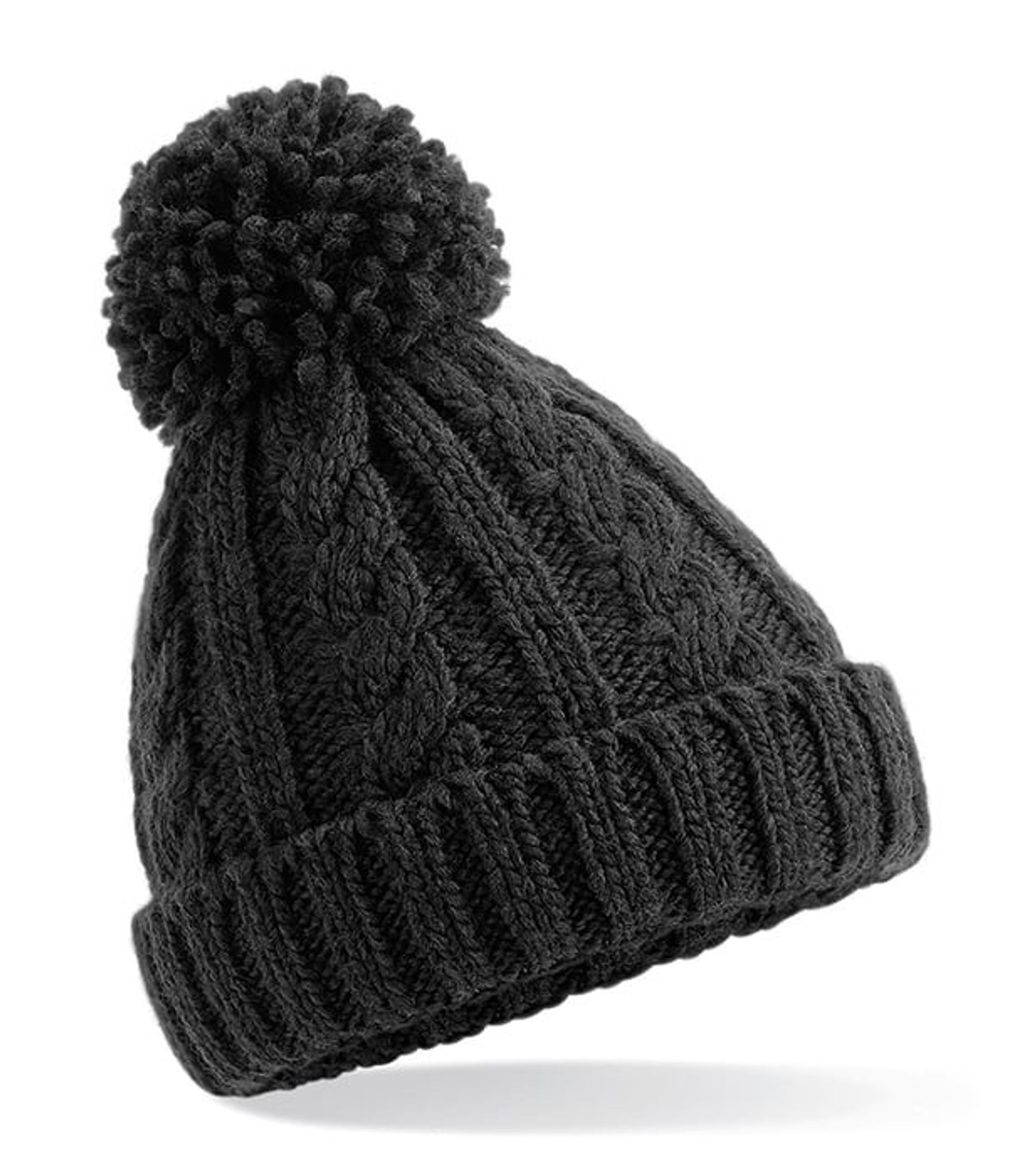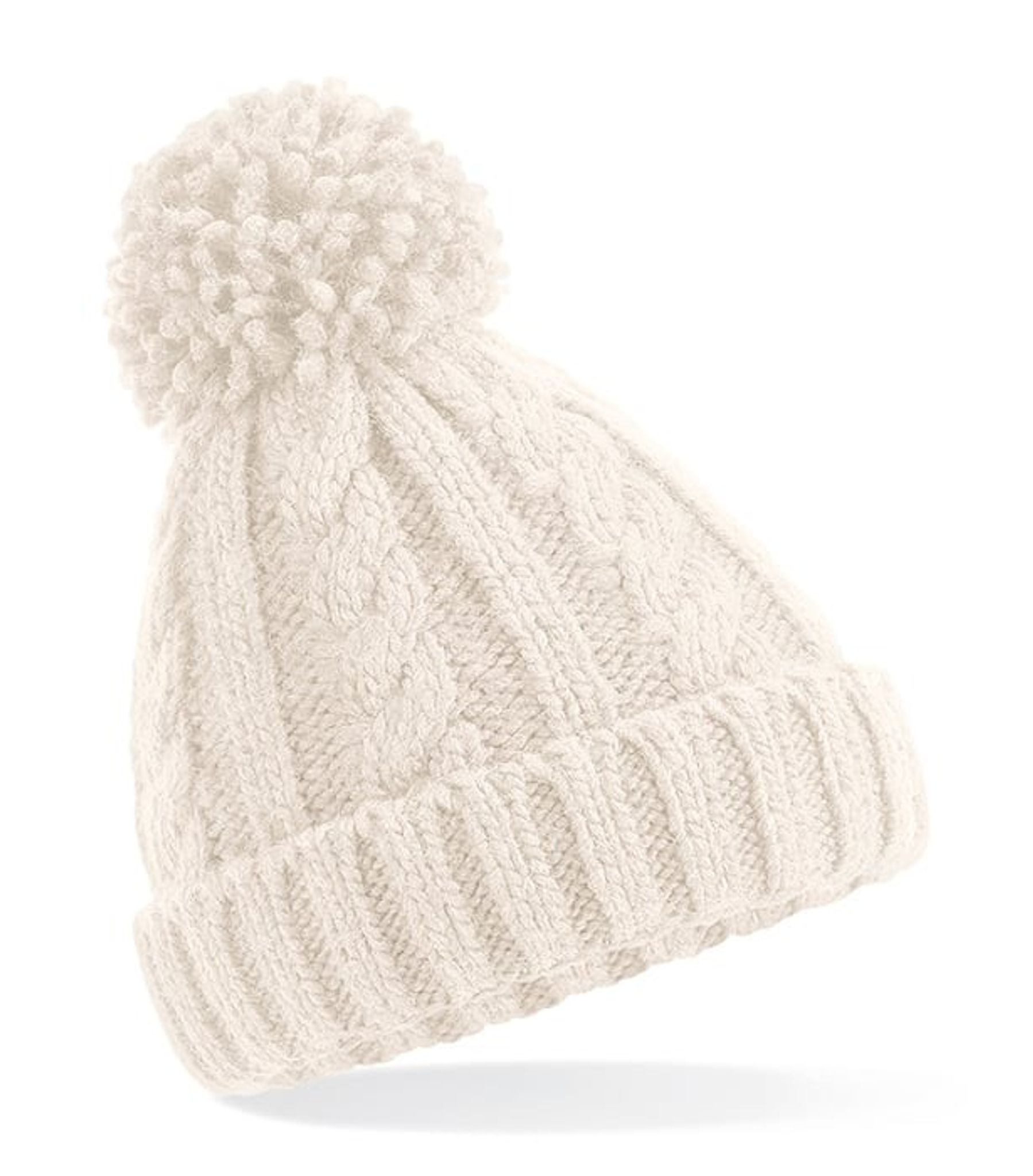 En tæt strik og varm hat med kabelstrikkemønster. Oven på hatten er der en pomponkugle i en matchende farve.