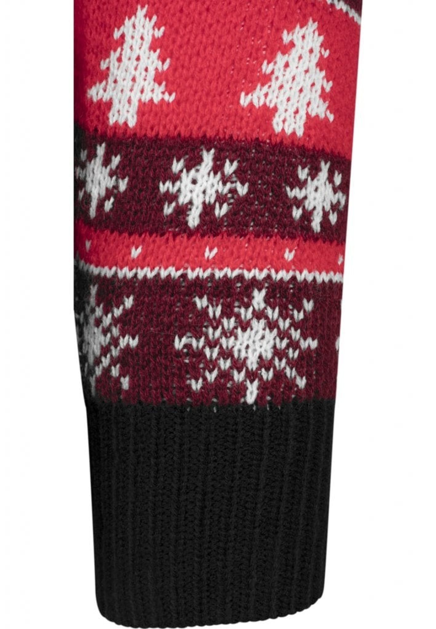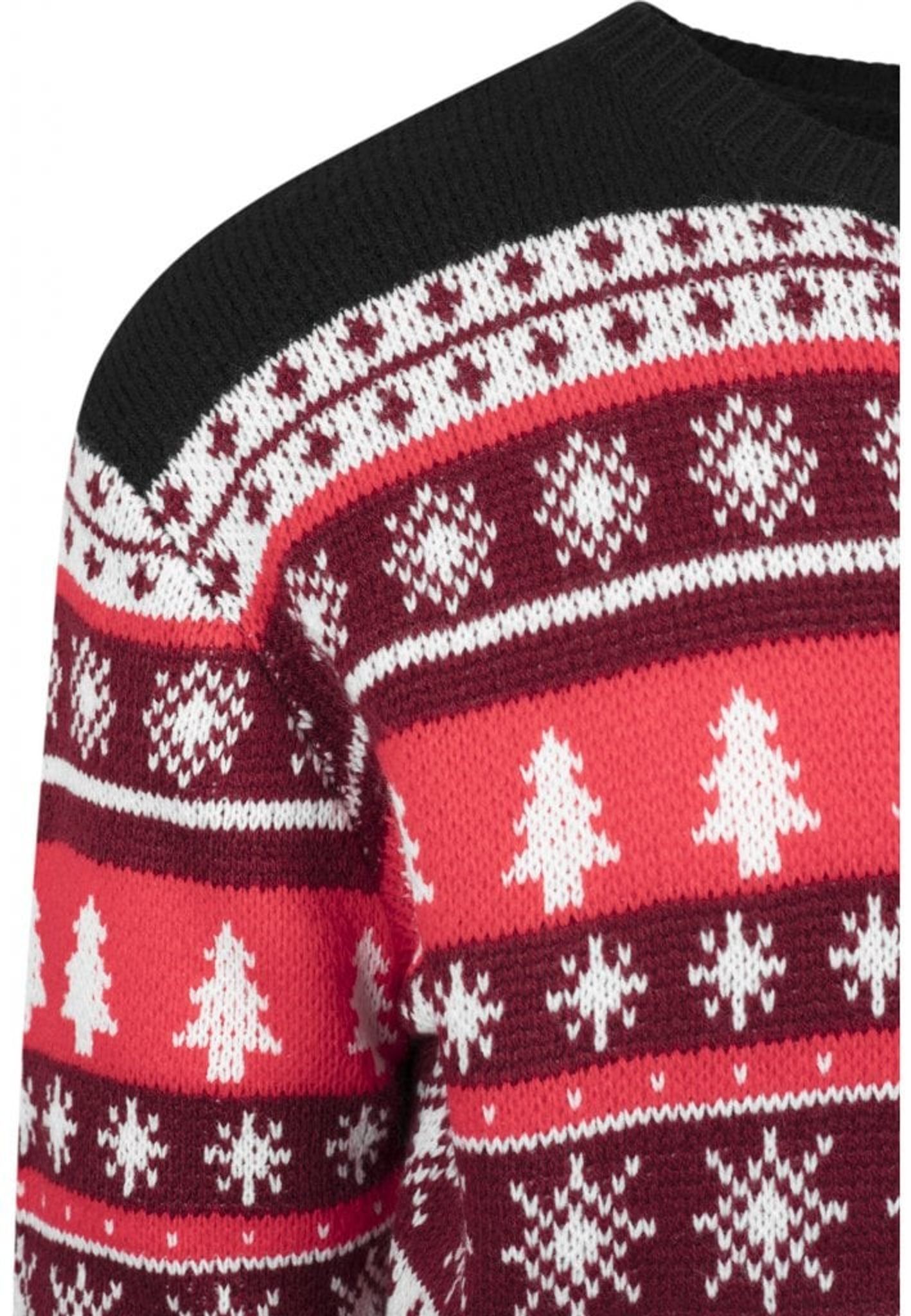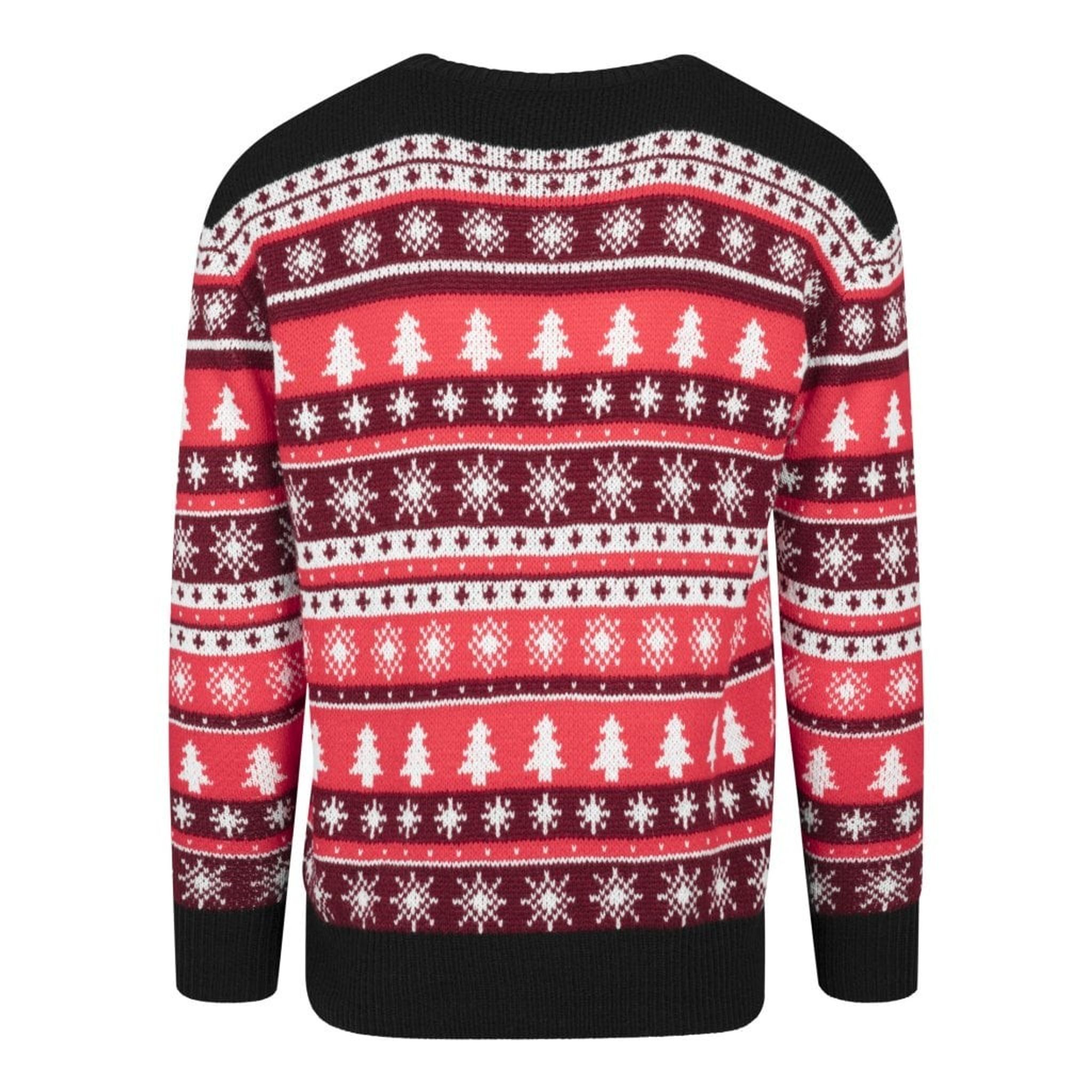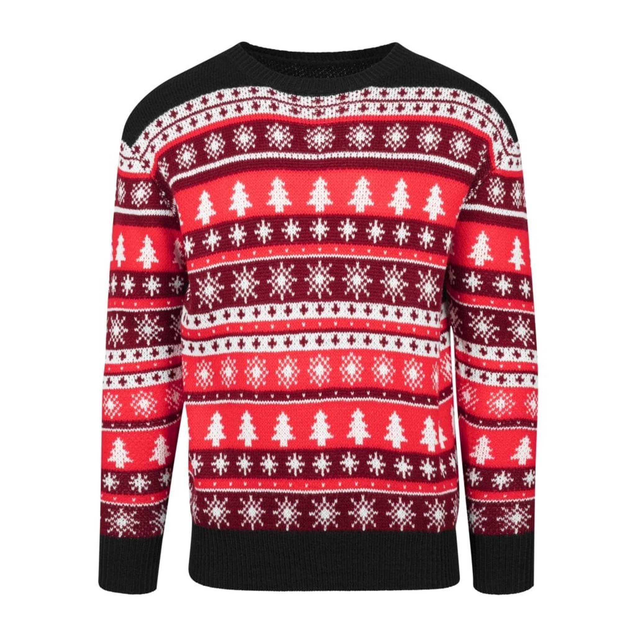 Denne strikkede sweater har et klassisk julemotiv med fyrretræer, stjerner og snefnug.