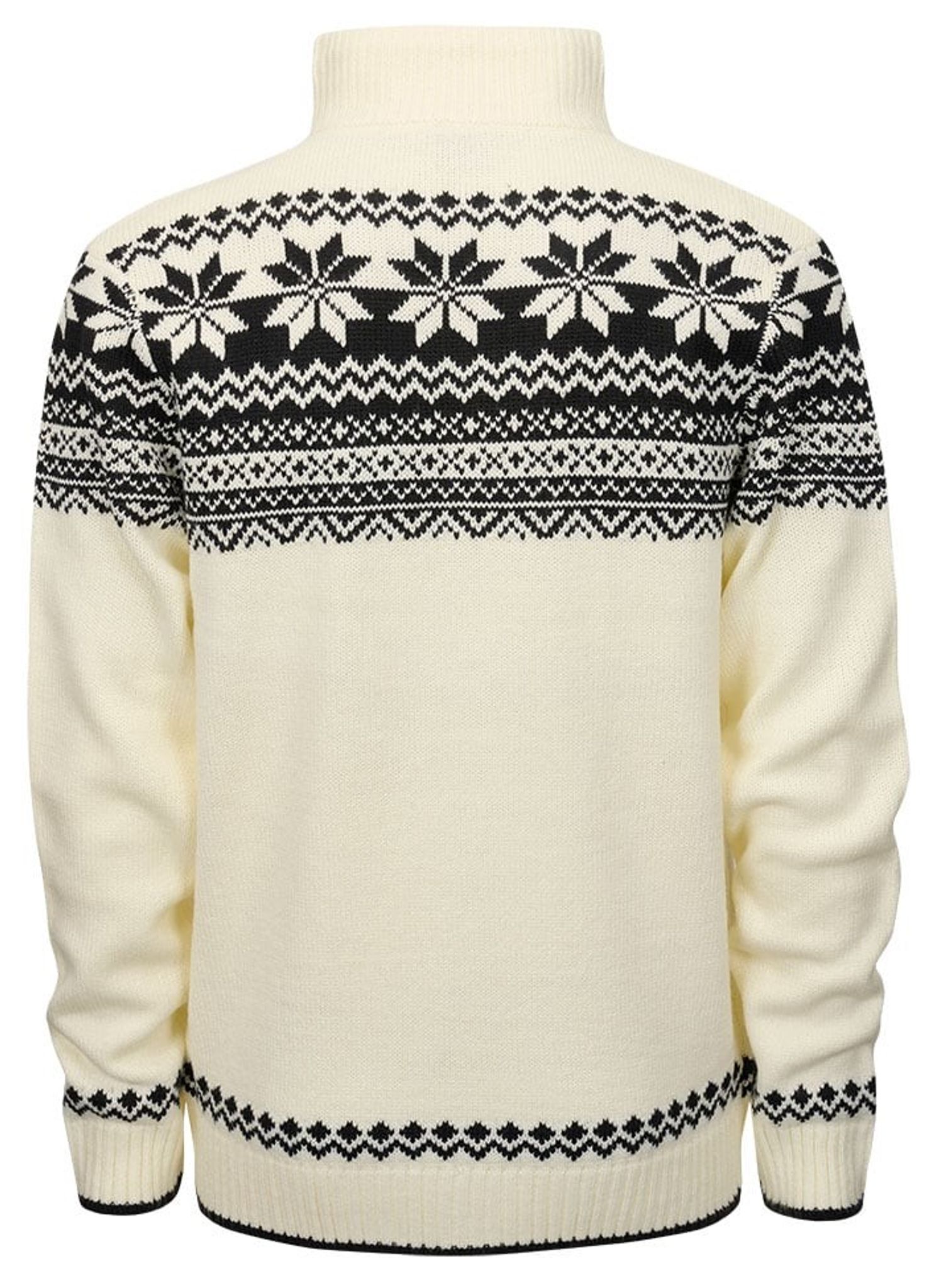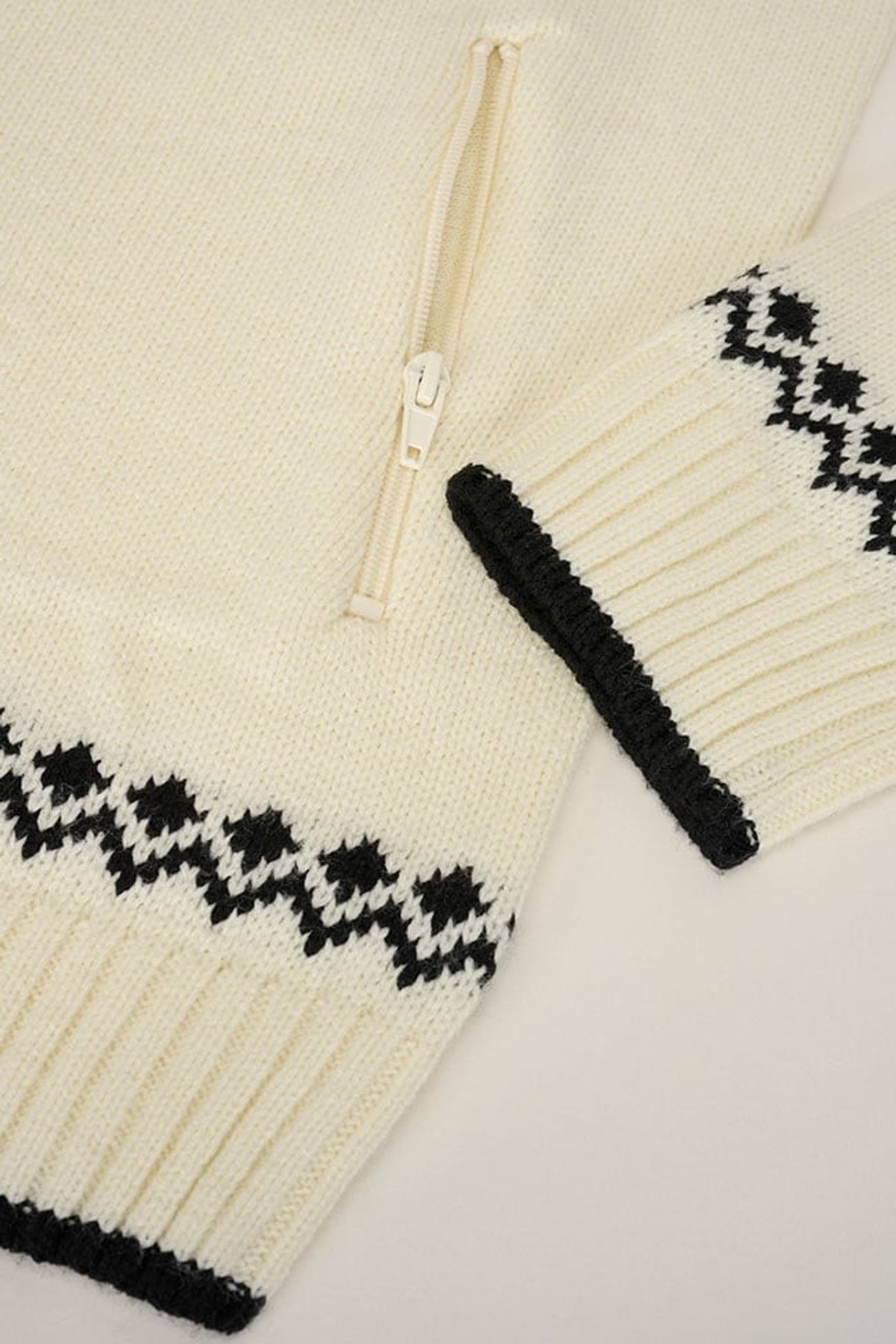 En hvid og sort strikket cardigan med lynlås og et mønster taget fra den klassiske norske Lusek cardigan. Cardiganen har også to sidelommer, som også er udstyret med lynlås.