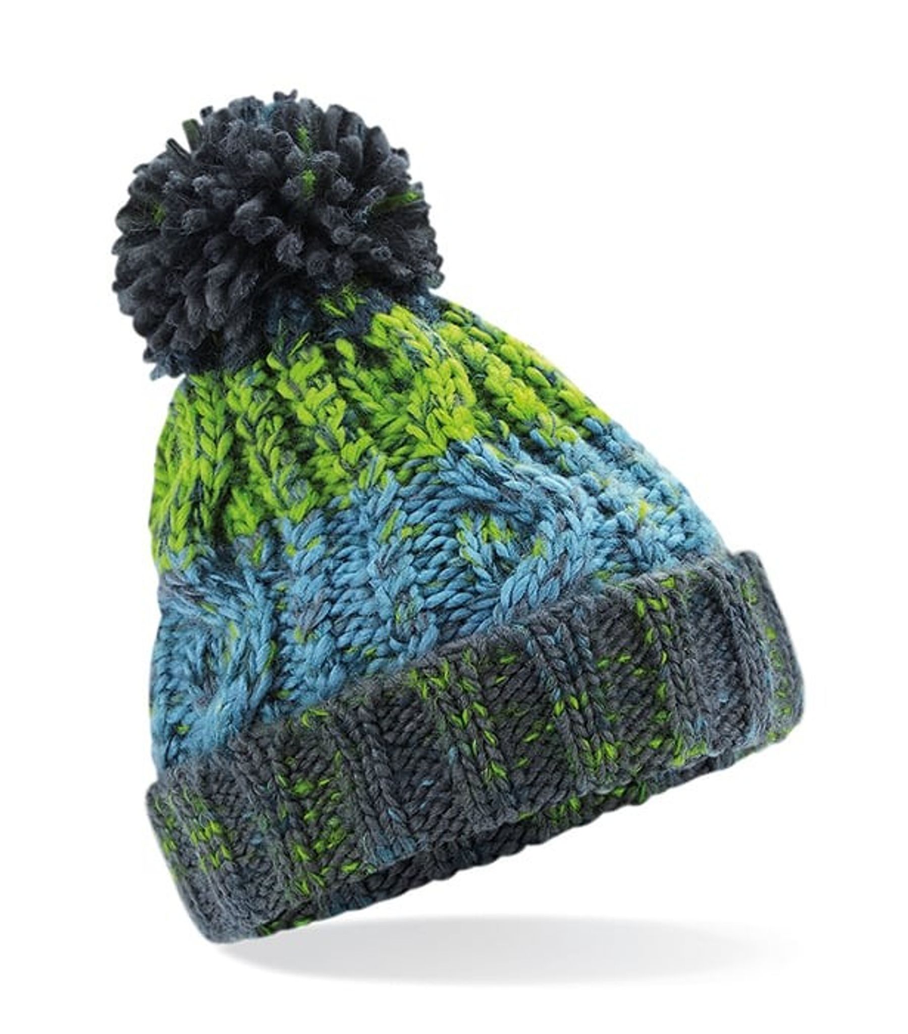 En kabelstrikket hat i tykt varmt garn og en foldet kant. Hatten er også udstyret med en matchende pomponkugle.