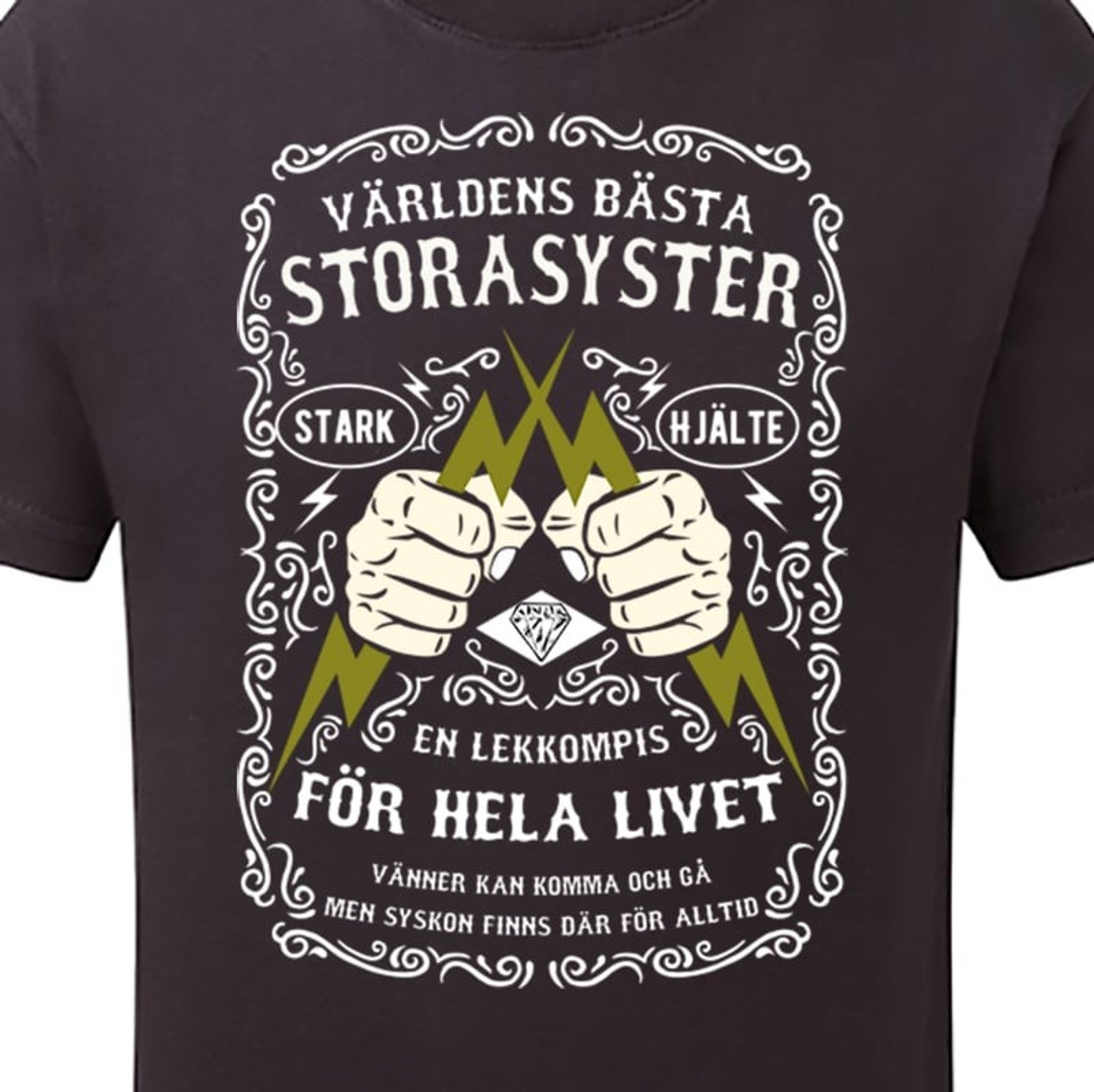 En riktigt fin t-shirt för den starke storasystern. Först den meriterande texten "Världens bästa storasyster" följt av texten "En lekkompis för hela livet. Vänner kan komma och gå men syskon finns där för alltid."
