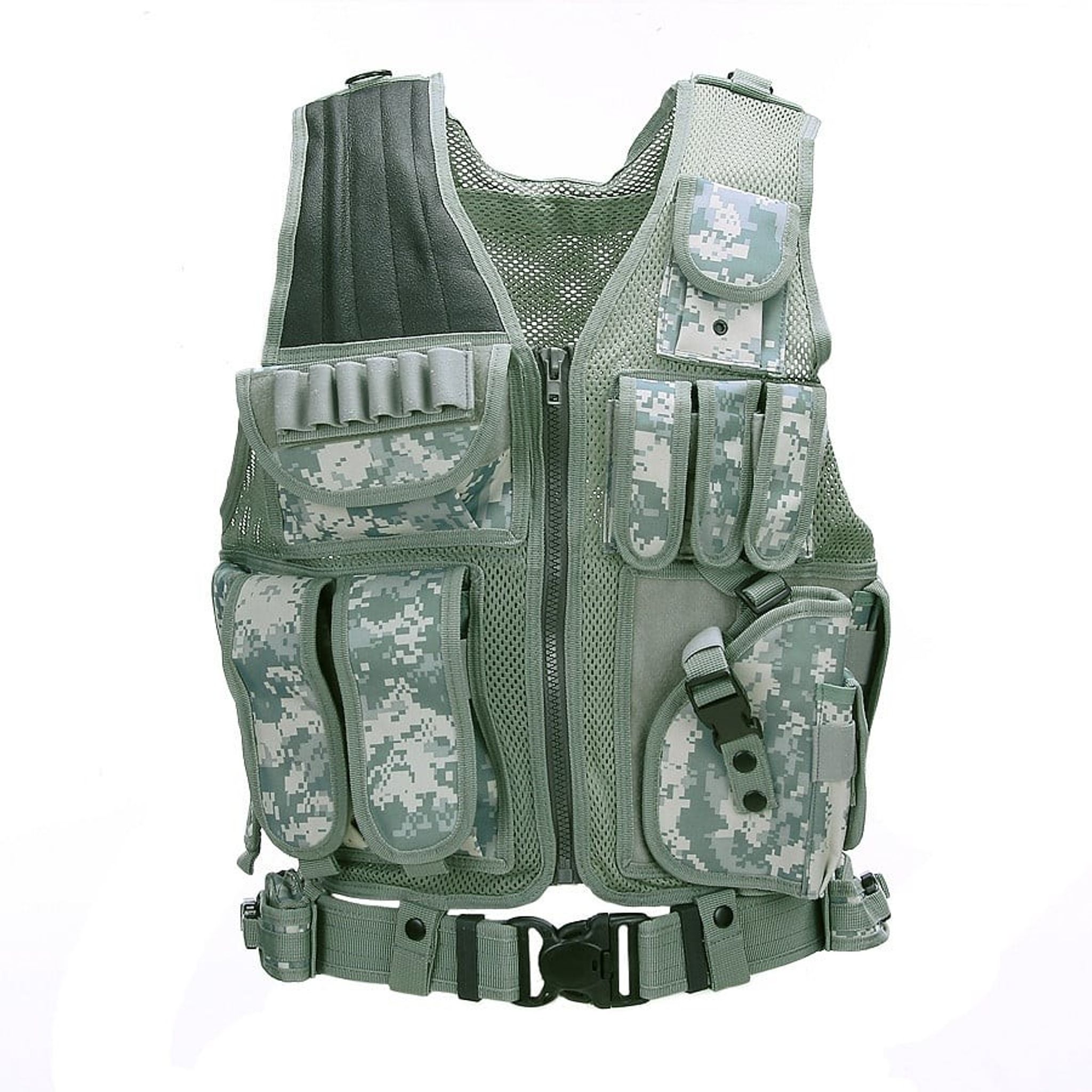 Vesten kommer med et hylster og et bælte, hvilket gør den praktisk til brug i forskellige situationer. Hylstret gør det nemt at bære udstyr, mens bæltet sørger for, at vesten bliver på plads.
