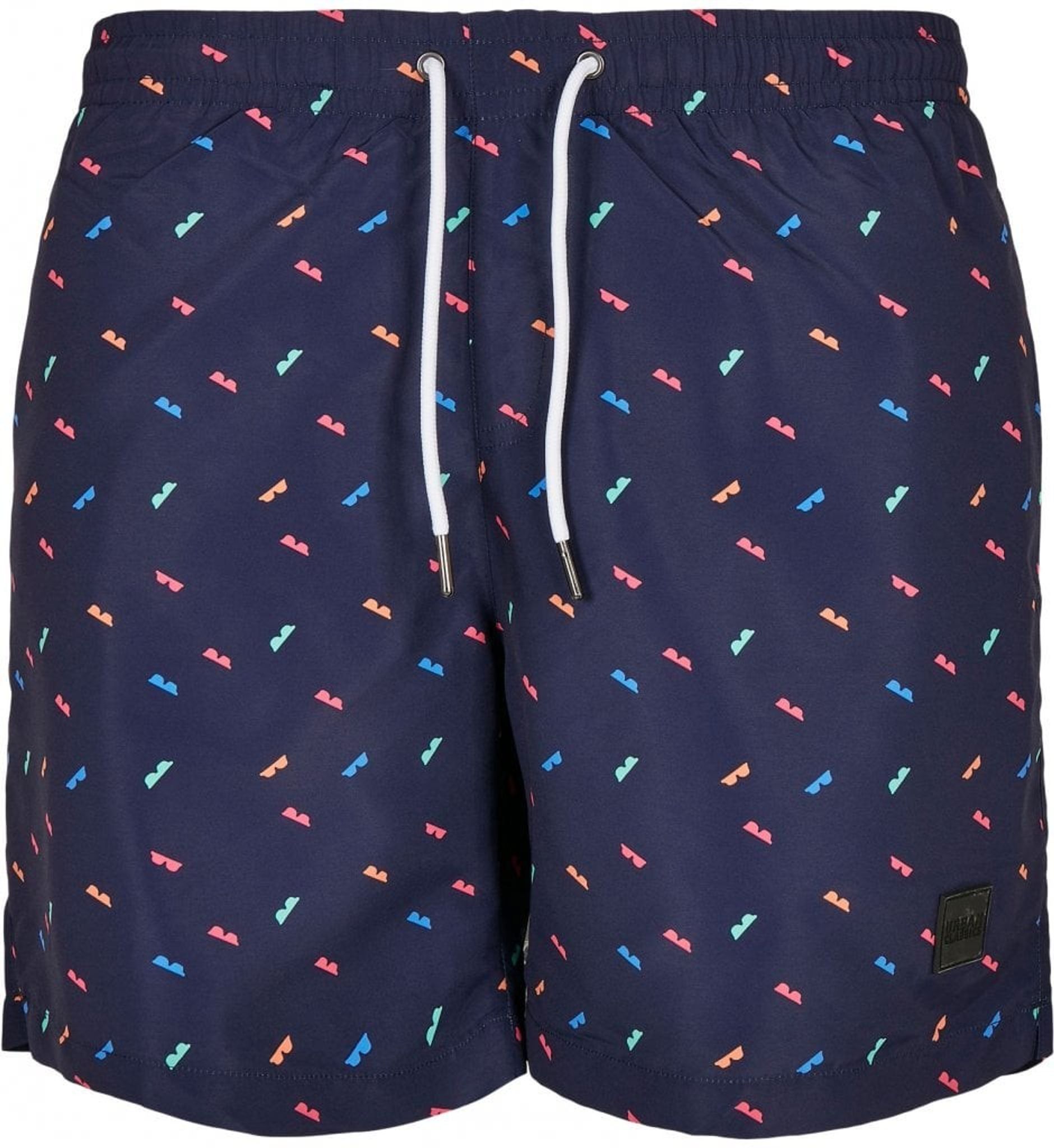 Et par stilfulde svømmeshorts med små farverige solbriller trykt rundt om hele buksen.