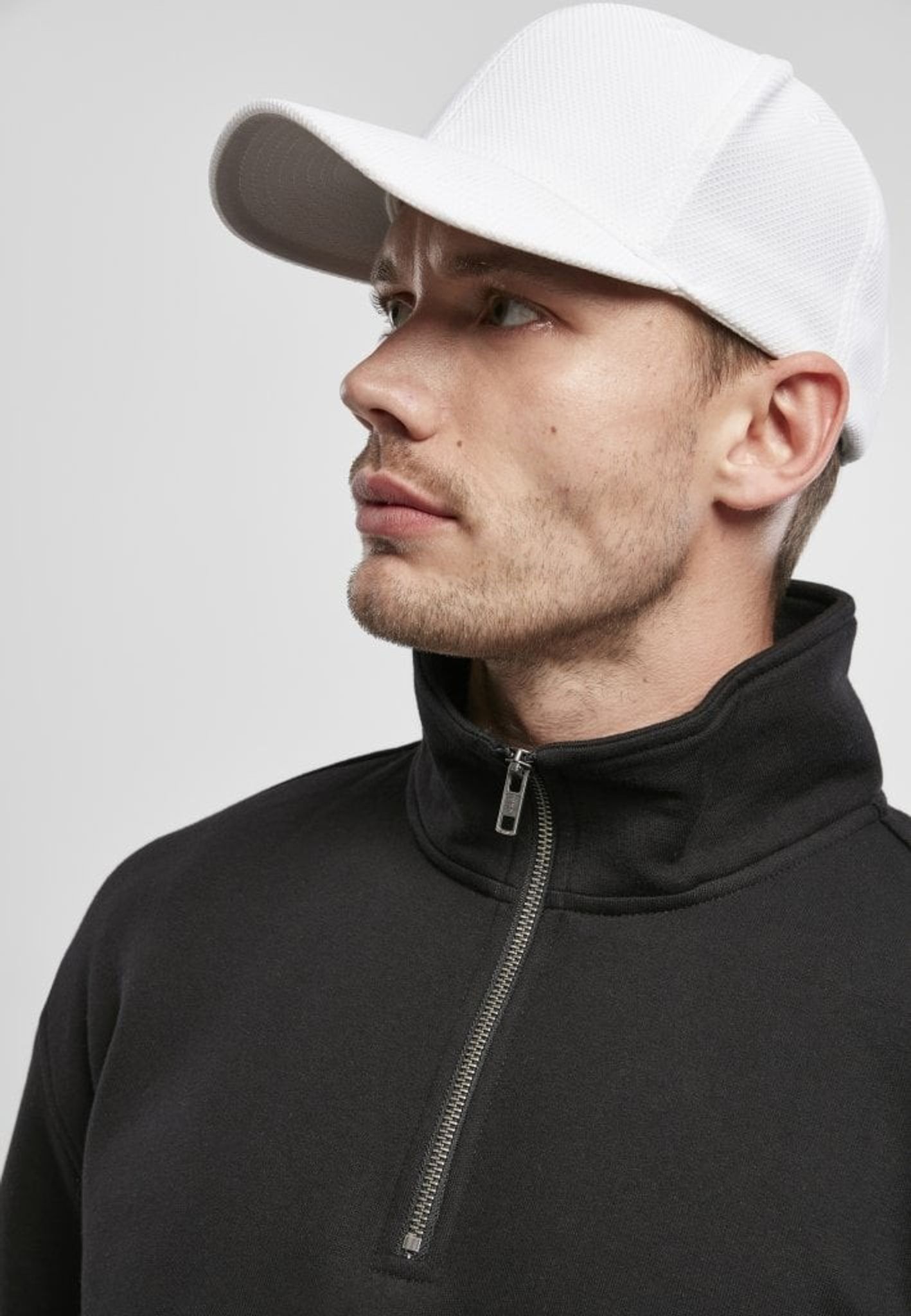 Dette er en klassisk sweater med en kort lynlås ved halsen og en høj krave.