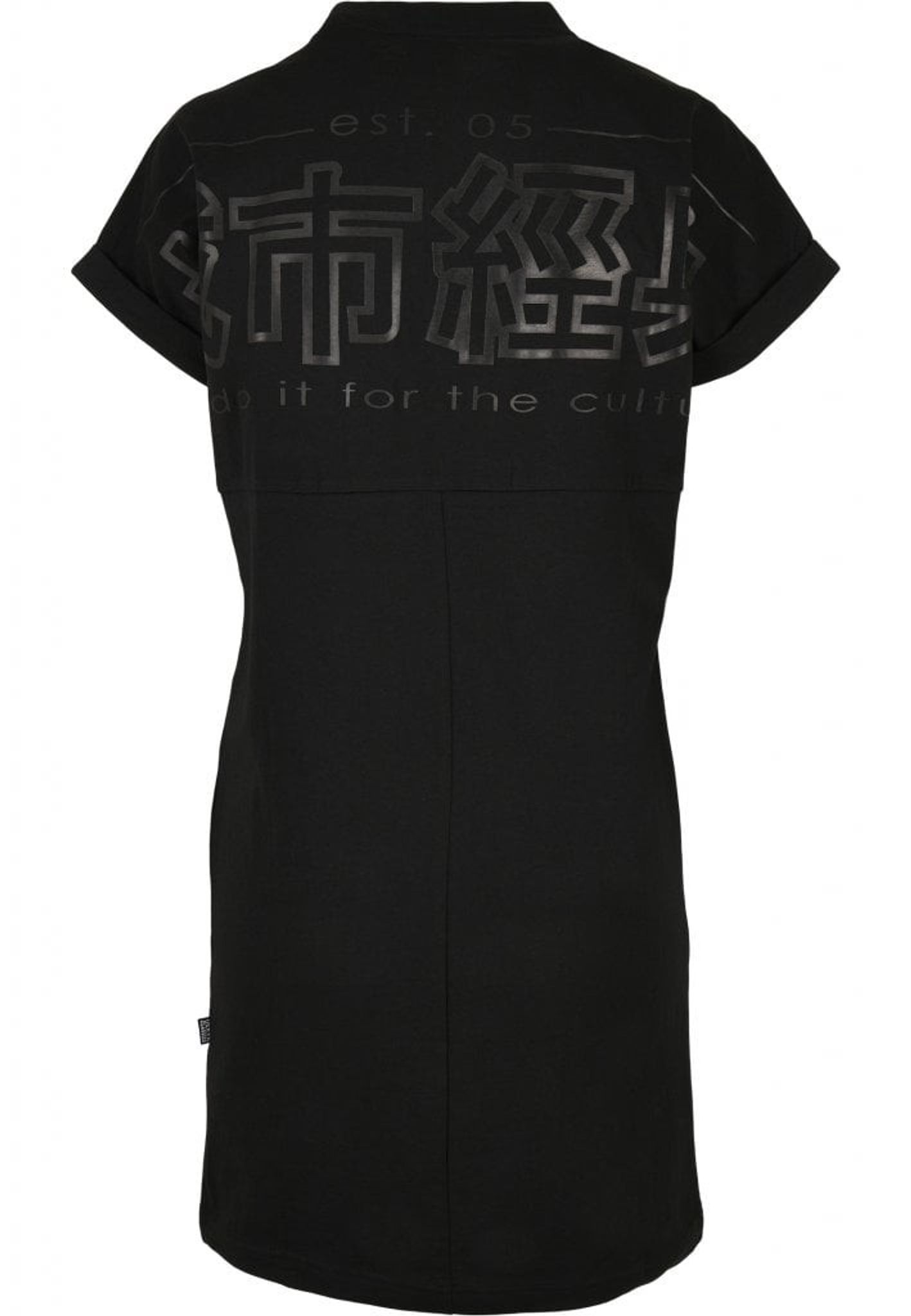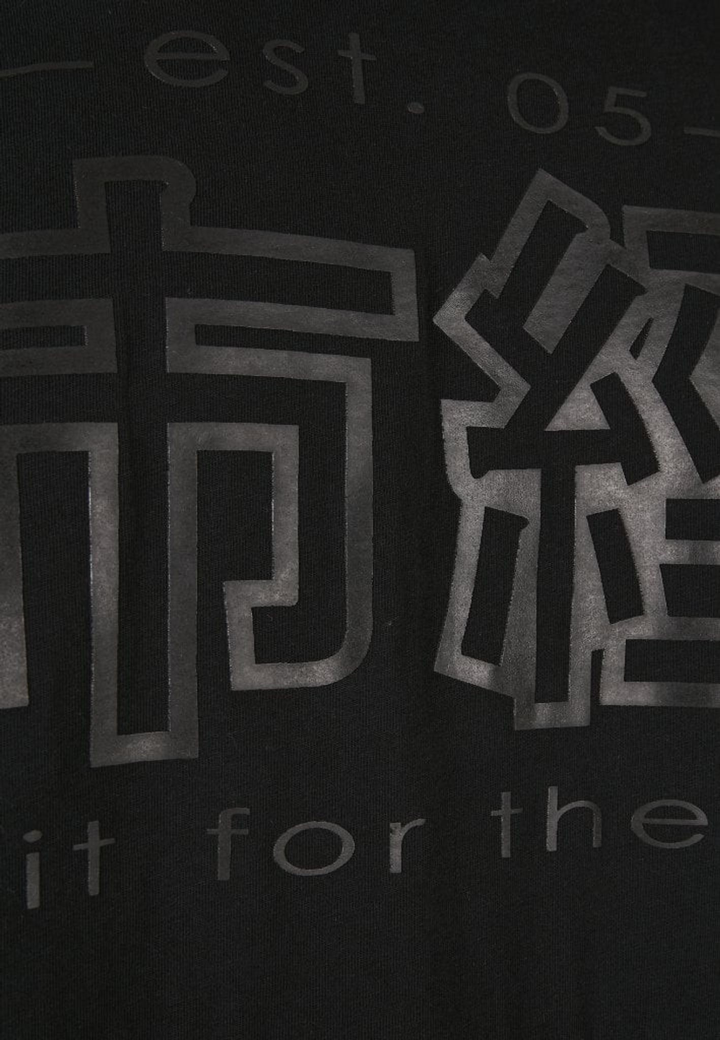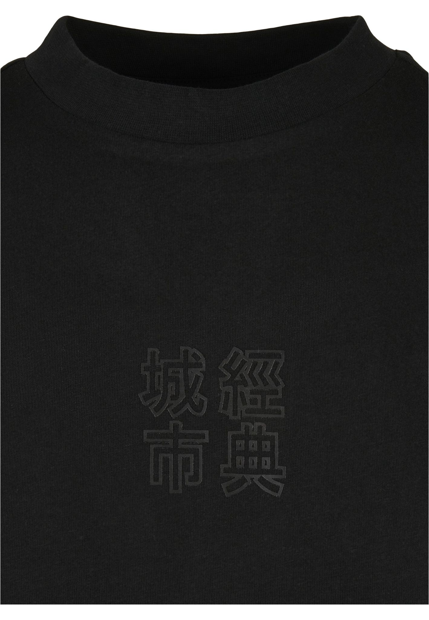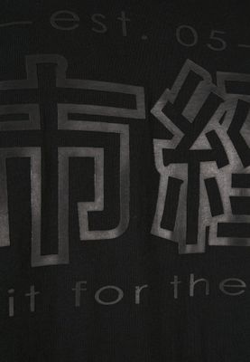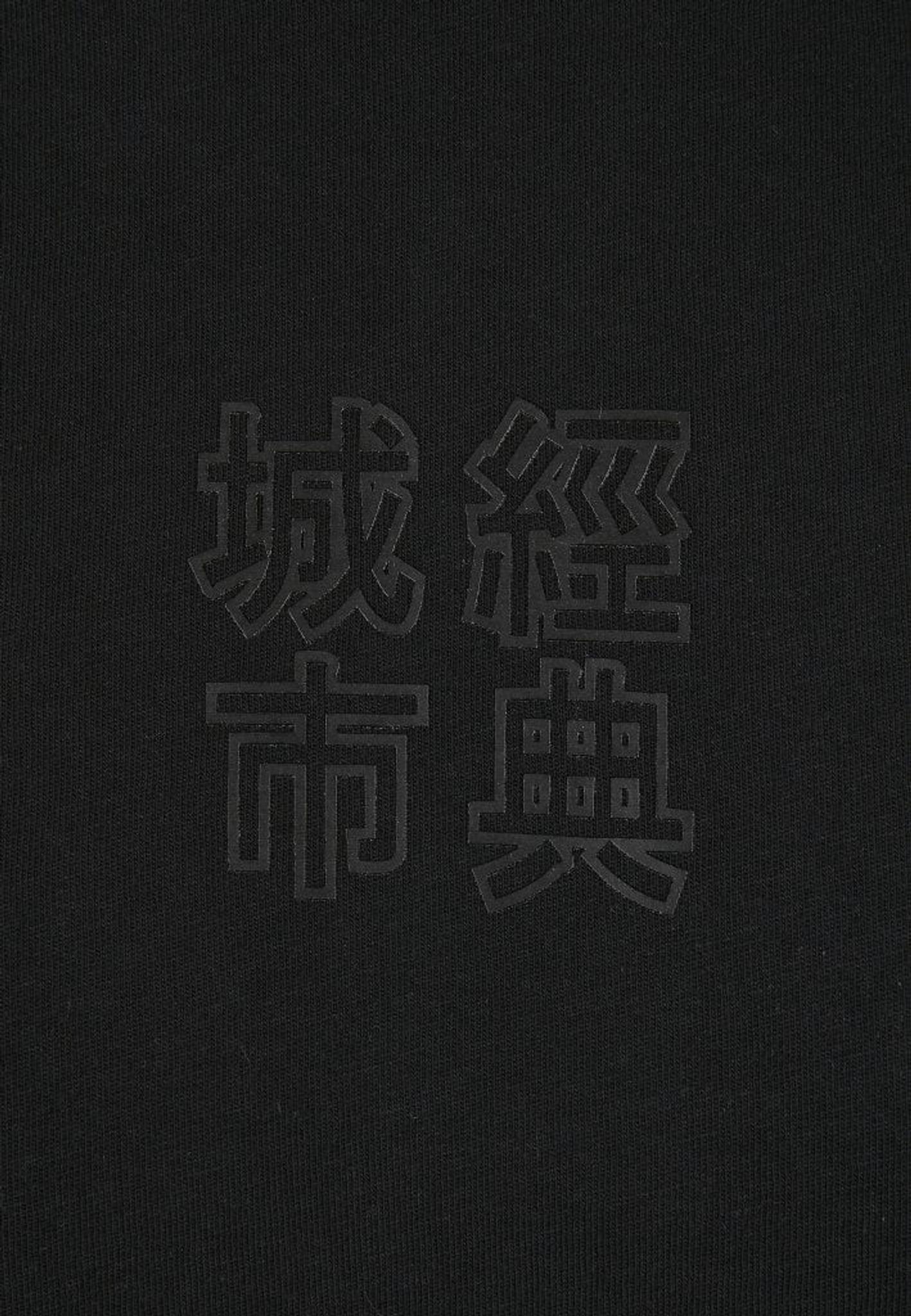 På bagsiden er der store kinesiske bogstaver og i midten af forsiden af brystet er der små bogstaver. Printet er lavet i sort på sort stof, som er elegant.