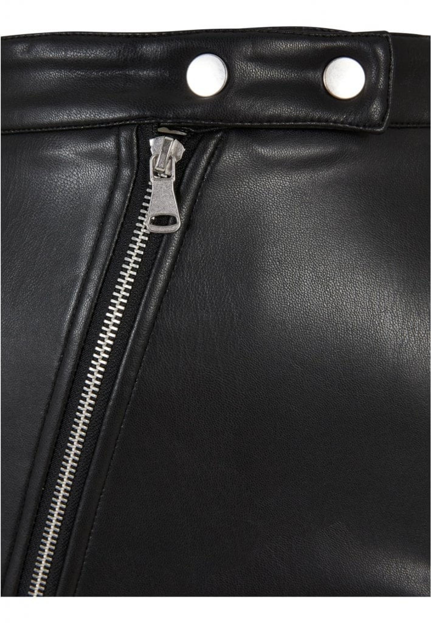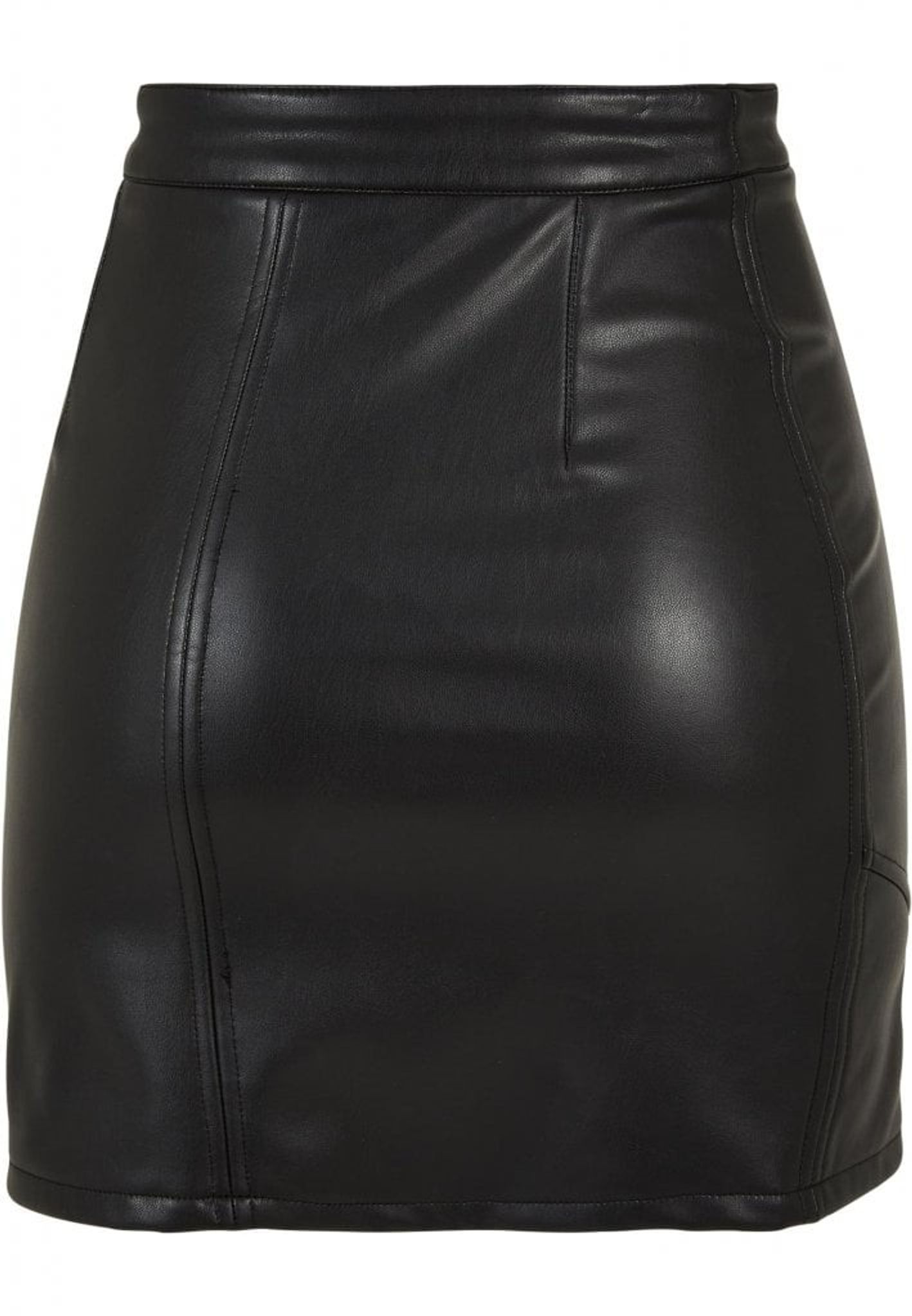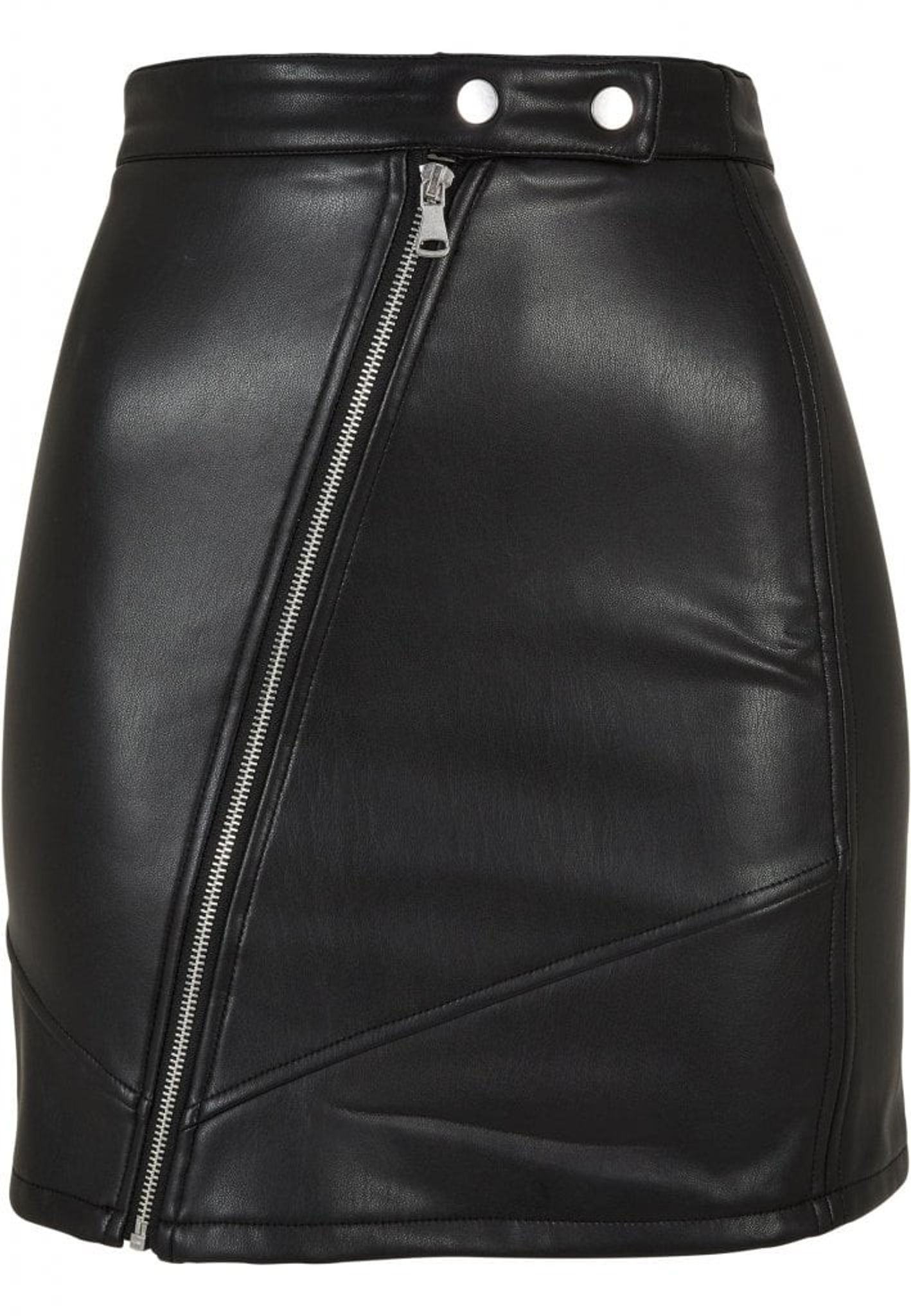En gyngende lædernederdel i sort kunstlæder med lynlås, der brækker nederdelen af foran.