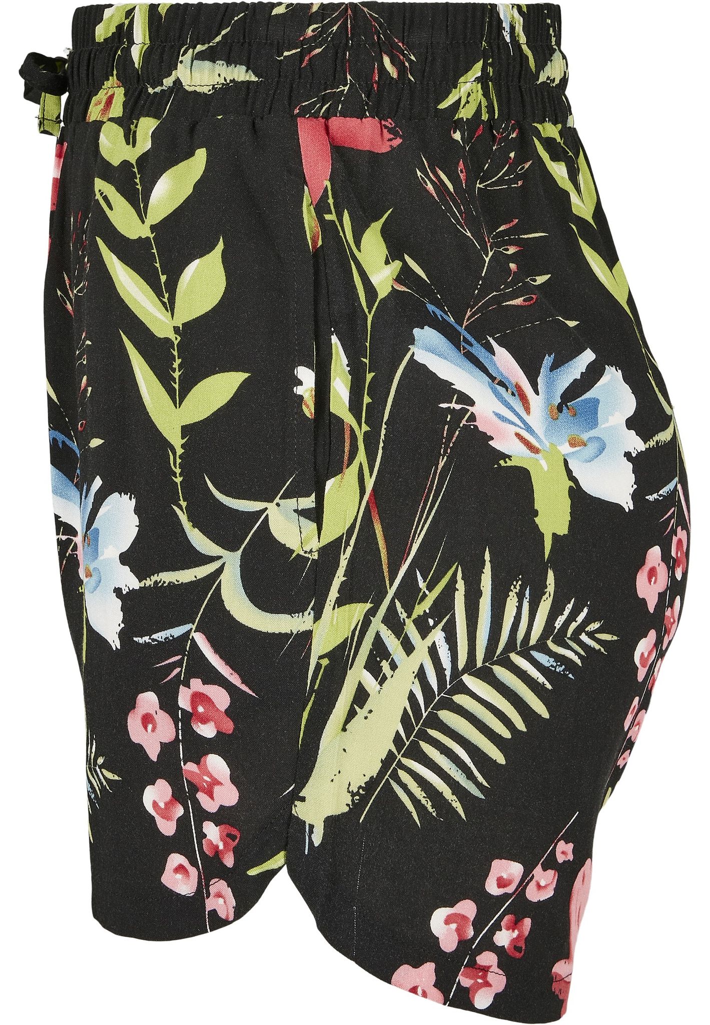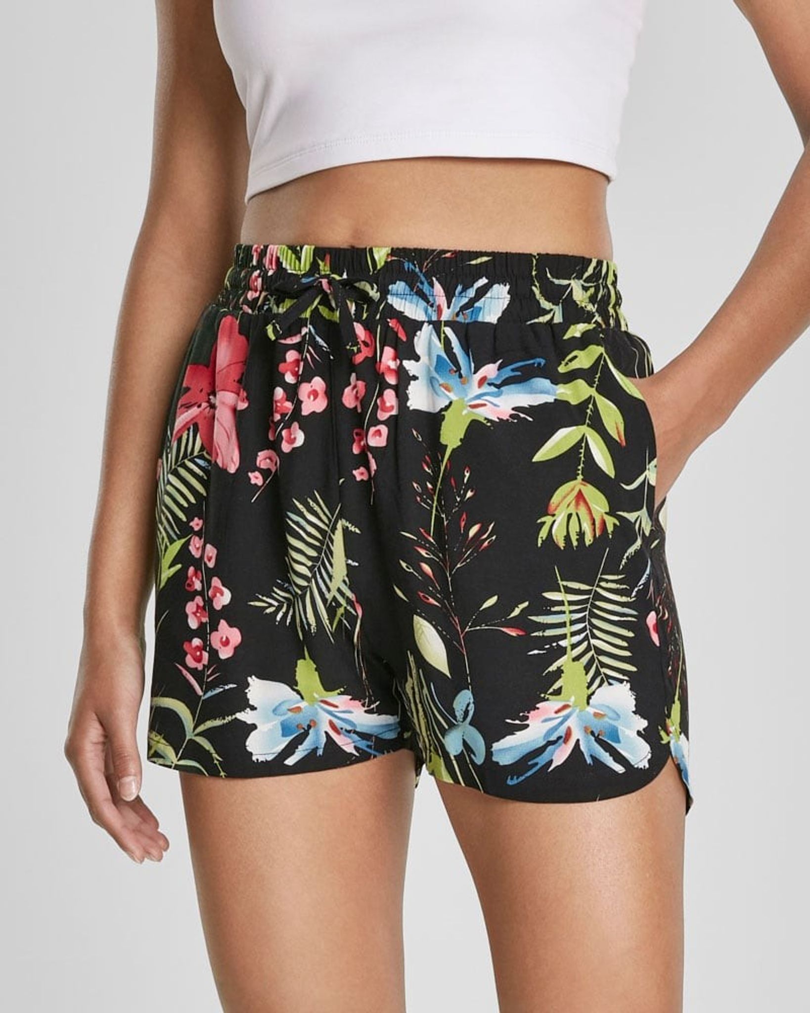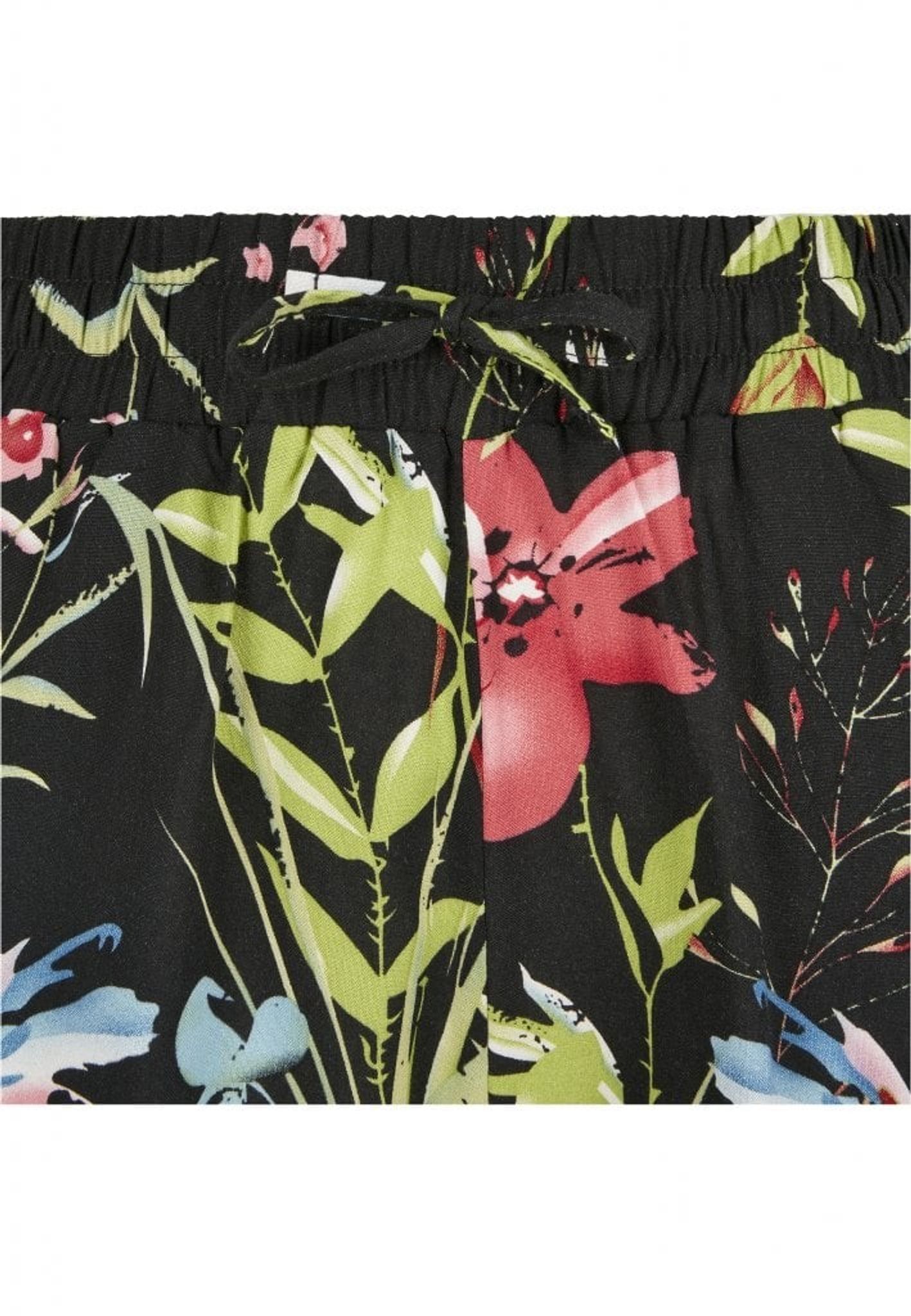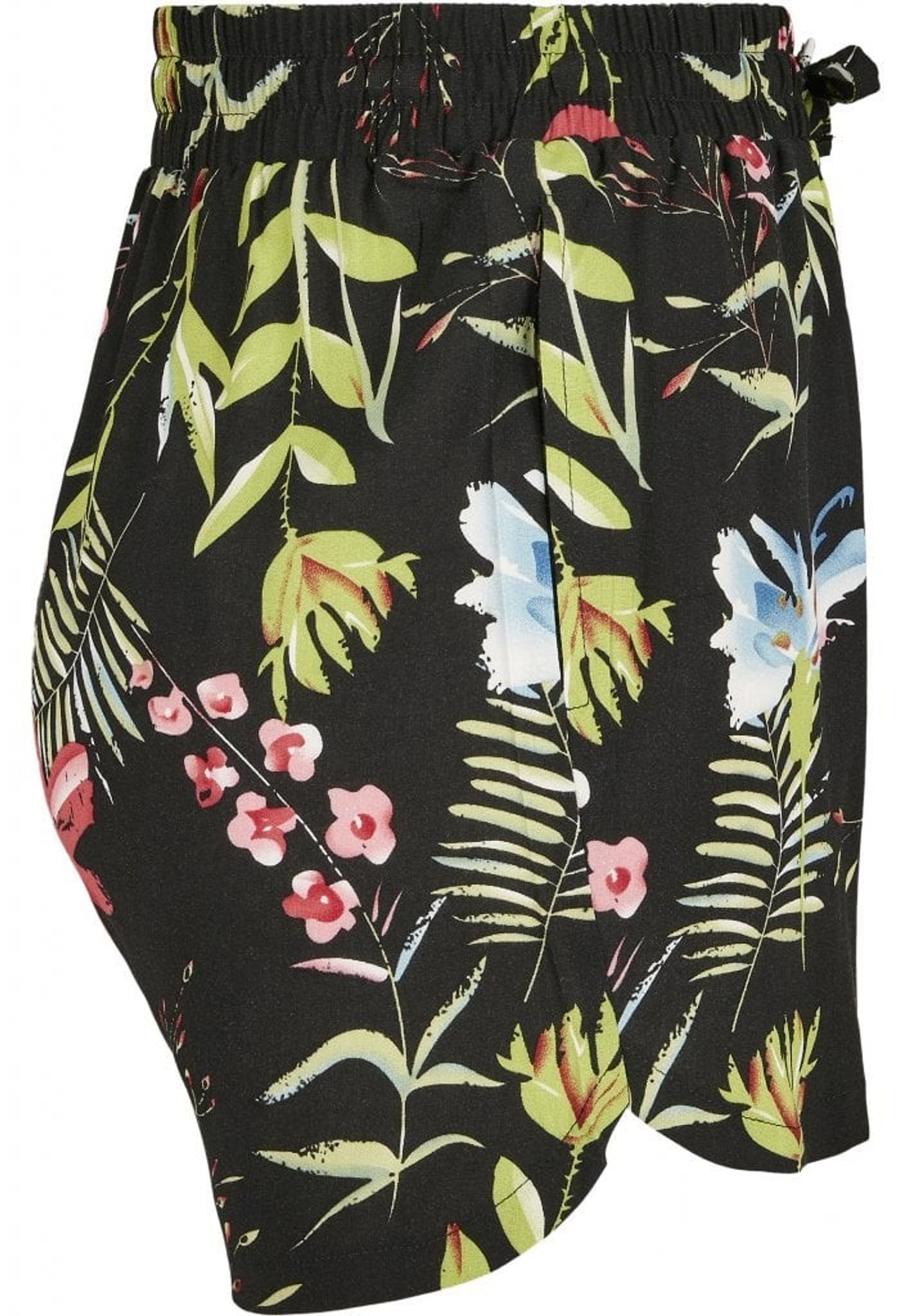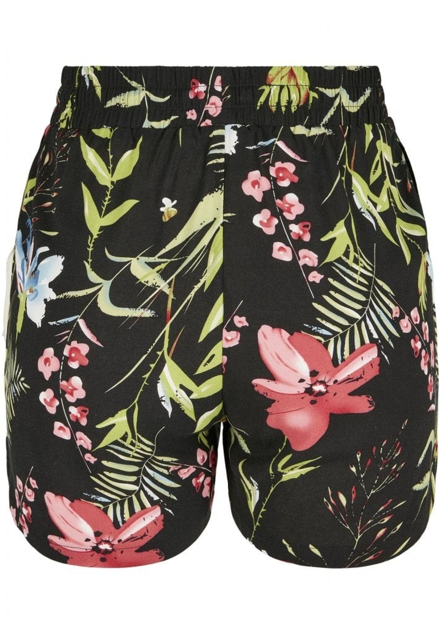 Shortsen har en veste med snor og et mønster af blomster i forskellige farver på en sort bund.