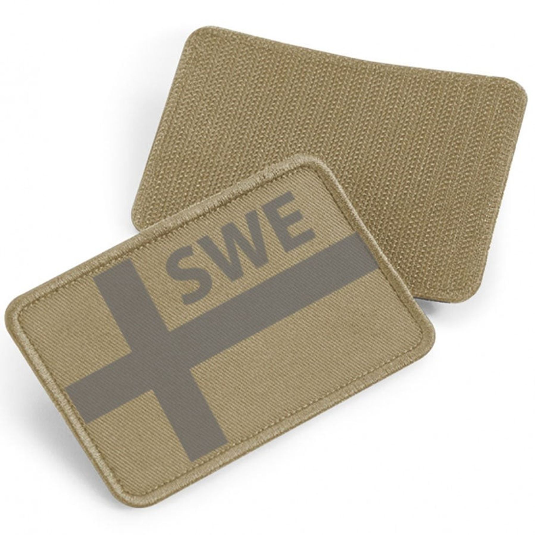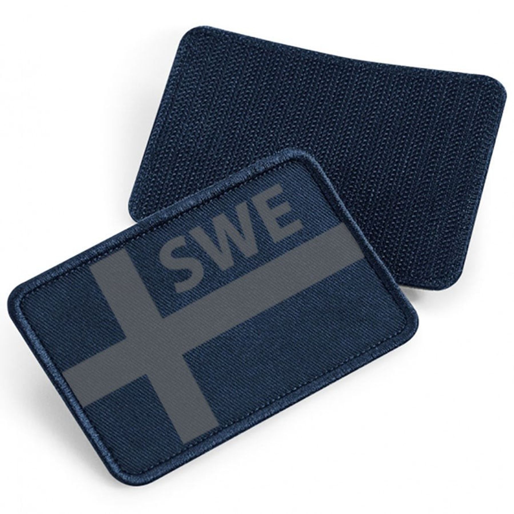 En rigtig fin stoflap med det svenske flag i gråt sammen med teksten SWE i et af flagets vinduer.