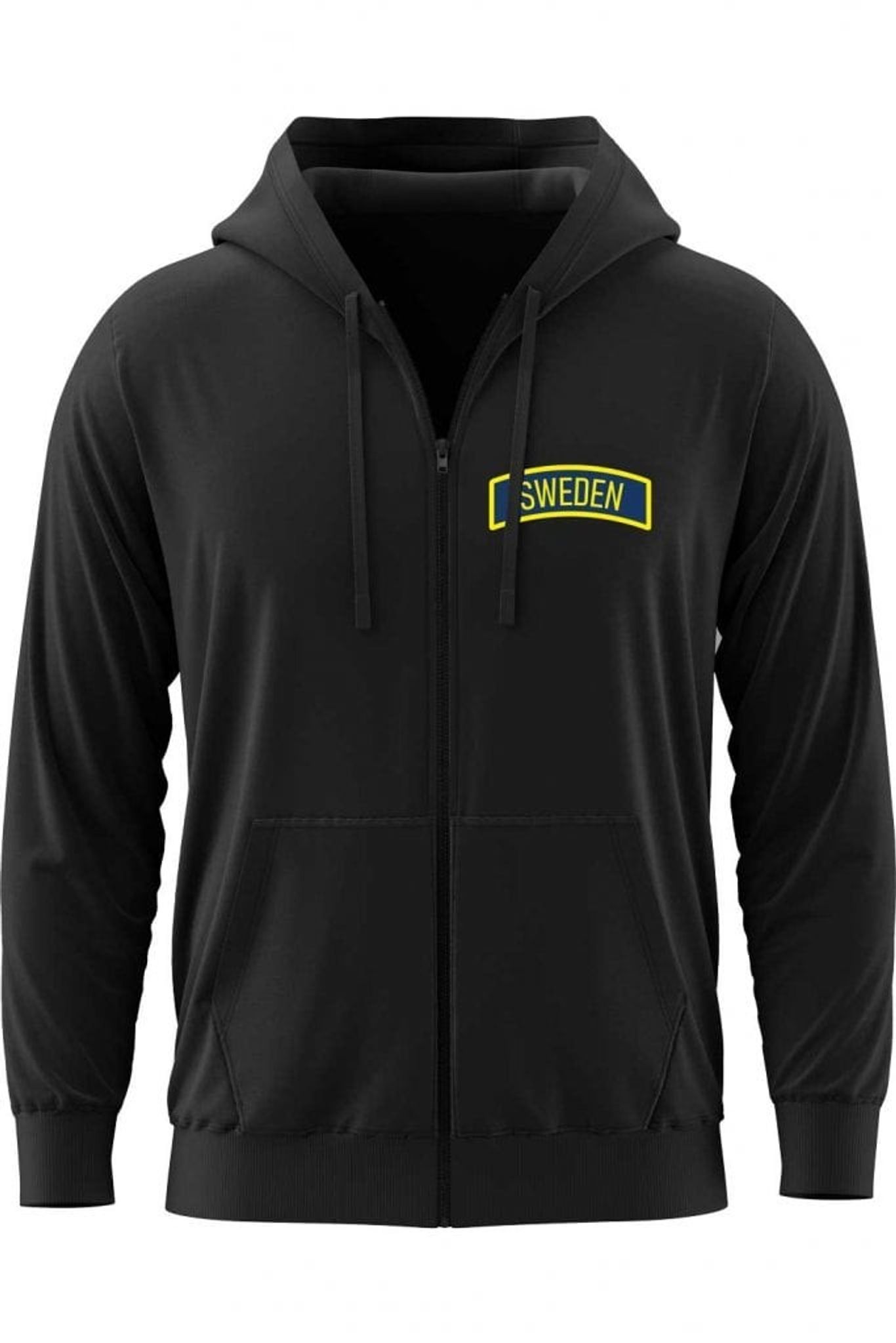 En hættetrøje med lynlås, der kombinerer enkelt design med et tydeligt nationalt symbol. På venstre bryst er et trykt plaster med teksten "SWEDEN", der giver hættetrøjen en diskret, men alligevel karakteristisk karakter. Printet er i en let genkendelig stil, hvor den gule tekst skiller sig ud mod en mørkere baggrund, hvilket skaber en klar kontrast til den sorte hættetrøje.