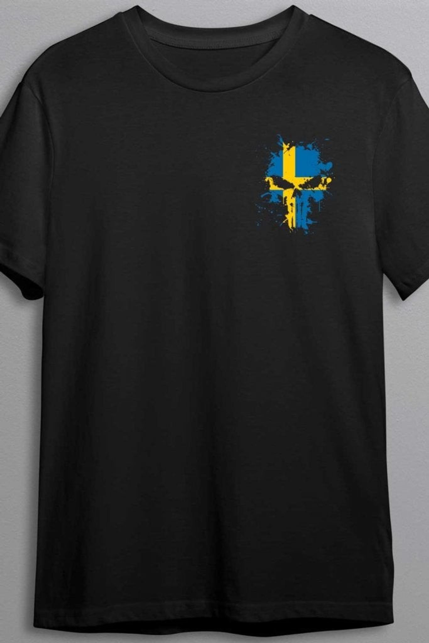 Vis din stolthed med denne unikke t-shirt, der kombinerer det klassiske Punisher-design med de svenske farver! Printet på brystet har en moderne og splashy stil i blåt og gult, hvilket gør det både patriotisk og stilfuldt.